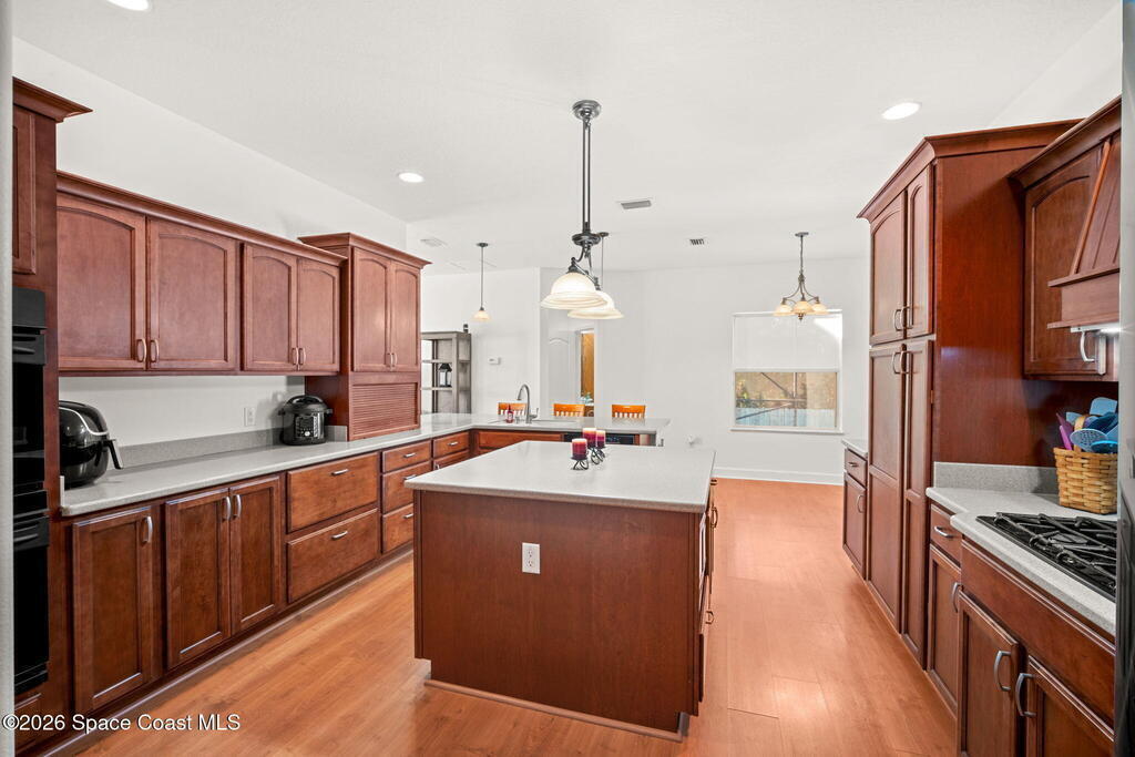 A true gem in Port St John, custom designed by the original owners, and perfect for larger families offering 4-bedrooms and 4-full bathrooms, 9 foot 4'' ceilings throughout the entire home, plus a screened-in pool. Beautiful, gourmet, kitchen centered in the home offering solid maple cabinetry, multiple pantries, pull out drawers, gas cook top, double wall ovens, breakfast bar that easily seats 6 people, and newer appliances. The master en suite offers two large walk-in closets, an additional study/den/or huge future walk-in closet, shower, and garden tub. On the back patio you will find the spacious chlorine pool that can be converted back to a salt system, fully trussed back porch, additional storage, and is fully screened-in to enjoy the Florida weather year round. Impact doors and windows, 2023 Roof, Gutters 2023, 2024 Exterior Paint, 2018 AC with 4-zones, forced air heating, and new 2025 UV light system, 2021 Water Heater with hot water re circulation.