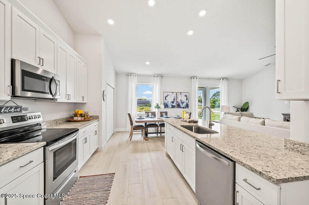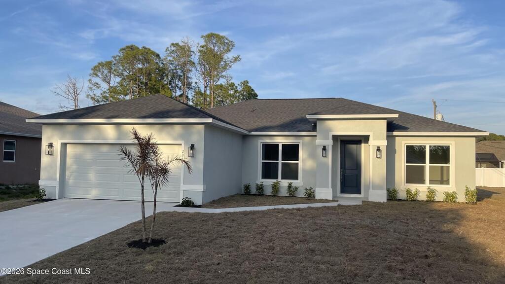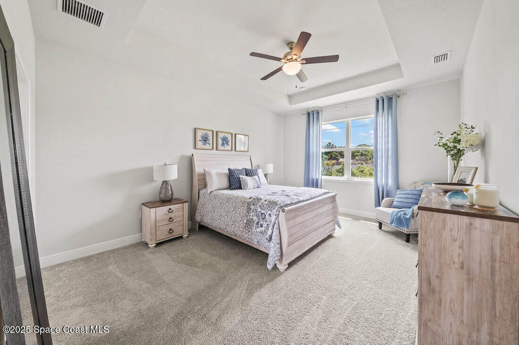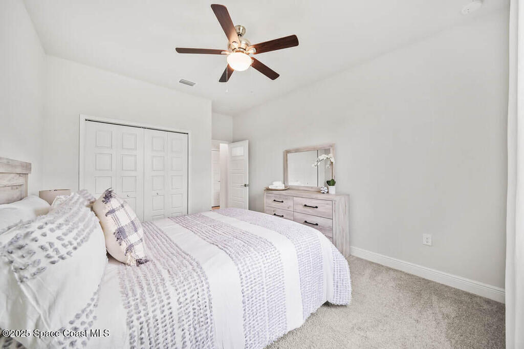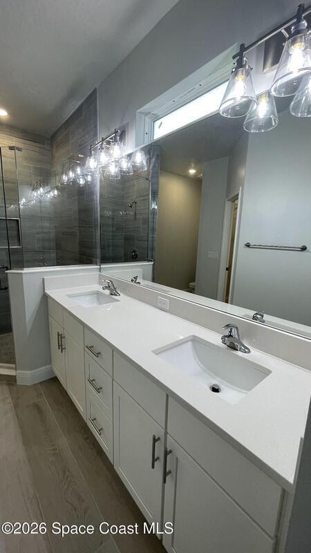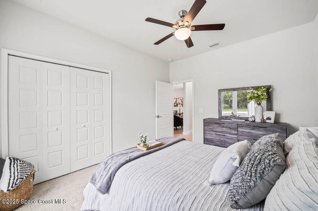 Brand New Energy Efficient Home with Full Warranty! Beautiful upgrades throughout! Located in Peaceful Unit 46 of Palm Bay. The quality offered in this home is second to none. Carefully designed features include an Open plan concept with high vaulted ceiling in the main living areas, the kitchen is a dream w/ high quality wood 42'' upper cabinets with crown molding and decorative handles, beautiful quartz countertops, designer faucet & single basin sink. Equipped with quality stainless steel appliances and a large double door pantry. This 4 bedroom home offers a split bedroom design with plush carpet in all bedrooms & ceiling fans with remotes. The main living area offers Upgraded 9' * 47' hardwood plank porcelain tile. The owners suite has a tray ceiling and beautiful bathroom with double sinks, granite countertops, large tile walk in shower with seamless glass door and a large walk in closet. Other top features:Hurricane Shutters.
