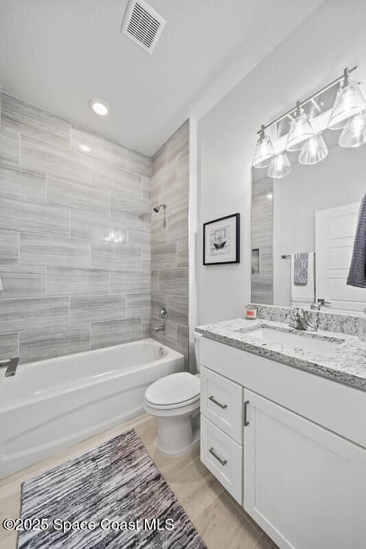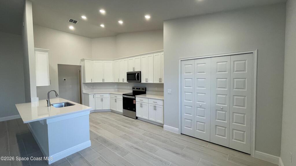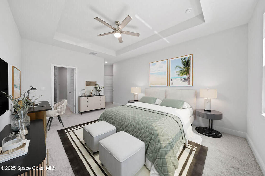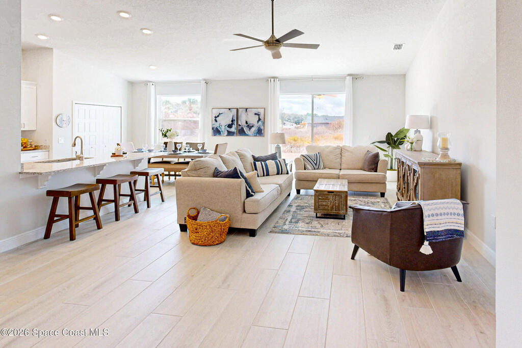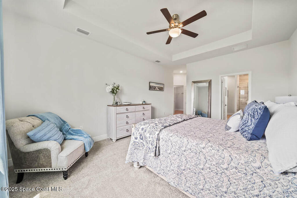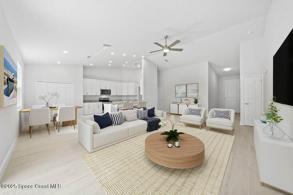 Brand New Energy Efficient Home with Full Warranty! Beautiful upgrades throughout! Located in Peaceful Unit 46 of Palm Bay. The quality offered in this home is second to none. Carefully designed features include an Open plan concept with high vaulted ceiling in the main living areas, the kitchen is a dream w/ high quality wood 42'' upper cabinets with crown molding and decorative handles, beautiful quartz countertops, designer faucet & single basin sink. Equipped with quality stainless steel appliances and a large double door pantry. This 4 bedroom home offers a split bedroom design with plush carpet in all bedrooms & ceiling fans with remotes. The main living area offers Upgraded 9' * 47' hardwood plank porcelain tile. The owners suite has a tray ceiling and beautiful bathroom with double sinks, granite countertops, large tile walk in shower with seamless glass door and a large walk in closet. Other top features:Hurricane Shutters.