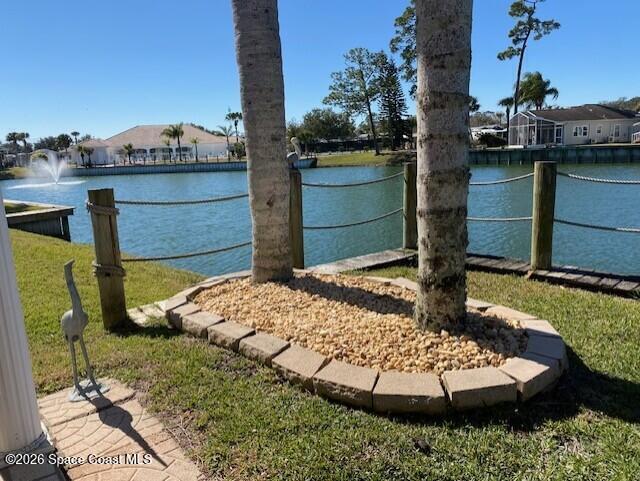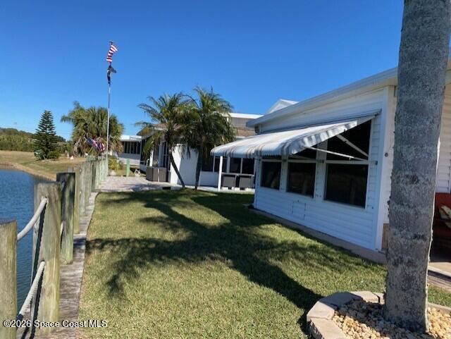 This custom built resort home has everything you want to enjoy seasonally or year round. Relaxing views of the lake and fountains from the living room or covered patio and room to park an RV or conversion van next to your home. Bright and airy inside with large primary bedroom and walk in closet with new washer/dryer and refrigerator. Two mini split units keep the home warm and cool as needed. Bulkhead by water was an upgrade by owners. This active 55+ community is motorcycle friendly and is located in North Brevard County near to airports, theme parks, shopping, beaches and restaurants. Enjoy the heated pool, clubhouse, pickleball, tennis and there is an executive golf course on property.
