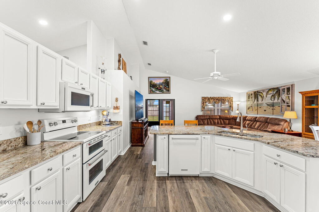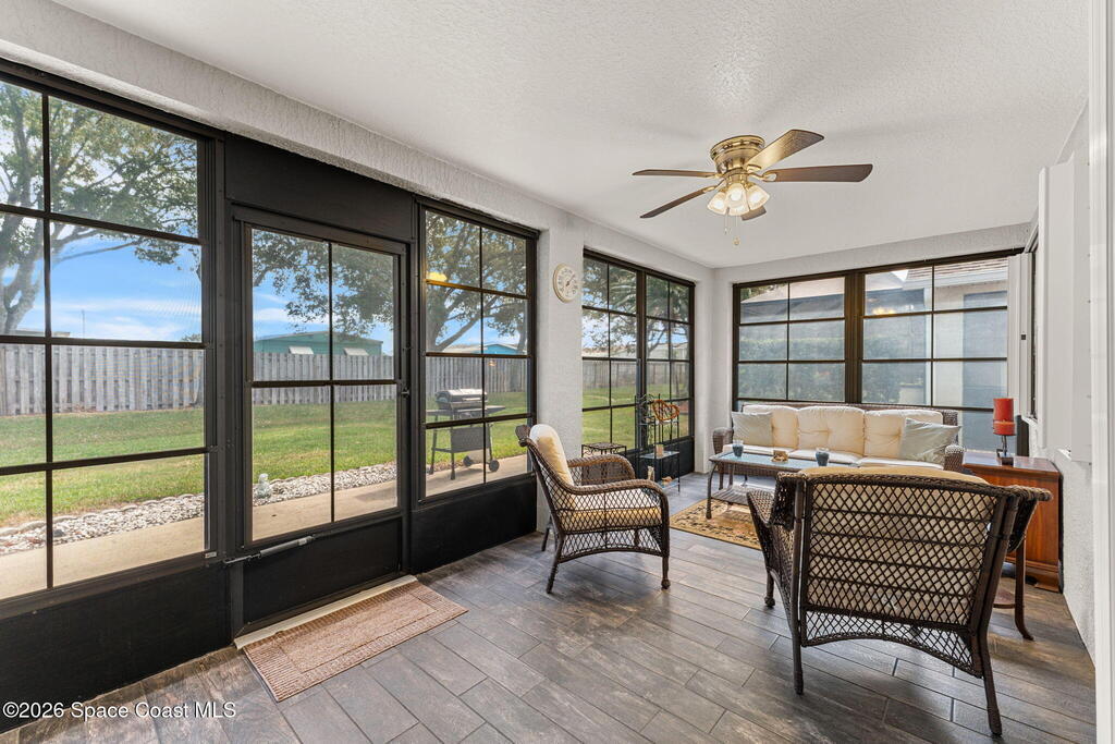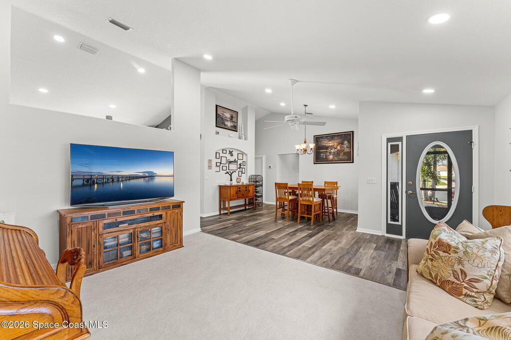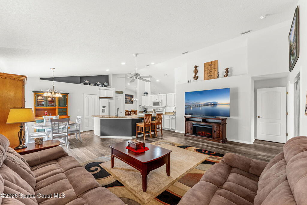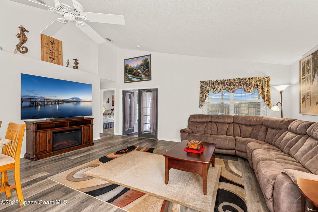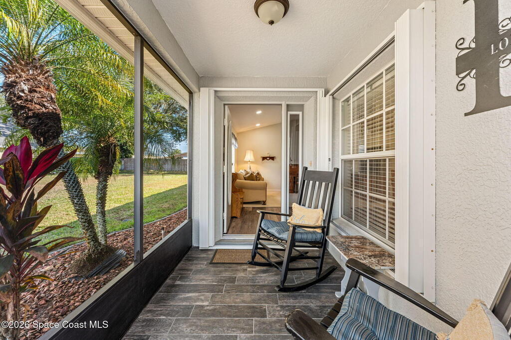 Enjoy the best of Active Adult living in the desirable 55+ gated community of Compass Pointe in West Melbourne! This beautifully updated 3BD/2BA home welcomes you through a screened front porch. Inside, vaulted ceilings, recessed lighting, and LVP flooring create an inviting feel. The layout offers separate living and dining, a family room, and a breakfast nook--ideal for entertaining or everyday comfort. The kitchen features white cabinetry, granite counters, a pantry, and KitchenAid appliances. A barn door opens to the remodeled primary en-suite with dual sinks, granite counters, and a custom-tiled walk-in shower. French doors lead to the lanai, and accordion shutters add peace of mind. Updates: electric garage door screen, paver driveway and walkway, and walkway. Roof and HVAC new in 2022, water heater in 2020. Resort-style amenities: pool, spa, fitness center, clubhouse, putting green, shuffleboard, bocce, and daily activities. Close to golf, shopping, dining, and beaches.