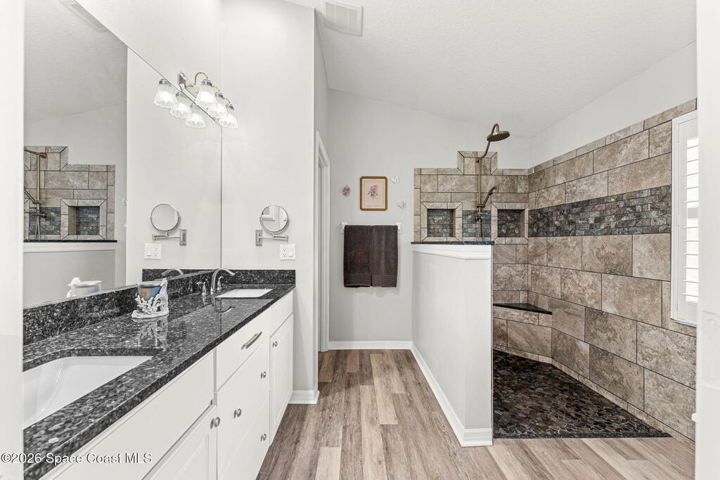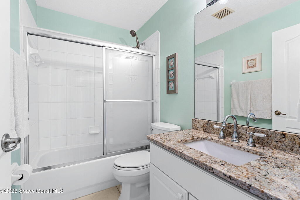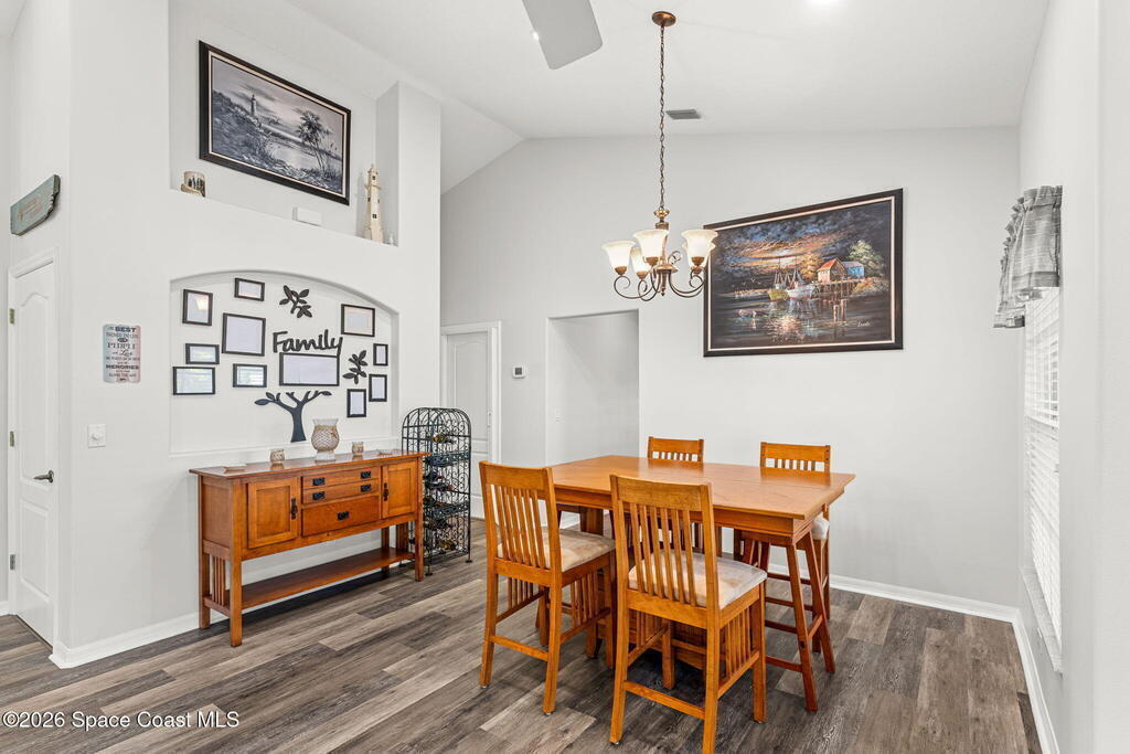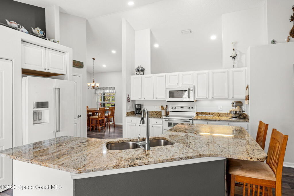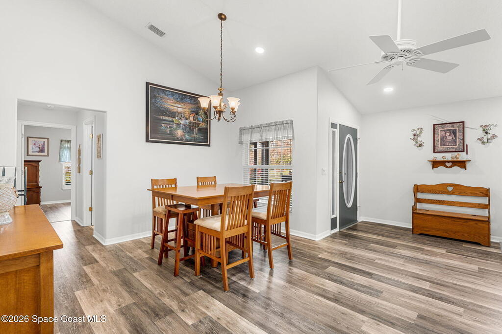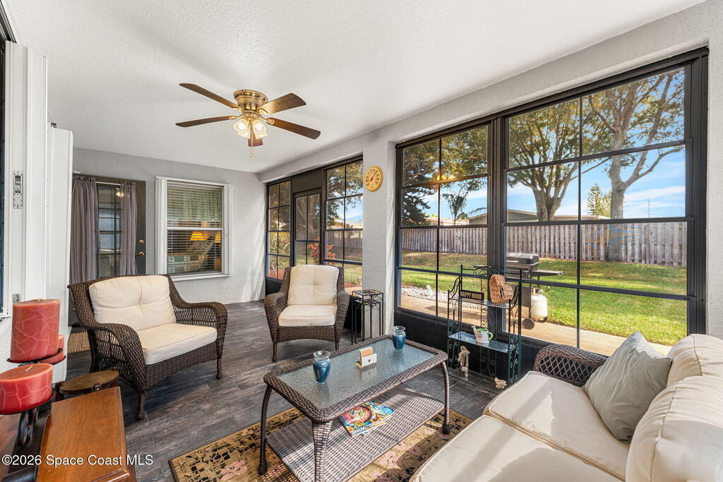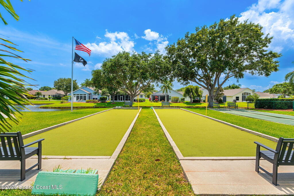 Enjoy the best of Active Adult living in the desirable 55+ gated community of Compass Pointe in West Melbourne! This beautifully updated 3BD/2BA home welcomes you through a screened front porch. Inside, vaulted ceilings, recessed lighting, and LVP flooring create an inviting feel. The layout offers separate living and dining, a family room, and a breakfast nook--ideal for entertaining or everyday comfort. The kitchen features white cabinetry, granite counters, a pantry, and KitchenAid appliances. A barn door opens to the remodeled primary en-suite with dual sinks, granite counters, and a custom-tiled walk-in shower. French doors lead to the lanai, and accordion shutters add peace of mind. Updates: electric garage door screen, paver driveway and walkway, and walkway. Roof and HVAC new in 2022, water heater in 2020. Resort-style amenities: pool, spa, fitness center, clubhouse, putting green, shuffleboard, bocce, and daily activities. Close to golf, shopping, dining, and beaches.