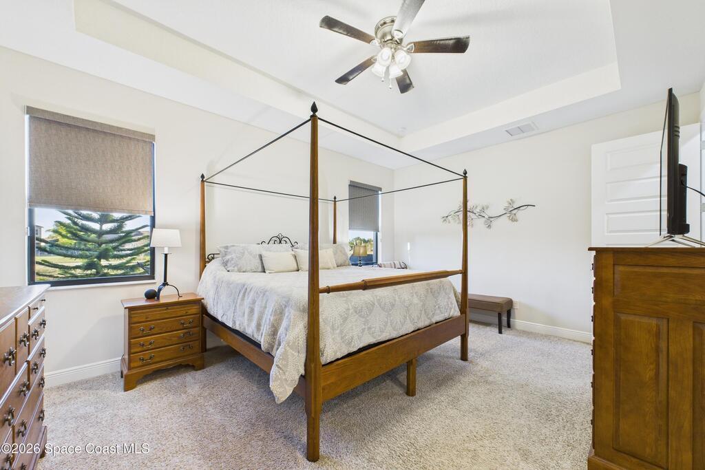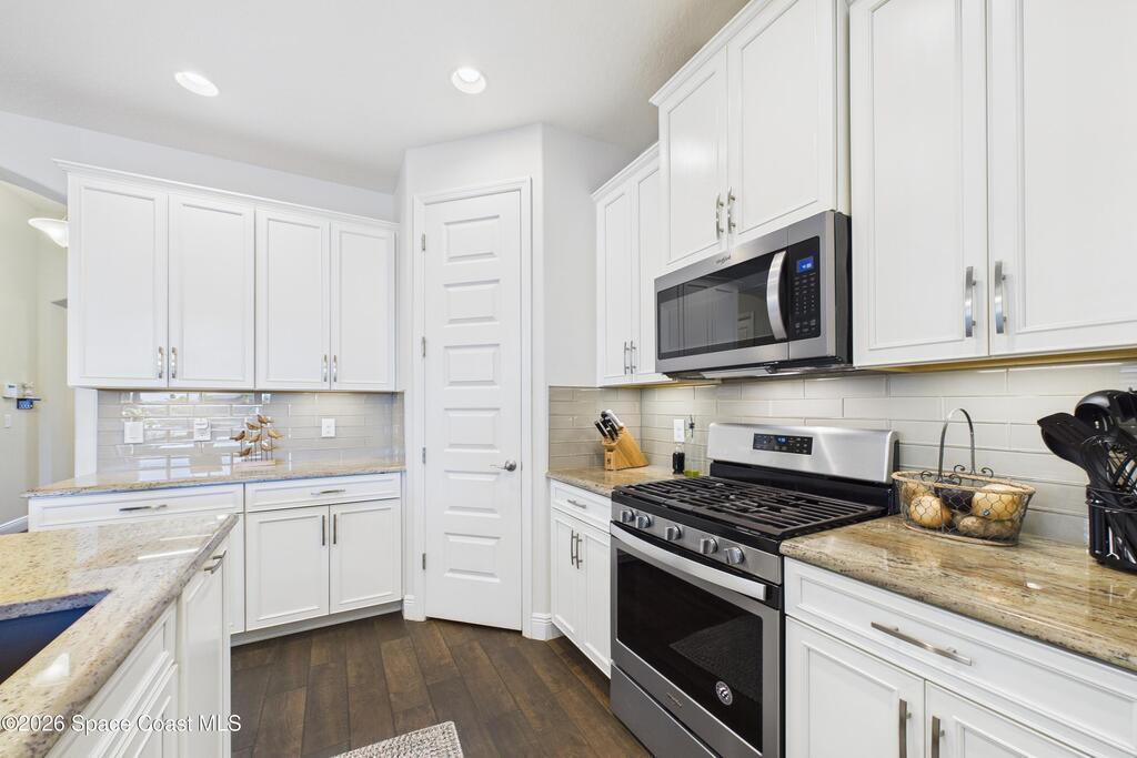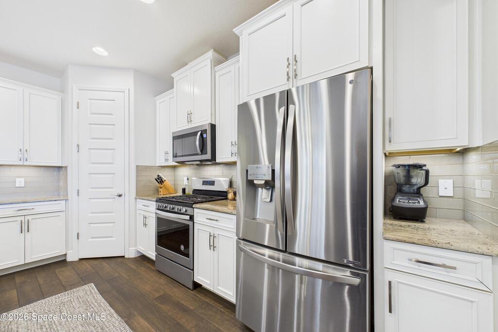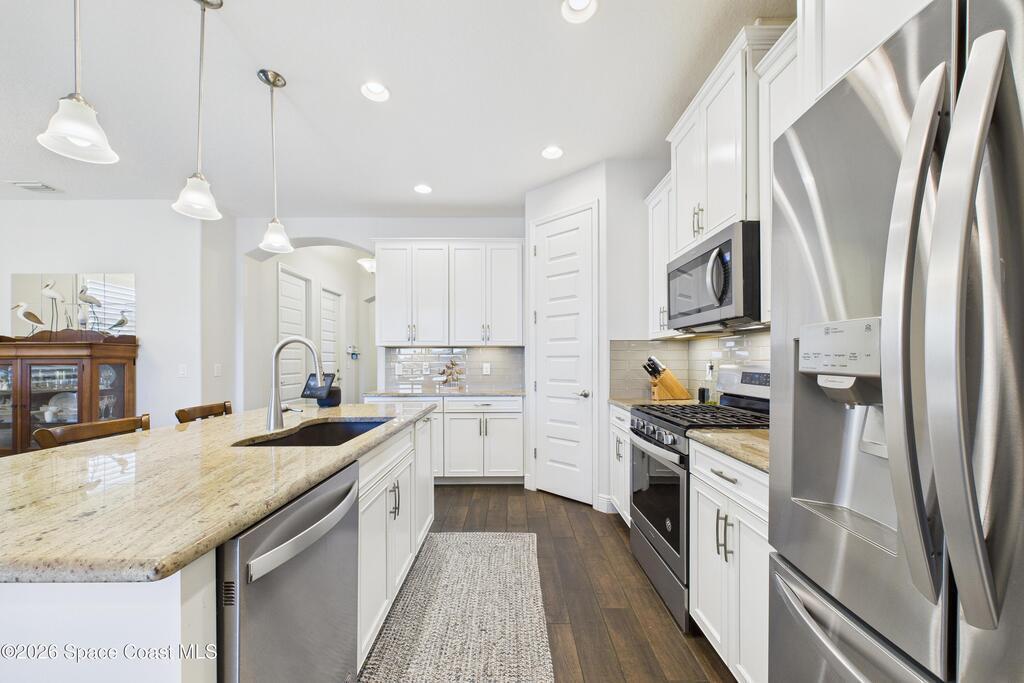 Welcome to this stunning waterfront home located in the highly desirable Trasona Cove community. Built in 2019, the Juniper model offers 3 bedrooms, 2.5 bathrooms, and just under 2,000 square feet of thoughtfully designed living space.Tile flooring flows throughout the main living areas, with carpeted bedrooms providing comfort and warmth. The kitchen features 42-inch cabinetry, granite countertops, a tiled backsplash, stainless steel appliances newly replaced in 2025, and a walk-in pantry. High ceilings are complemented by interior 8-foot doors, enhancing the home's open feel.The bright and spacious great room overlooks the tranquil lake and includes plantation shutters, while custom window shades are installed throughout the remainder of the home. Guest bedrooms are generously sized, and the guest bathroom offers a tiled shower and a double-sink granite vanity. Multiple closets provide ample storage throughout.
