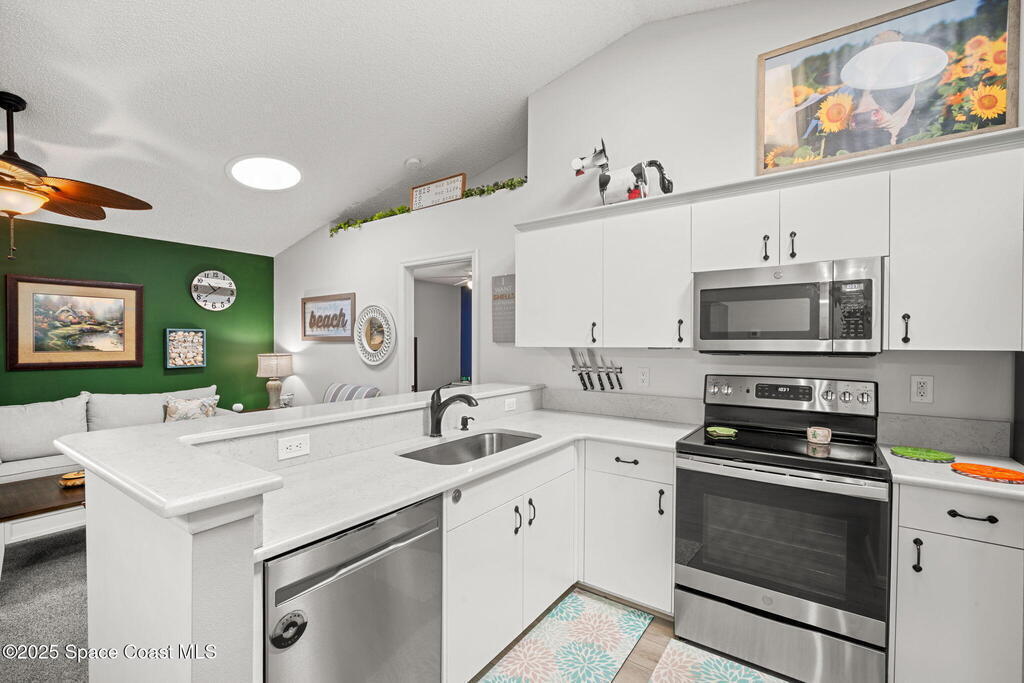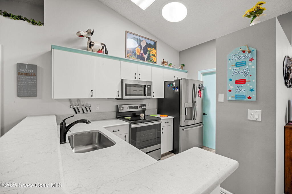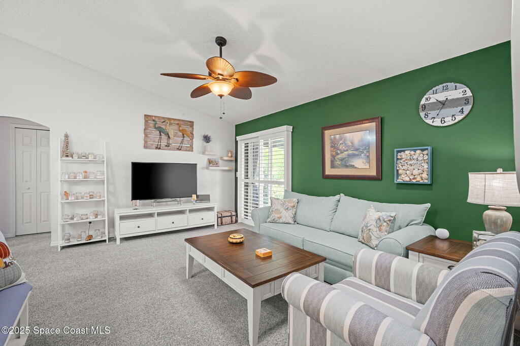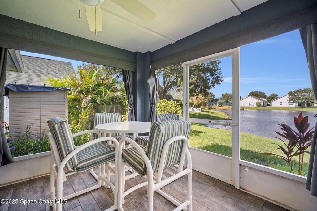 Pack a bag and escape the cold! This beautifully updated 3-bedroom, 2-bath, concrete block home is move-in ready! Nestled in a small, quiet cottage-style community with serene lake views, this cozy house is just 15 minutes from the ocean. Inside is all-new flooring, fresh interior & exterior paint, and plantation blinds throughout. The open-concept living area is filled with natural light, enhanced by new ceiling fans, solar tunnels and a fun, beach-inspired color palette. The updated kitchen features quartz countertops, newer stainless steel appliances, ample cabinet space and a pantry. A split floor plan offers privacy to guests. Enjoy peaceful mornings with coffee by the lake in your private back patio oasis.The 2019 roof adds peace of mind, and the entire home has been thoughtfully maintained and styled for low-maintenance, high-comfort living. Located minutes from top-rated schools, shopping centers, and local restaurants, this home truly has it all.