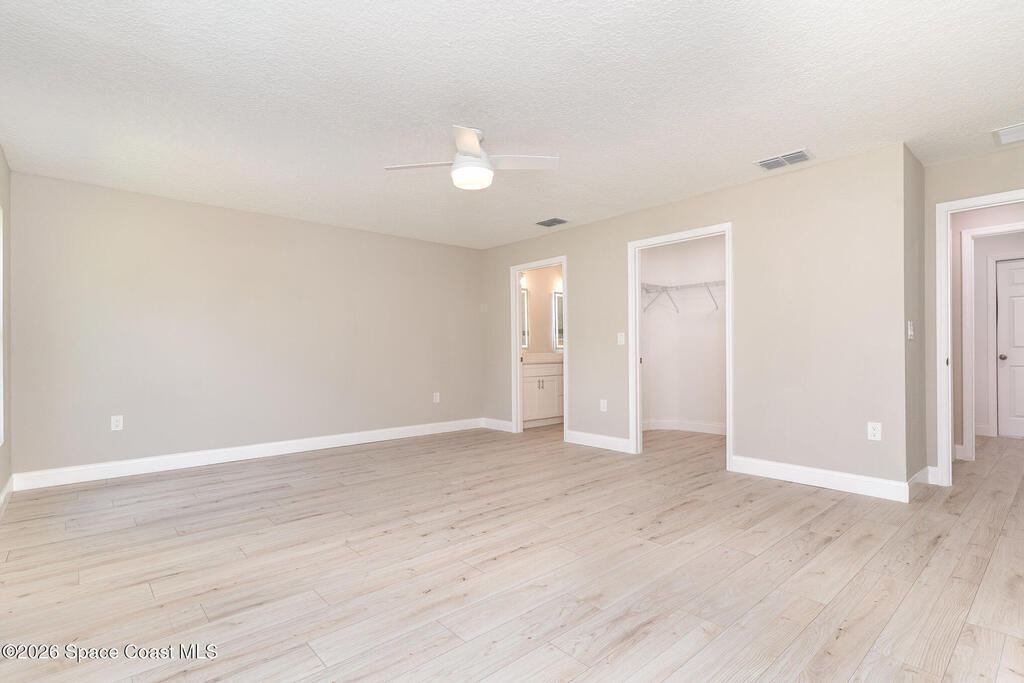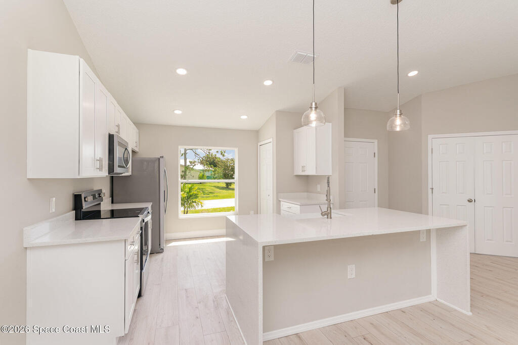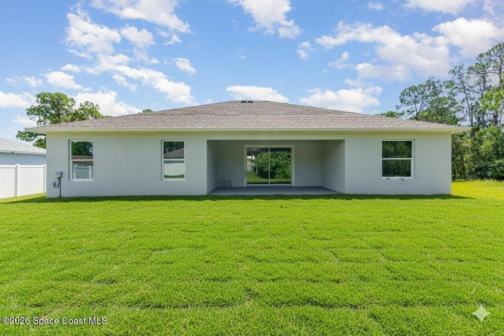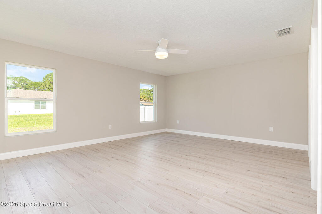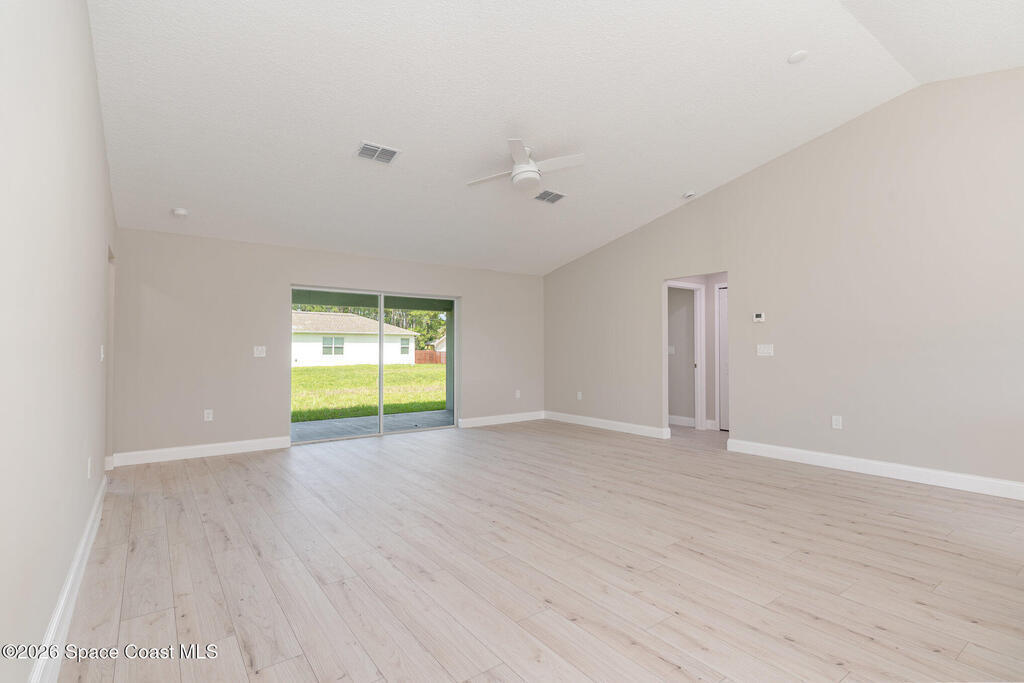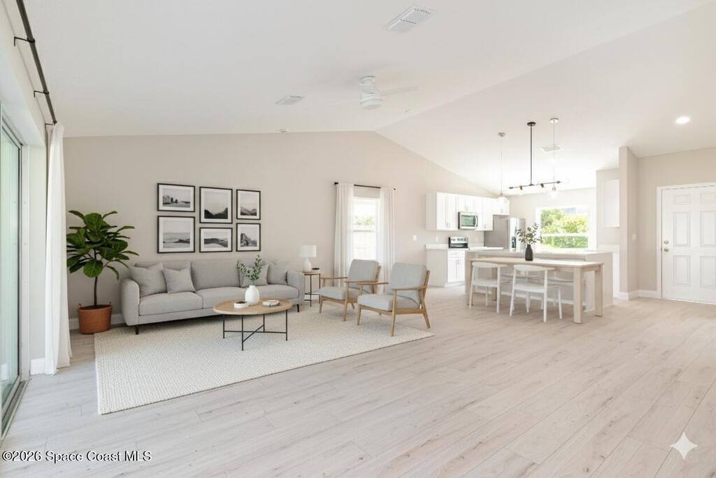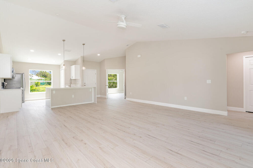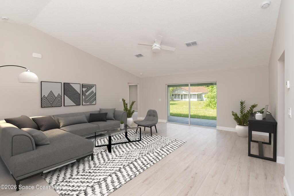 NO CLOSING COST LOANS AVAILABLE. One or more photo(s) has been virtually staged--New Construction. This Luxurious 3/4-bedroom, 2 Bath Property is exquisitely built with all of the upgrades nestled in the heart of Palm Bay. Inside you will find a wonderfully open floor plan perfect for family gatherings and entertaining. The capacious Chef's Kitchen is stylishly equipped with a prep island, solid wood cabinets, stainless steel appliances and ample storage. The contemporary living space is bursting with natural light and a flowing layout that is inviting and relaxing. Luxuriate in the vast Primary Suite that offers a collection of modern conveniences. This beautiful house is full of INCLUDED upgrades: solid wood soft close cabinets in the kitchen and in the bathrooms, luxury vinyl plank flooring (no carpet), tiled bathroom floors and floor-to-ceiling tiles in the showers, bathroom niches, granite countertops in the kitchen and baths, luxury handles, electric garage opener included.