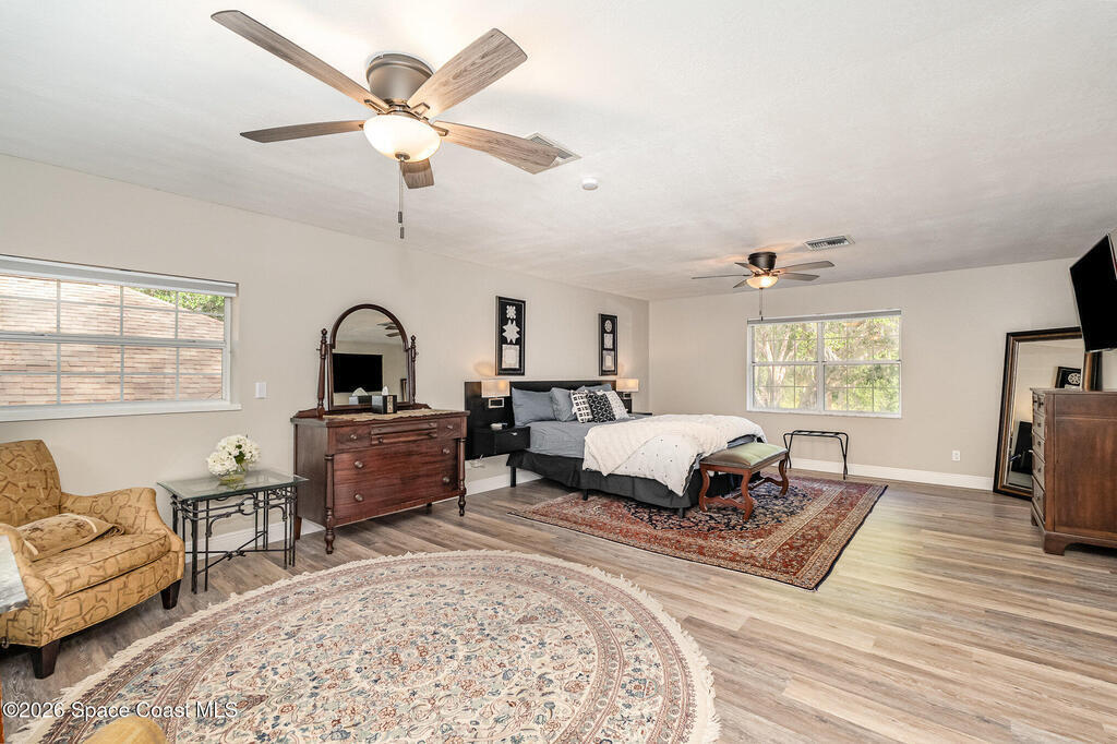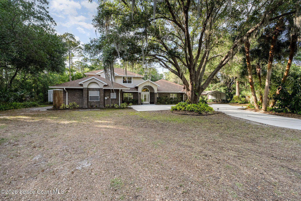 Rare multi-generational property in Windover Farms! Main 4BR/3BA home plus a fully independent 2BR/1BA ADA guest cottage connected by breezeway--ideal for extended family, caregiver, or rental income. Set on 1.58 horse-zoned acres, enjoy space for horses, RVs, or boats just 15 min to Kennedy Space Center & SpaceX. The screened heated pool with waterfall and large patio create a true Florida outdoor lifestyle. Inside, vaulted ceilings, open kitchen, and a primary suite with pool access add comfort and function. Guest cottage offers full kitchen, living room, and accessible bath. Updates include 2021 roof and fresh exterior paint. Oversized garage, multiple outbuildings, and low HOA complete the package. Windover Farms features oak-lined streets, trails, and tennis courts. Whether you need multi-generational living, equestrian space, or a launch-view retreat, this home delivers unmatched flexibility.