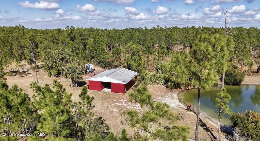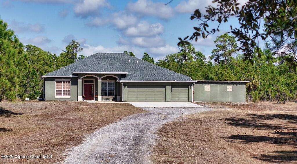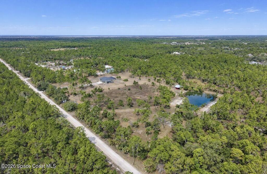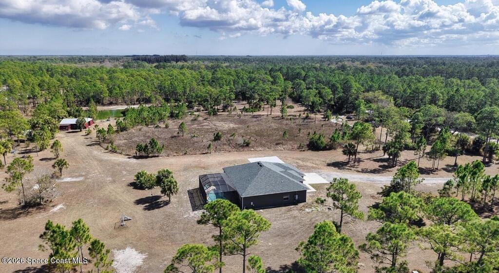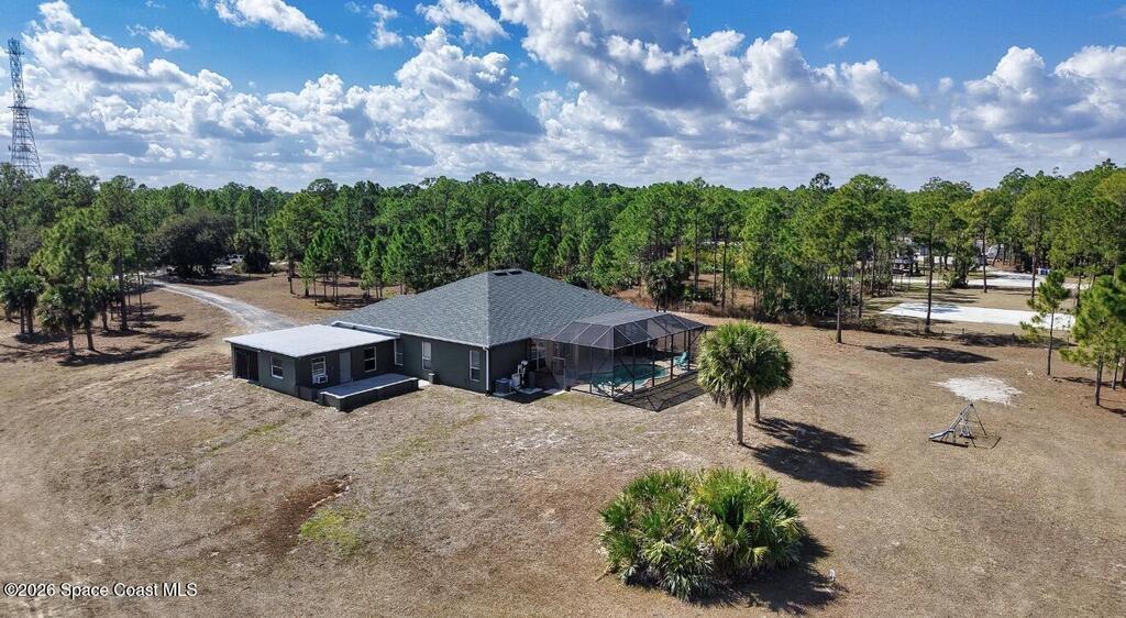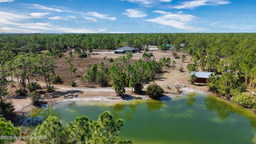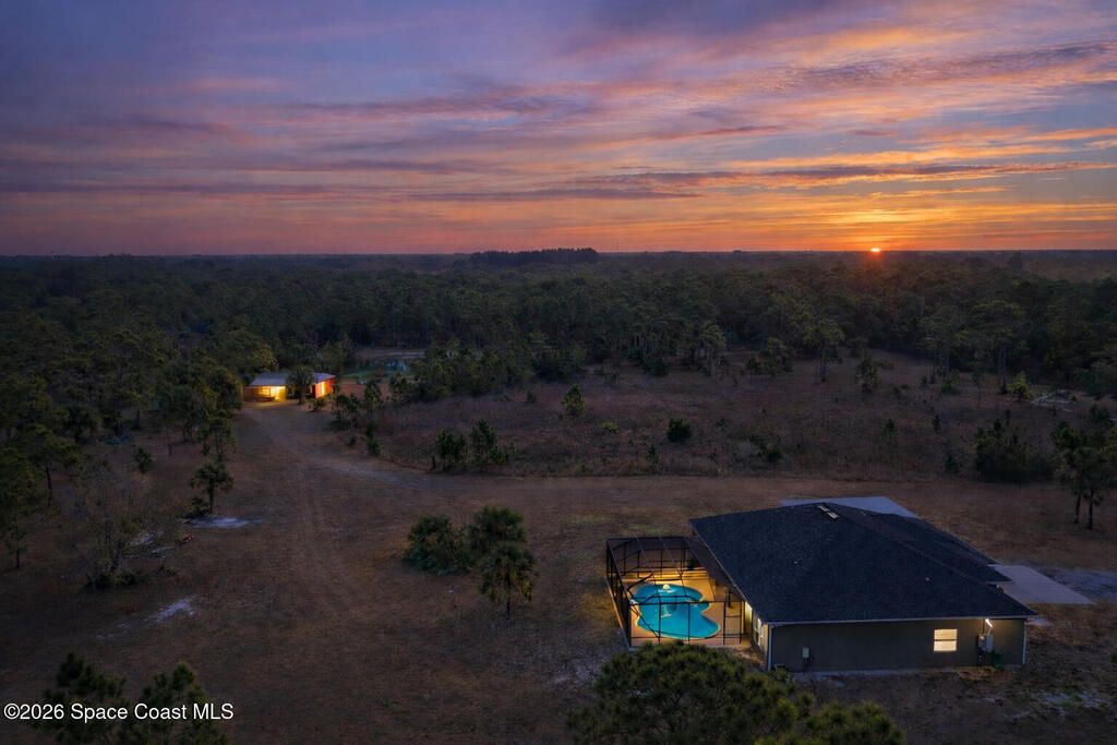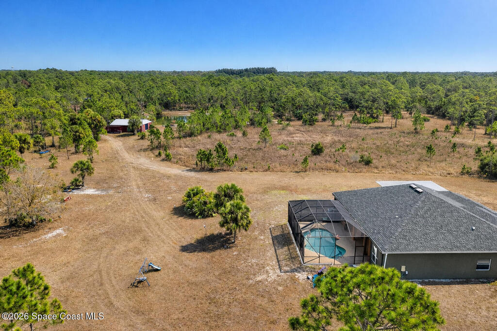 10 Acres with a very well maintained home with NEW ROOF in 2025, 3 bedrooms + Office, attached 3 car garage, additional room off garage for office/gym/dog wash room and additional parking/storage/shop. Lots of space with formal living and dining rooms and large screened pool and lanai area. The property is completely fenced for dogs and horses and includes a 3 stall barn w/tack rooms, chicken coop, and large pond with artisan well. Located on a private road yet close to paved county road and minutes to shopping.