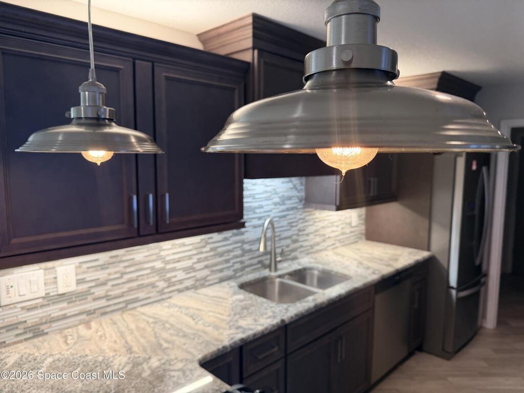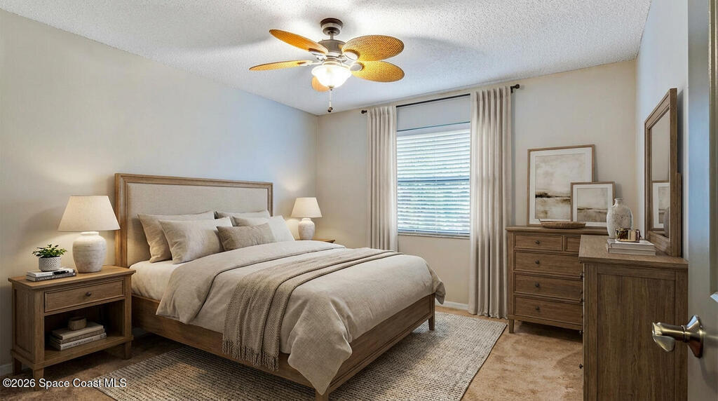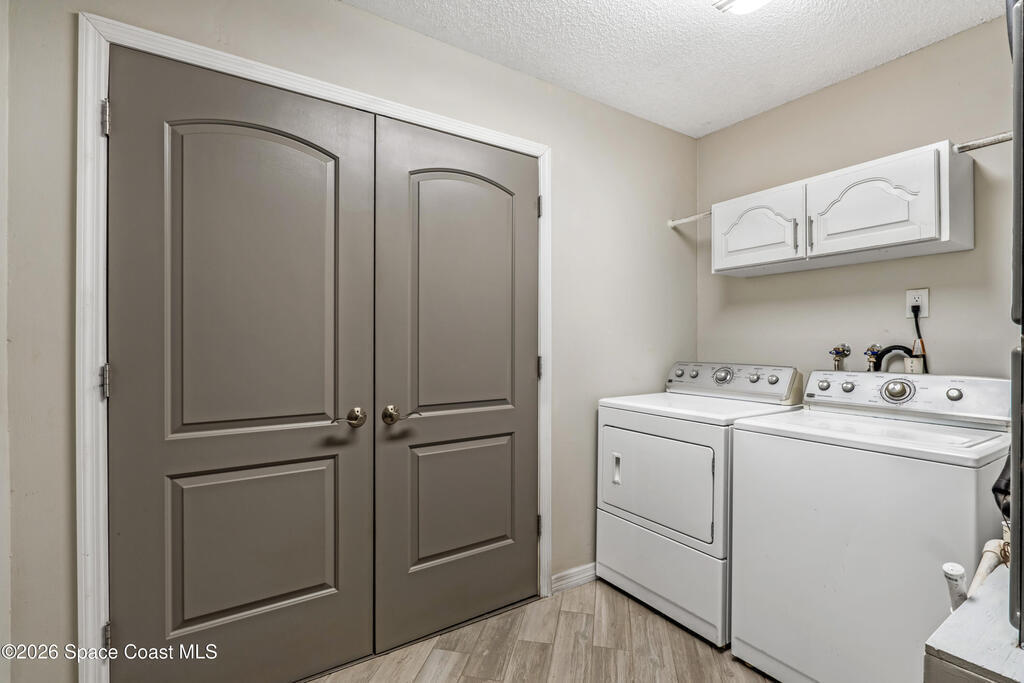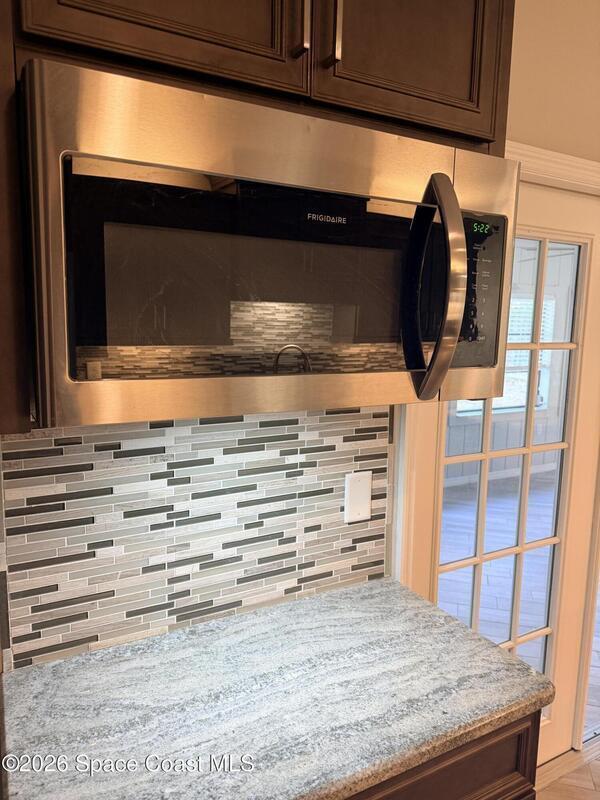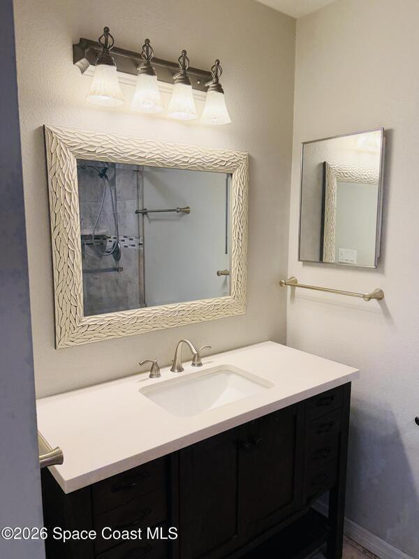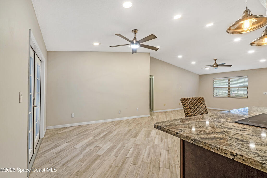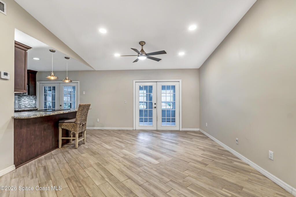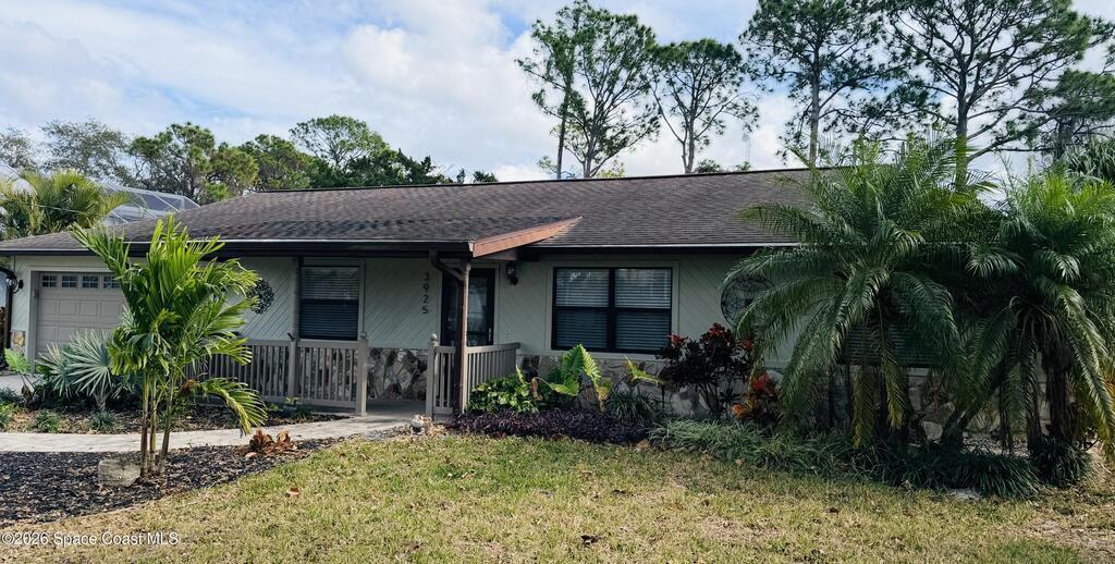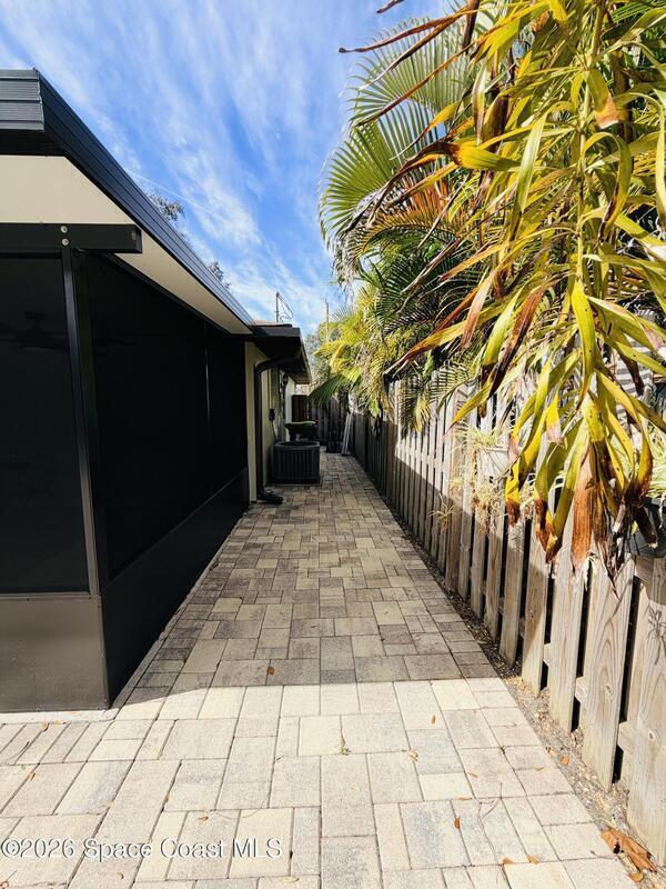 DREAM HOME on the SPACE COAST. This stunning 3 Bed, 2 Bath, oversized 2 Car Garage with workshop offers the perfect blend of comfort, style & functionality. Nestled in a quiet neighborhood with easy access to all the Space Coast has to offer. This property is designed for modern living and relaxation.Featuring diagonal ceramic wood plank-style flooring and plush carpeting.The interior exudes warmth & sophistication. The Custom kitchen is equipped with granite countertops, premium finishes, & ample storage making it ideal for both everyday use and entertaining. Updated Primary Bedroom and both bathrooms. A/C System ensures peace of mind & energy efficiency. With a Spacious open Living & Dining rooms .Step out through the French doors to your family room which leads out to a new screened in patio. Walk out to a newly paver stoned area and tropical landscaped backyard. Room for all your outdoor dreams. The property is completely fenced in for your comfort. SPACE COAST LIVING at its BEST