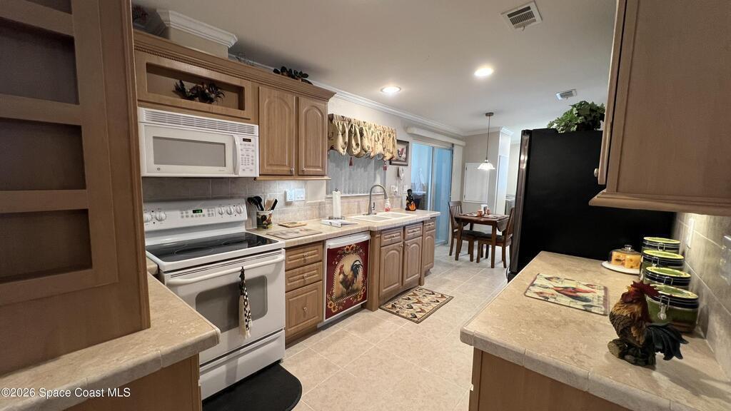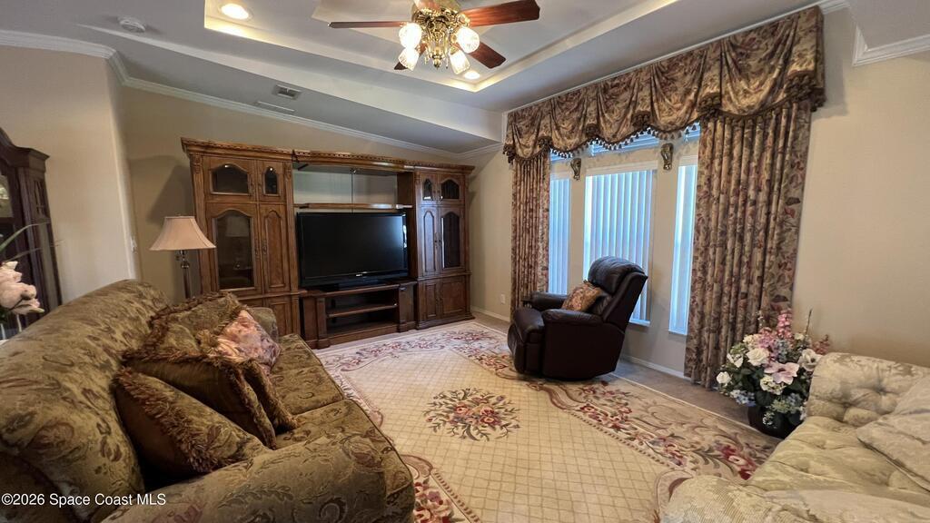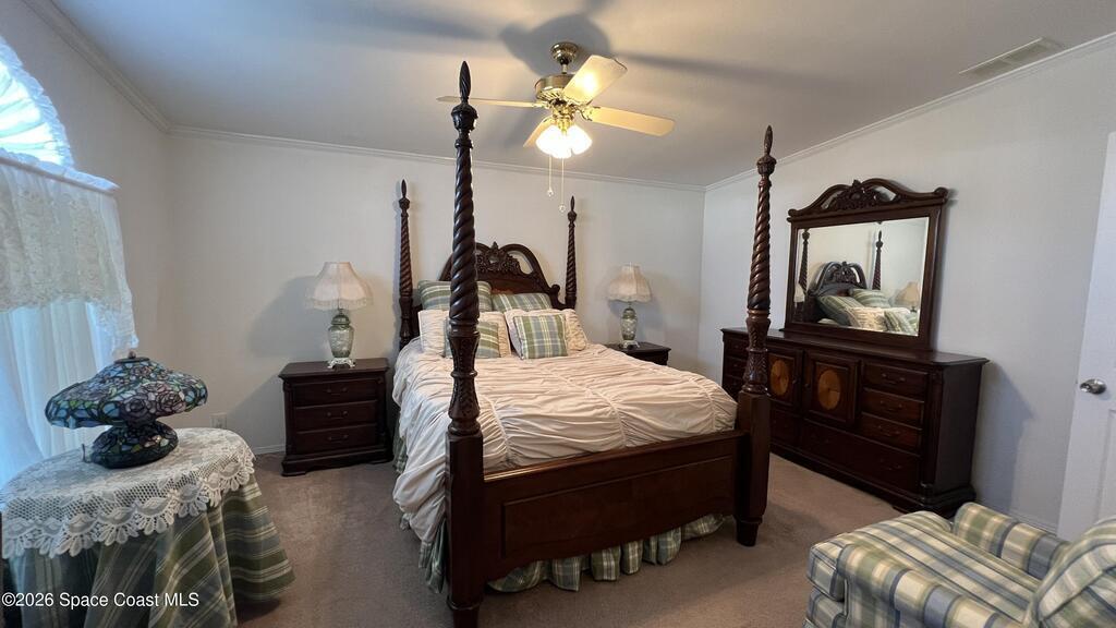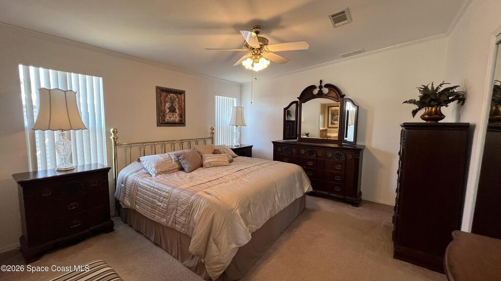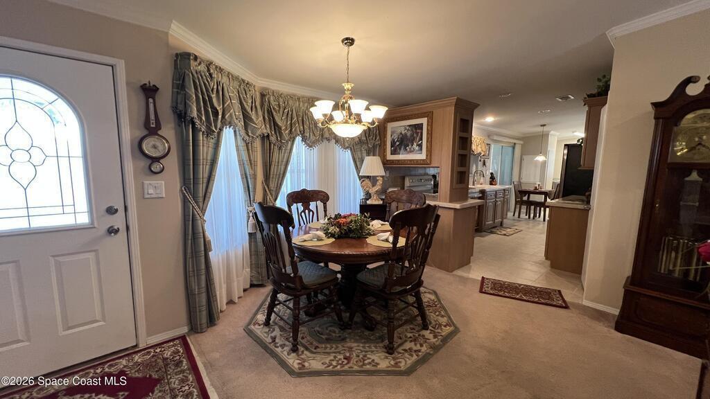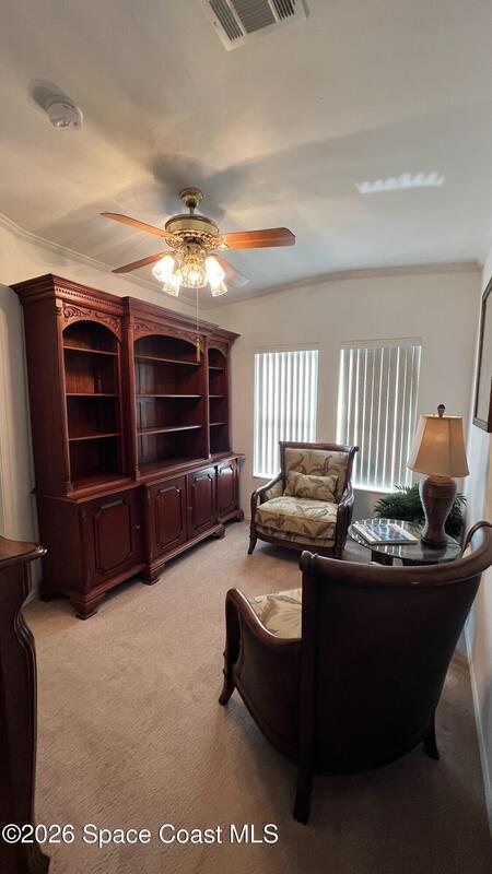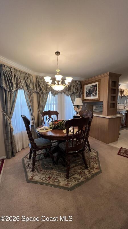As-is 2-bedroom, 2.5-bath manufactured home in Barefoot Bay with land ownership (no lot rent). Tile flooring in main living areas, with carpet in bedrooms and library. Large enclosed porch with tile flooring. Indoor washer and dryer. Attached storage room. The home is being sold fully furnished; all contents currently in the home convey. Updates include a new roof installed in 2025 and an AC system approximately 2 years old. A 4-point inspection was completed on 08/23/2025. Barefoot Bay Recreation District (BBRD) fees: $1,000 annual amenity fee paid with property taxes and a one-time $1,605 fee due at closing, payable to BBRD.Rental restrictions apply: 3-month minimum rental. Airbnb is not permitted. Maximum of two (2) pets allowed.