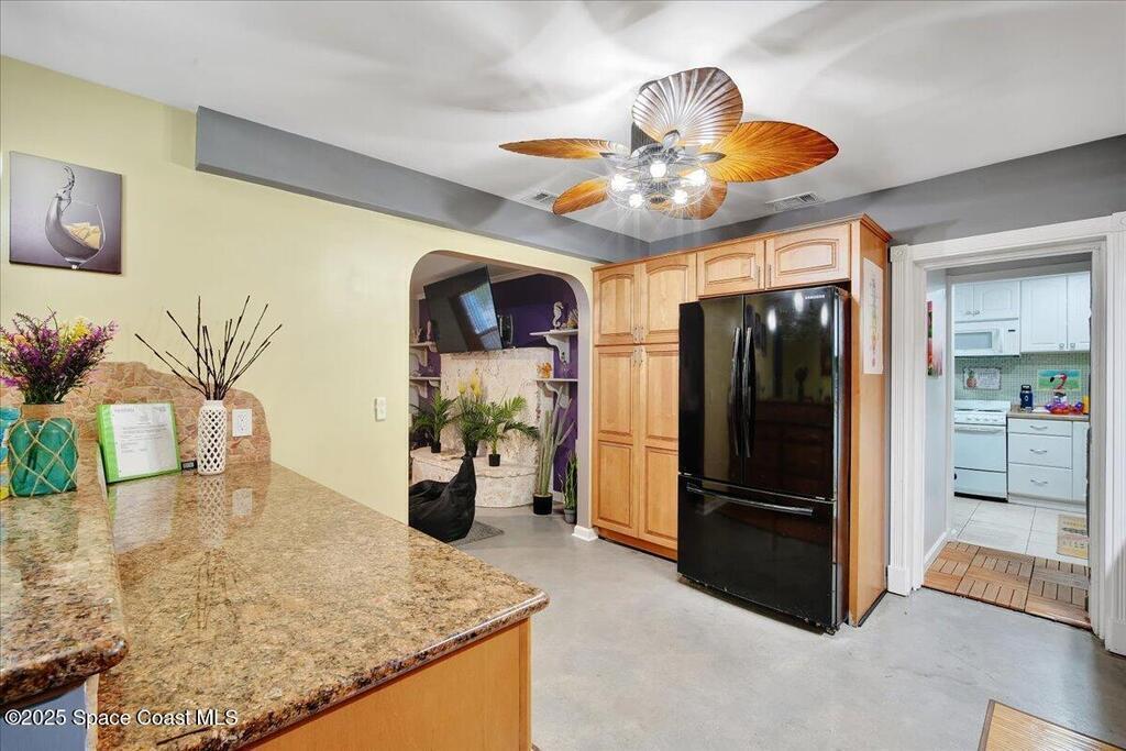 In the Heart of Cocoa Beach with endless possibilities is this beautifully renovated 4 bed 3 bath home that spans 2,332 sq. ft. and features a full income producing studio apartment with a separate entrance and fenced in yard making this ideal for extra income, AirBNB or guests. The main part of the house opens up to yet another opportunity for additional income, guest suite or an amazing Florida room. Just bring the pool table! From keeping this as a single family home, multi generational family use or an investors dream this is the one. The front yard is hardscaped with a large paver circular driveway allowing for plenty of parking, lush landscaping, hammock under the palms and a hangout area with firepit. Walking up you have screened front porch that takes you into the main house area with large living room and kitchen. The kitchen has all new cabinets with granite counters with a bar top and dining area.