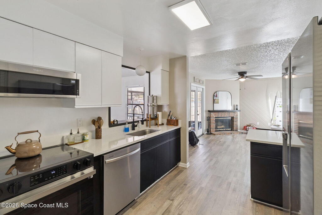 Move-in ready and loaded with upgrades! This beautifully updated home features a versatile flex room and cozy fireplace--perfect for a home office or extra living space.Enjoy an updated kitchen and baths, new flooring throughout, and brand-new stainless steel smart appliances. Plush, pet-friendly, stain-resistant carpet (lifetime warranty) is in the bedrooms for added comfort. Additional upgrades include a new garage door and opener, UV light sanitation system in the AC, and water filtration in the bathroom showers. Indoor laundry, ample storage, and a fully fenced yard with a separate garden area complete the package.Live the best of Space Coast living--just minutes to the beaches and shopping. Conveniently located near a brand-new Publix and three upcoming town centers, adding incredible value and future growth potential.Don't miss this opportunity--schedule your showing today!