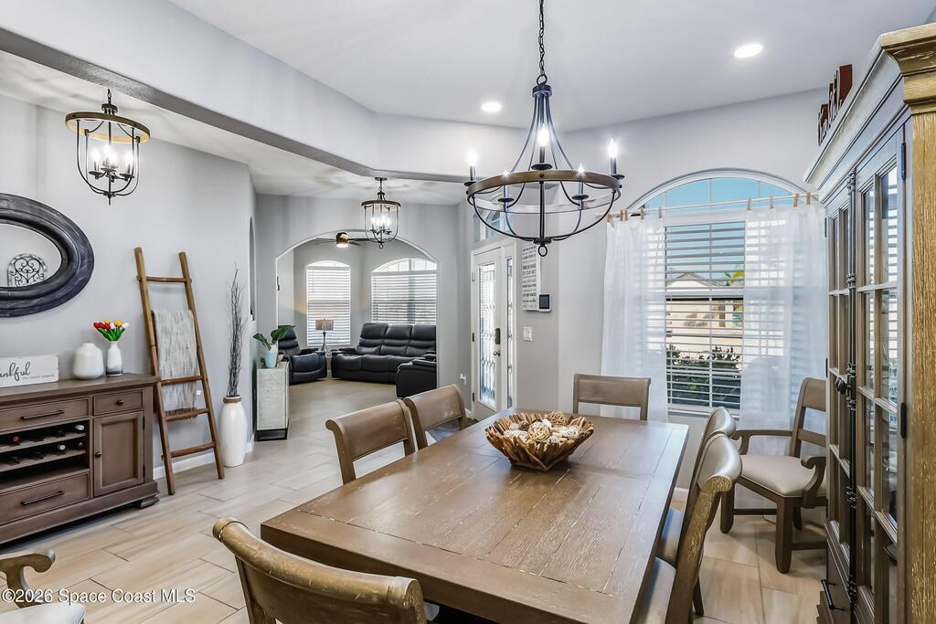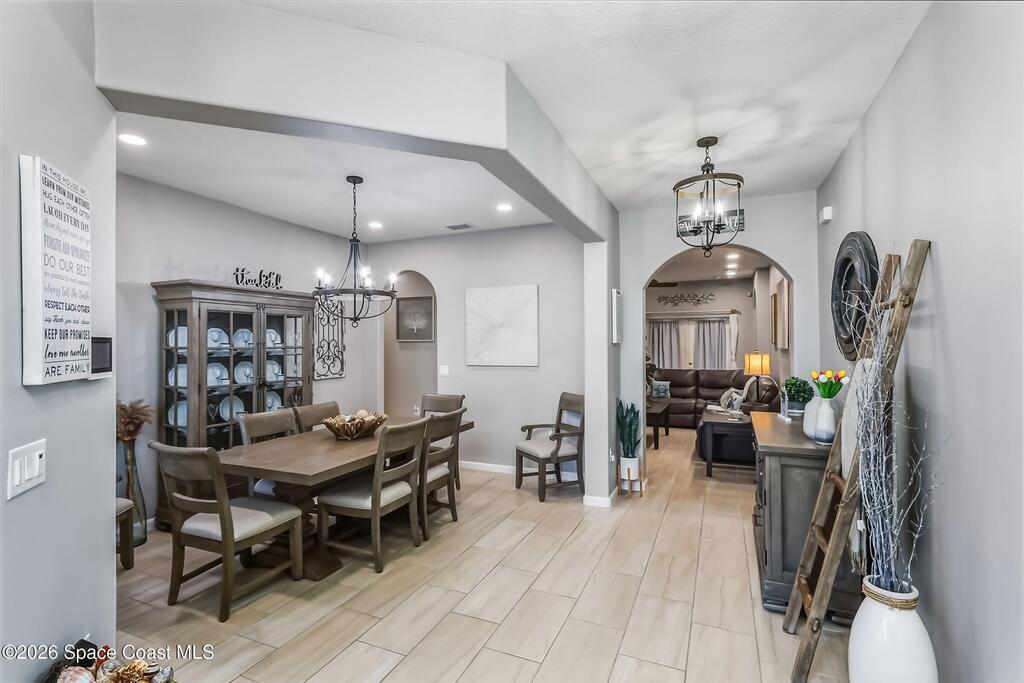 4b/3b corner-lot home is perfect as a next chapter, fresh start or relocation. The heart of this home connects an open living area to the kitchen, where island seating, generous storage & a flexible nook adapt easily to everyday living & relaxed entertaining. Separate dining room provides space for both casual meals & more elegant gatherings. Flex room works well as an office, den, or playroom. Owner's suite is set apart & spacious, featuring a sitting area, dual closets & a spa-style bath designed for comfort & calm. Guest bedrooms/baths are thoughtfully placed to maintain privacy. Laundry room connects directly to a spacious 3-car garage for added convenience. Outdoors, a covered patio opens to a fully fenced yard w/an angled water view & ample space to add a pool. High ceilings, natural light & softly curved arches add warmth & character throughout. Community amenities include pool, clubhouse & play area -- perfect for everyday enjoyment or visiting family.
