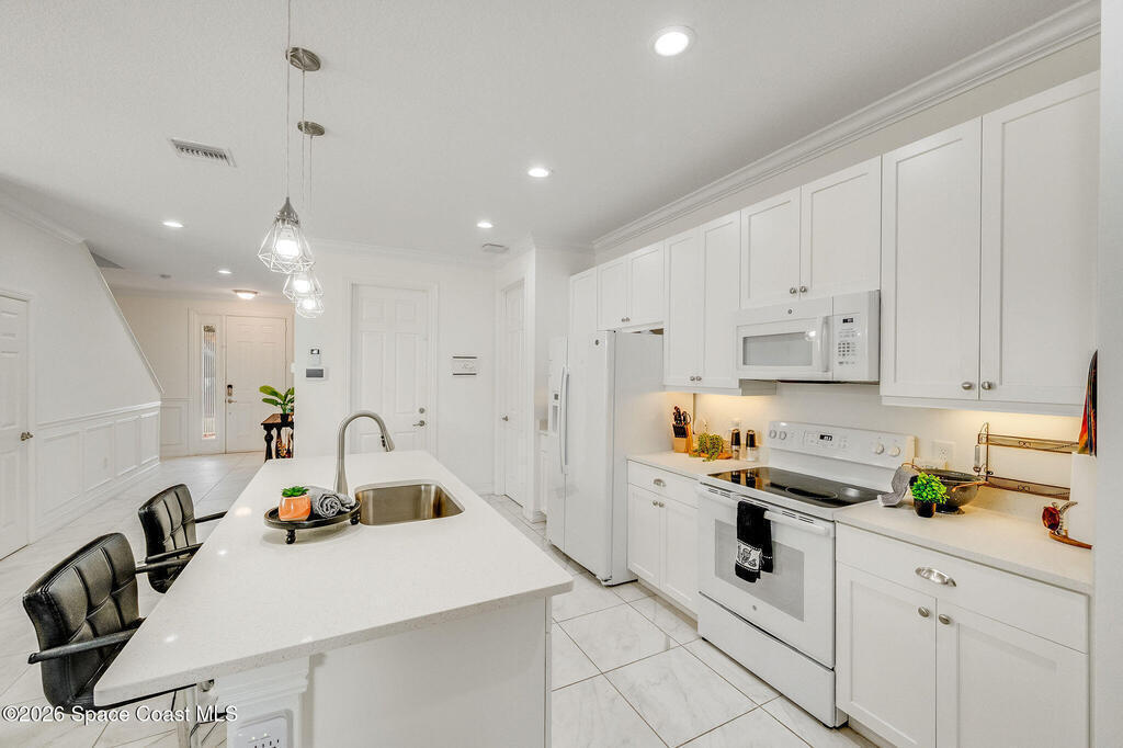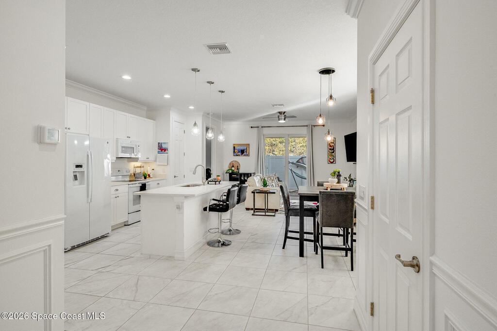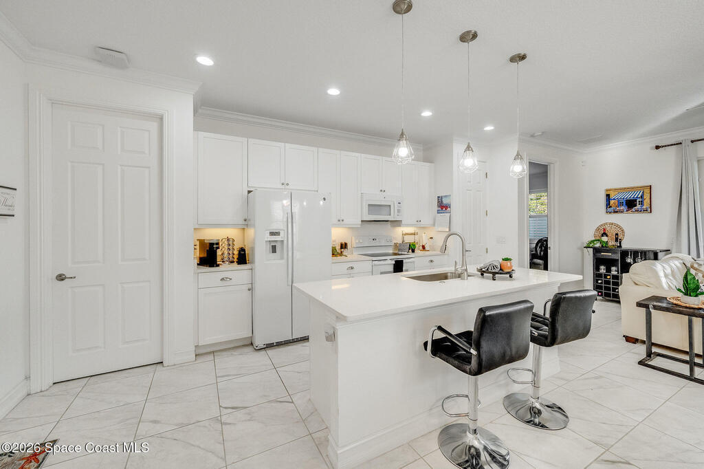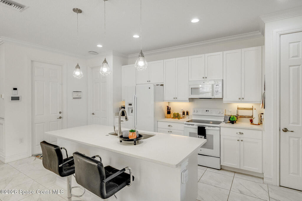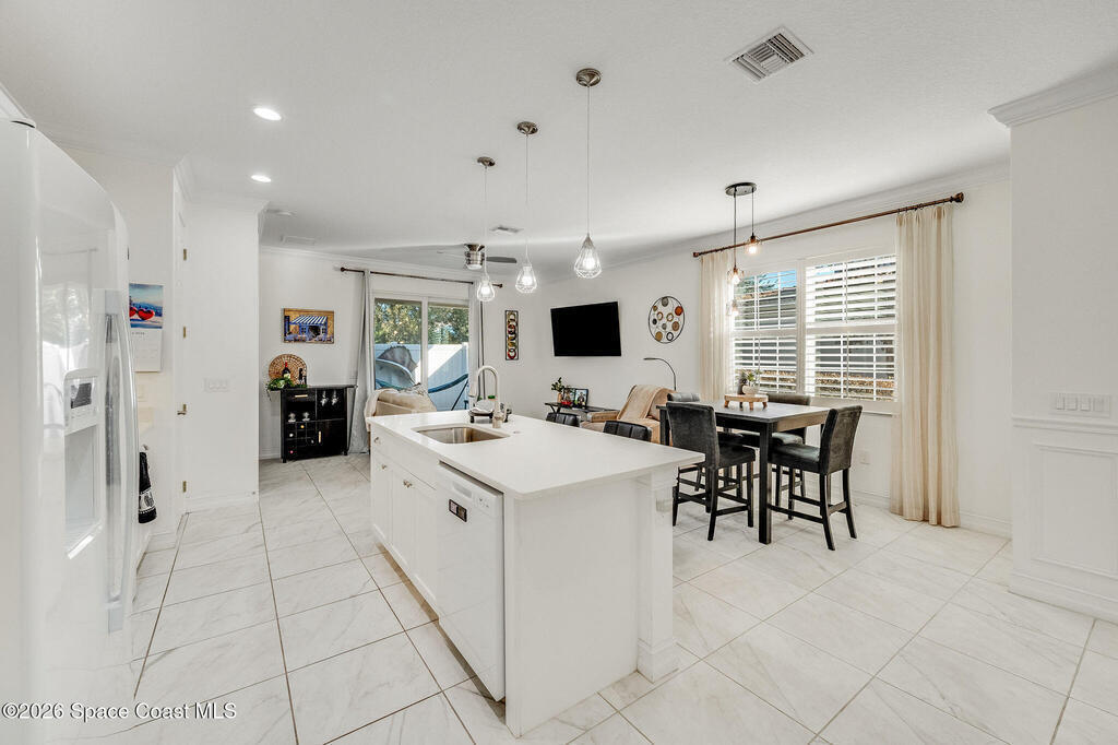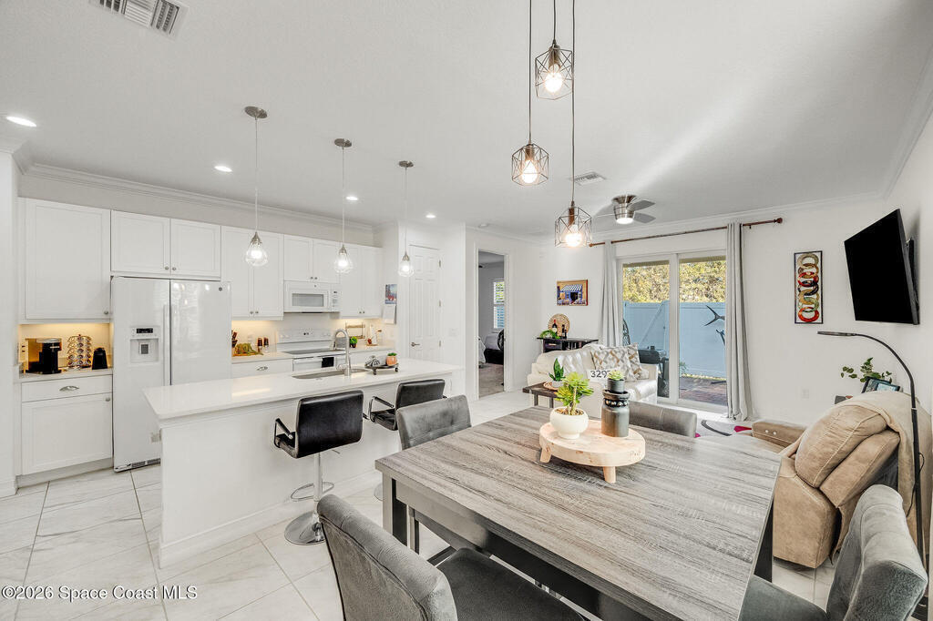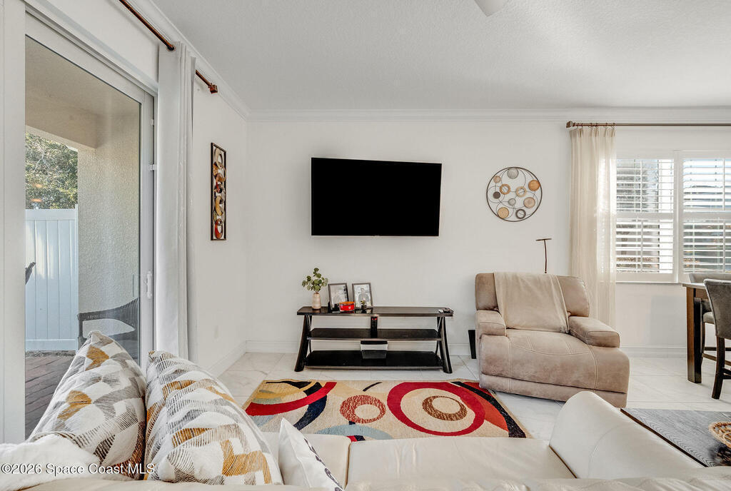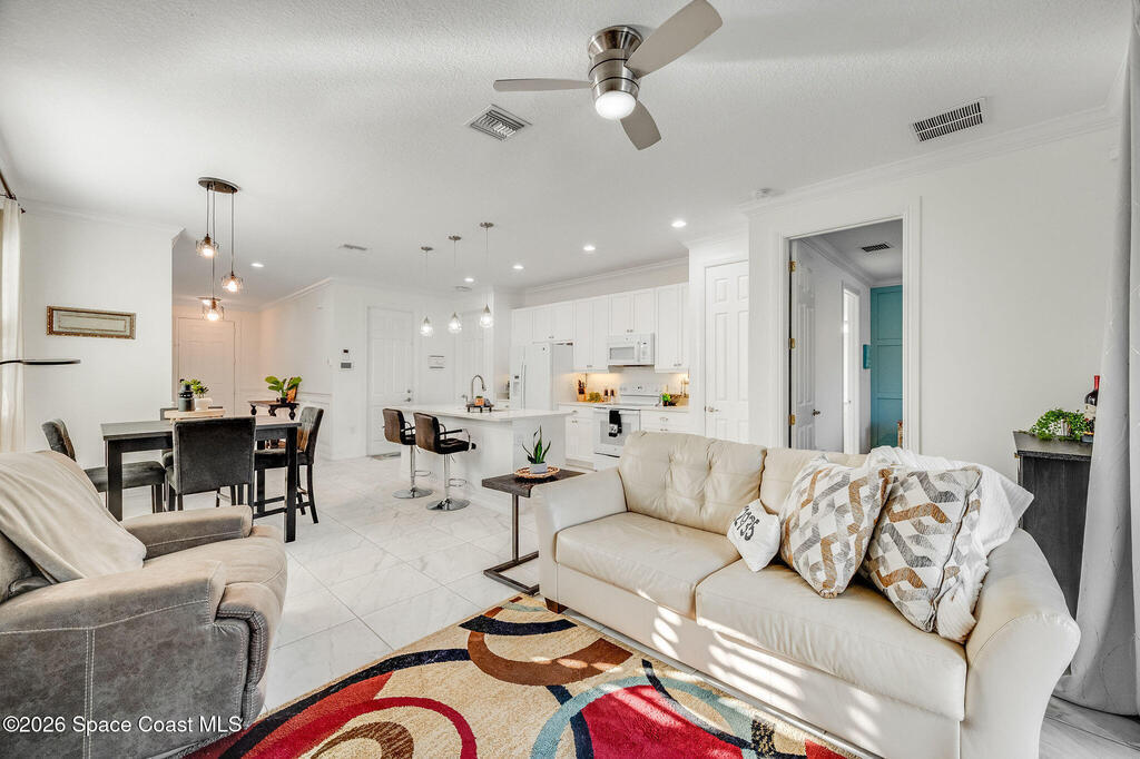 Built in 2020 and formerly the model home in Riverwalk of Melbourne, this end-unit townhome is filled with natural light and upscale finishes throughout. Featuring crisp white cabinetry, quartz countertops, marble-look tile flooring, crown molding, and custom woodwork accents, every detail was thoughtfully selected to showcase the builder's best design. While some homes in the community date back to 2007, this newer construction stands apart with modern style and energy efficiency. The open-concept layout flows beautifully for everyday living and entertaining. Enjoy a small fenced yard for added privacy and a finished garage with upgraded flooring -- a signature model home feature. Very lightly lived in and impeccably maintained, this move-in-ready home offers low-maintenance living in an ideal Melbourne location close to shopping, dining, major roadways, and the beaches.