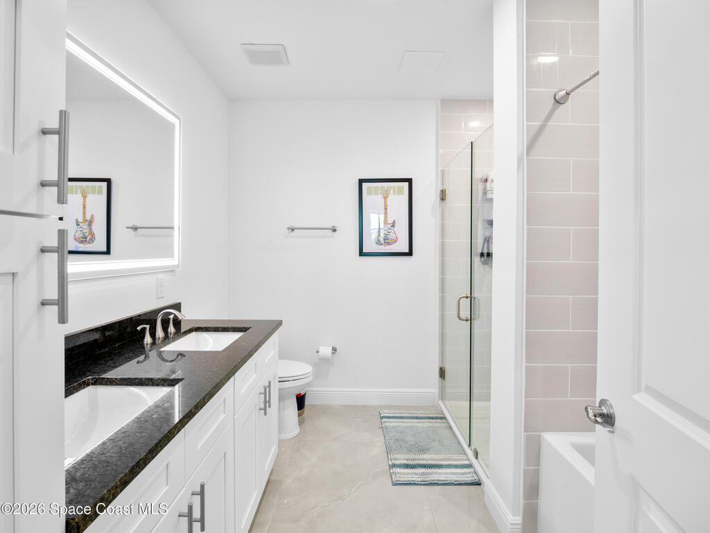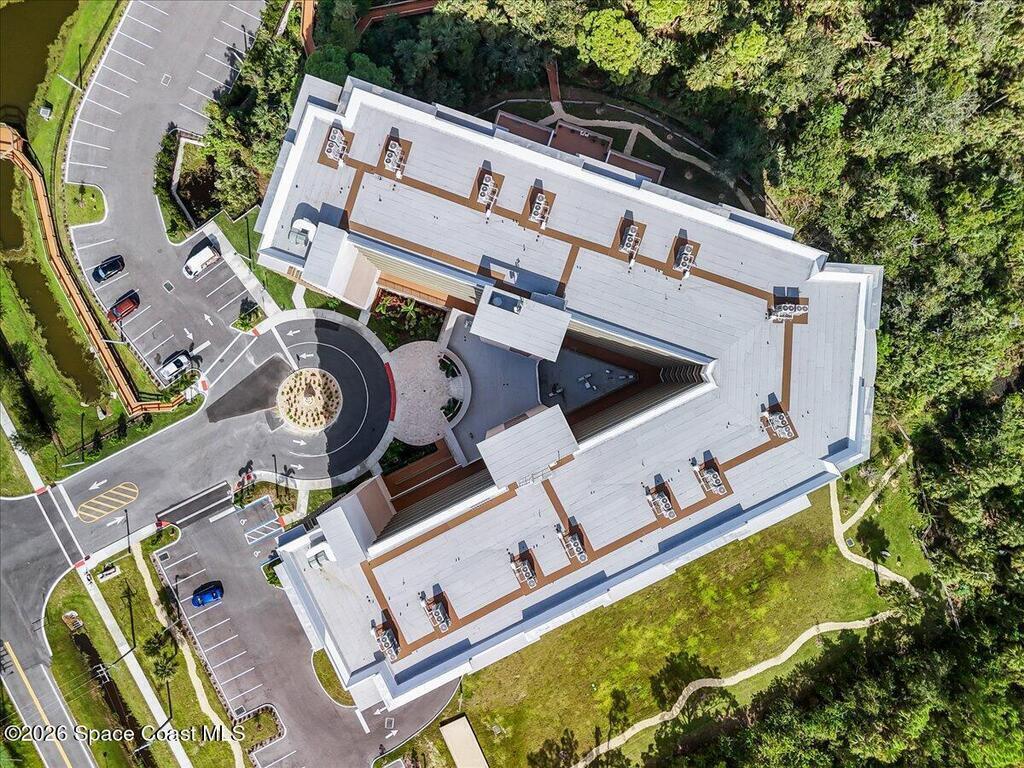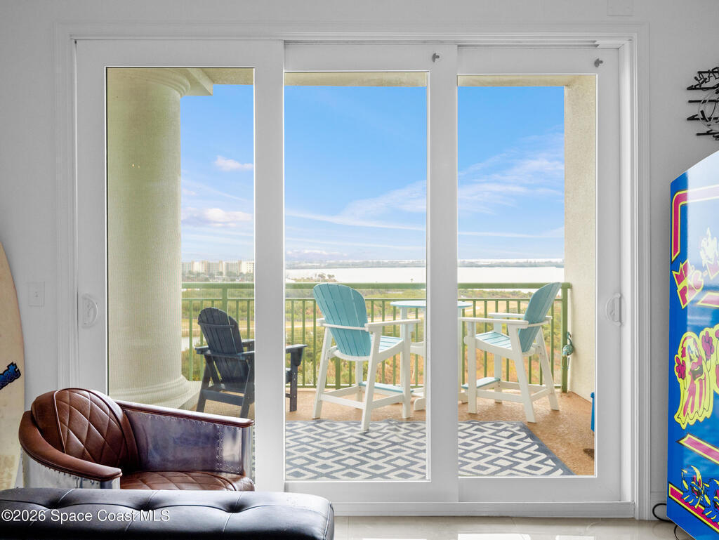 Rare Top Floor Corner Unit! The front bedroom has its own private balcony and then you have a second wrap around balcony with access from the living room and primary bedroom with views of both the Sykes Creek and Indian River. Each bedroom has its own en-suite with an extra half bath in the hall for guests. Impact windows throughout for peace of mind and energy efficiency. Spacious Primary bedroom with a walk-in closet, primary bathroom that has a double vanity and a soaking tub with a separate shower. This unit comes with one designated parking space in the garage, and open parking outside. River Fly-In is only a two year old building with many amenities from a community pool, club house with a full kitchen, movie theater, gym, sauna, and many more amenities!