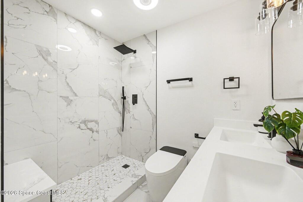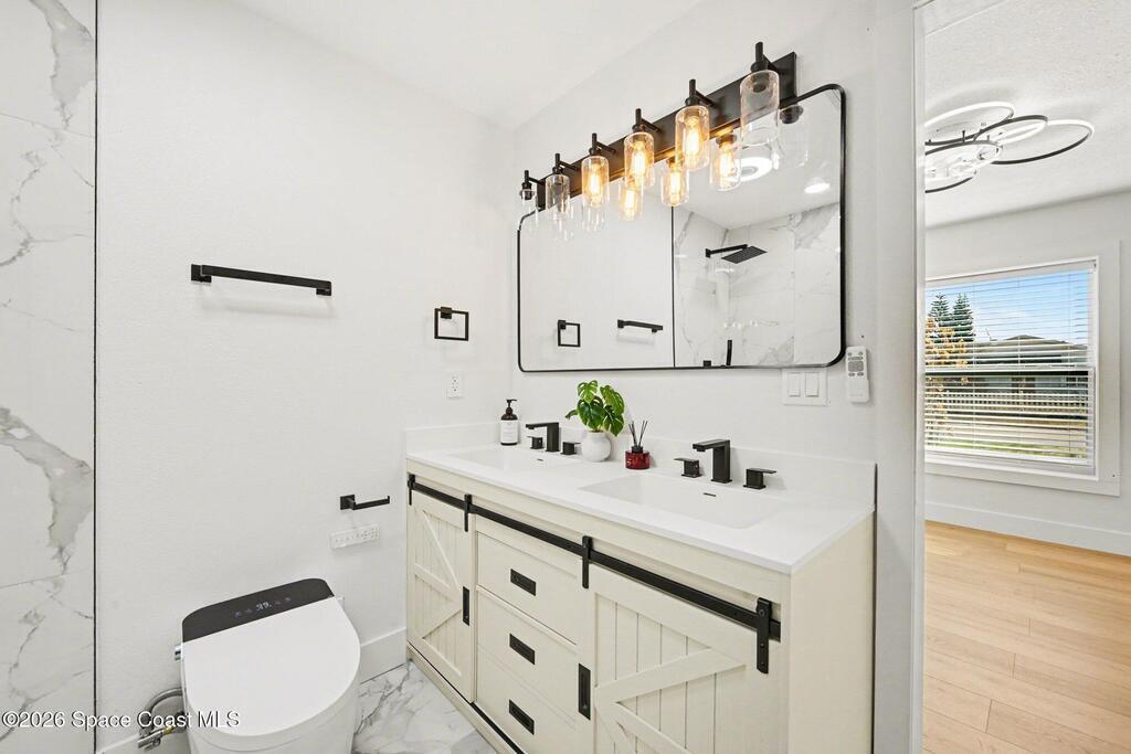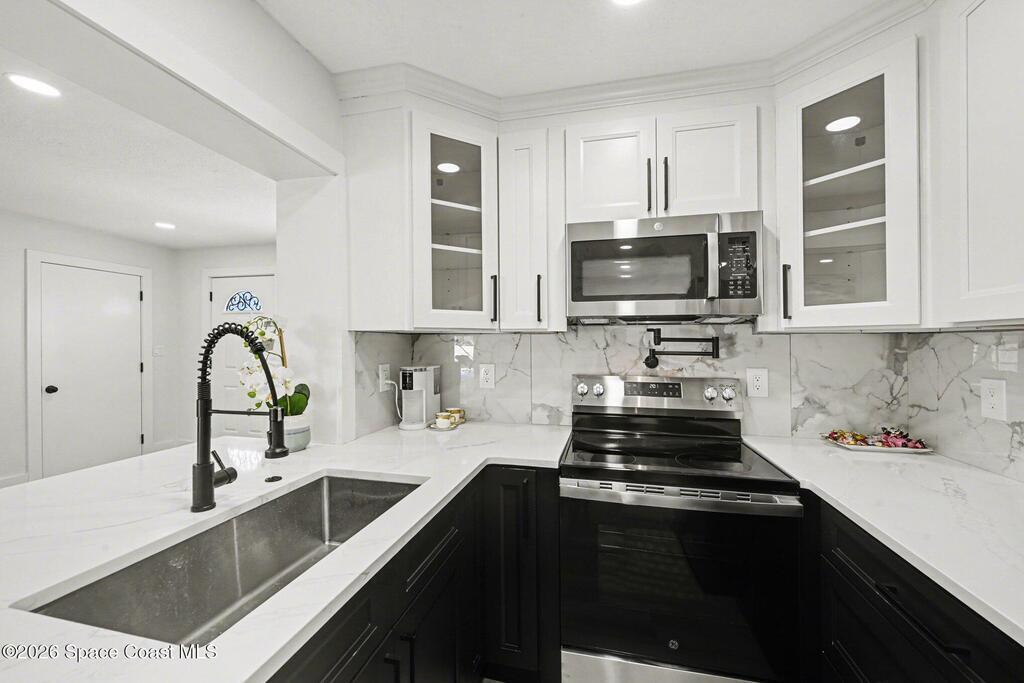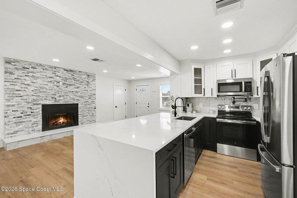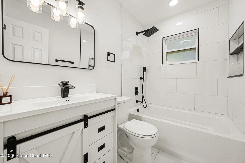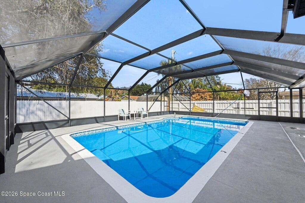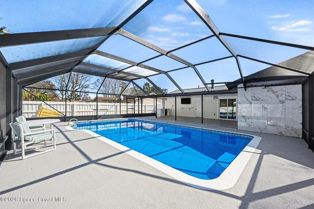 Beautifully renovated 3BR/2BA pool home in the heart of Melbourne offering modern upgrades and exceptional outdoor living. This move-in ready property features a durable metal roof, new A/C, and new water heater. The updated kitchen showcases quartz countertops, brand-new stainless steel appliances, pot filler, and touchless faucet. Open, light-filled layout with stylish finishes throughout, including Bluetooth speaker/light systems in both bathrooms. The owner's suite includes a private side porch, perfect for morning coffee or relaxing evenings. Step outside to a screened pool, outdoor shower, and entertainer's patio complete with TV setup, mini fridge, and bar seating. Ample parking with space for RV or boat storage. Garage includes electric vehicle charger. Washer/dryer combo included. Conveniently located near shopping, dining, schools, and major roadways.