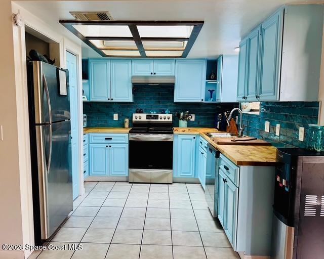 Move-in ready 3BR/2BA brick home in Palm Bay! New metal roof (2023). Both bathrooms fully remodeled in 2023 with modern finishes and walk-in showers. Updated kitchen features new cabinets, butcher block countertops, and stainless steel refrigerator, stove, range hood, and dishwasher. Durable 12'' ceramic tile flooring throughout and fresh interior paint. Major updates include new A/C (2021) and new water heater (2025). Solid construction with stylish upgrades--don't miss this one!