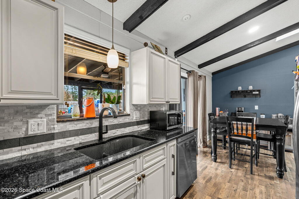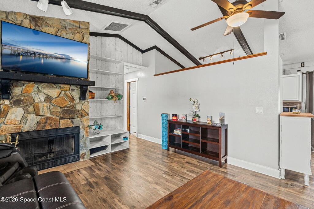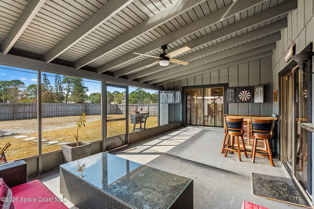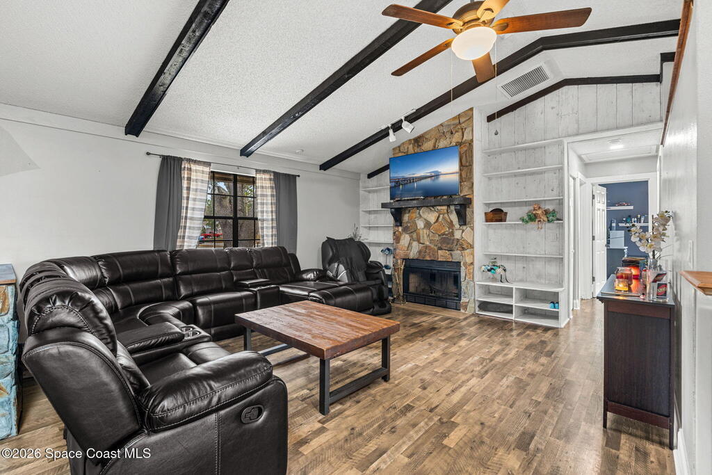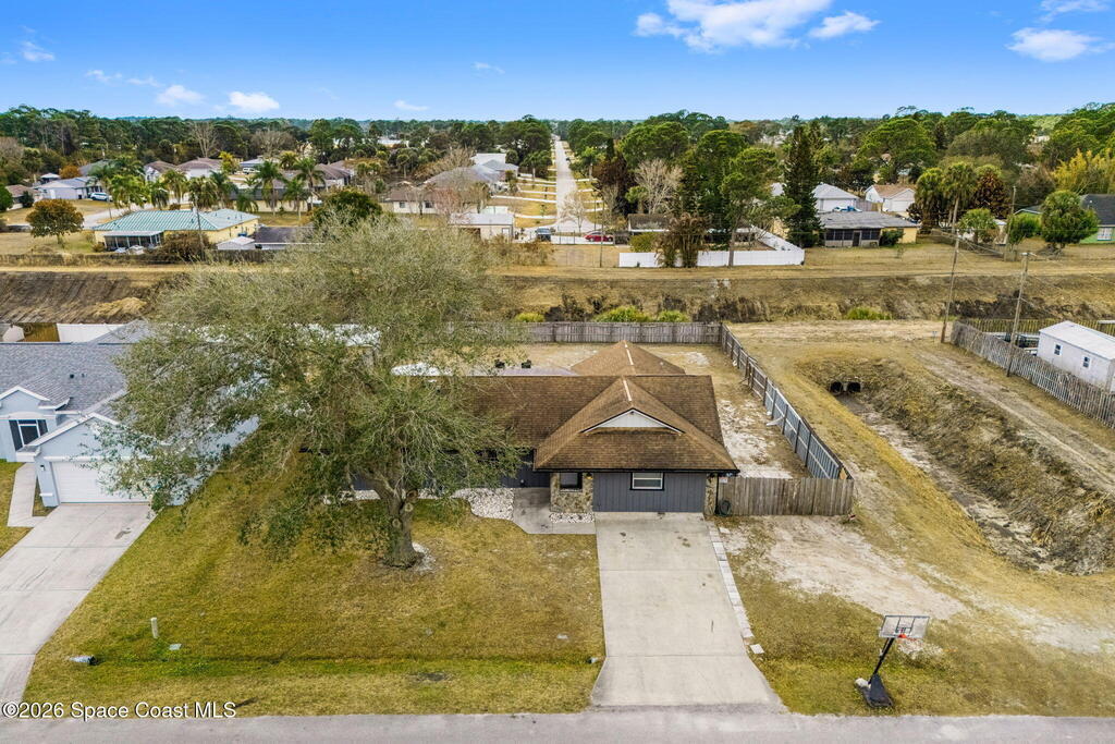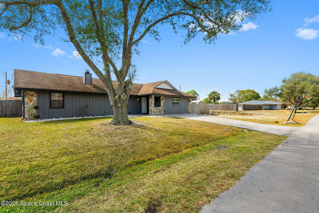 Versatile Palm Bay home offering a rare multigenerational living opportunity. The former 2-car garage has been converted into a private suite with a full bedroom, brand-new bathroom, and direct access through the oversized laundry room. With an existing utility sink, the space could easily serve as an in-law suite, guest quarters, home office, or future kitchenette/efficiency. The main living area features vaulted ceilings with exposed beams, a wood-burning fireplace, and an open layout ideal for everyday living and entertaining. The updated kitchen includes granite countertops, custom cabinetry, and smart storage. The spacious primary suite offers dual closets and sliders to a large screened porch. Major updates include a newer A/C, newer septic system, and some replaced windows. Enjoy a fully fenced, oversized yard backing to a canal for added privacy--plenty of room for a pool, pets, or entertaining. City water and NO HOA.