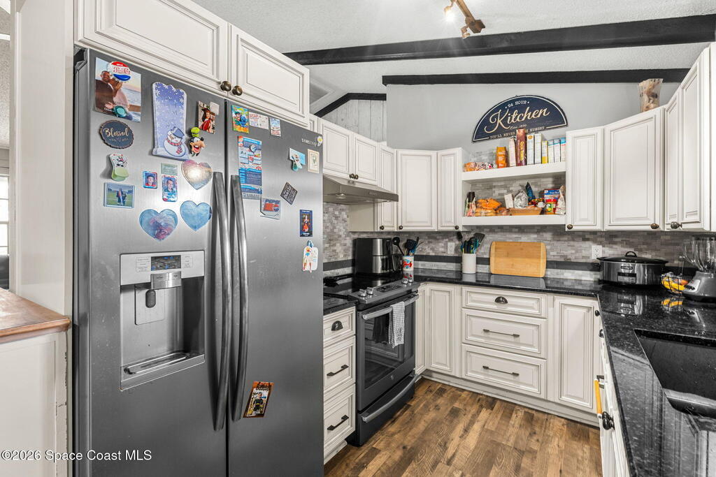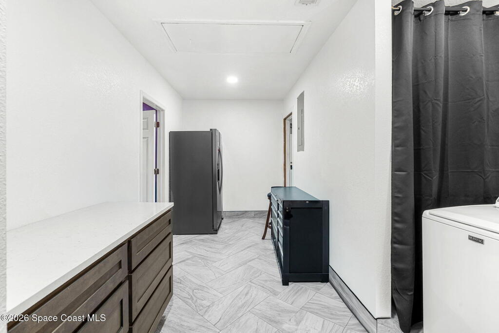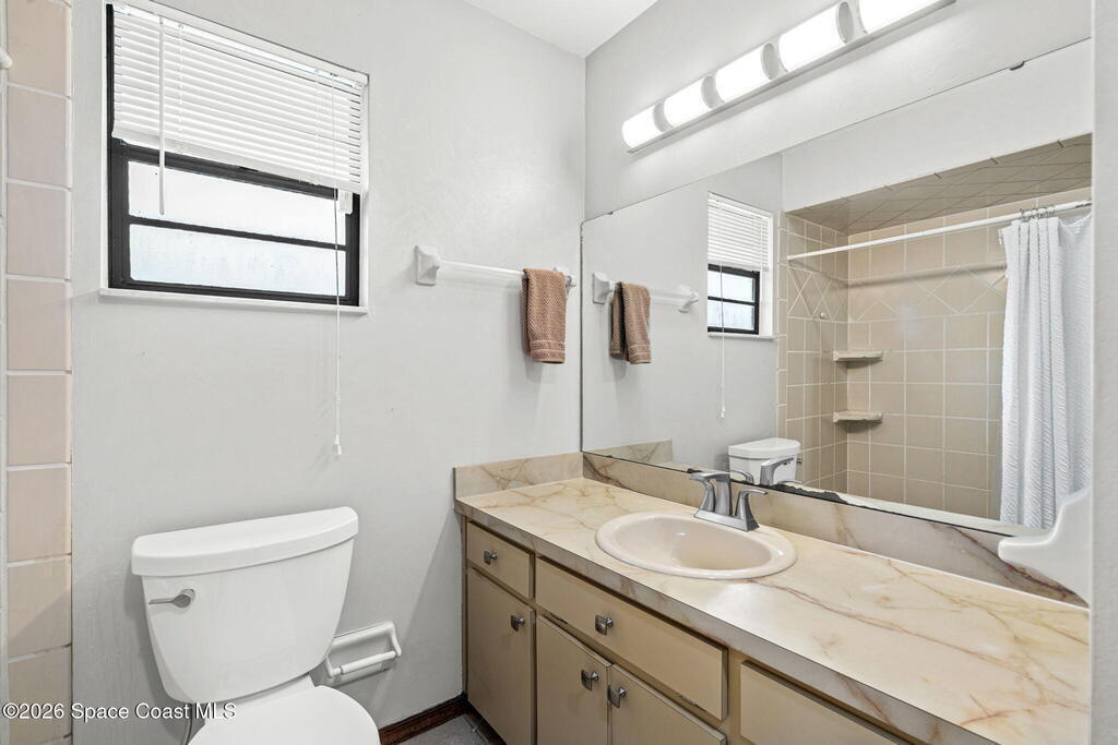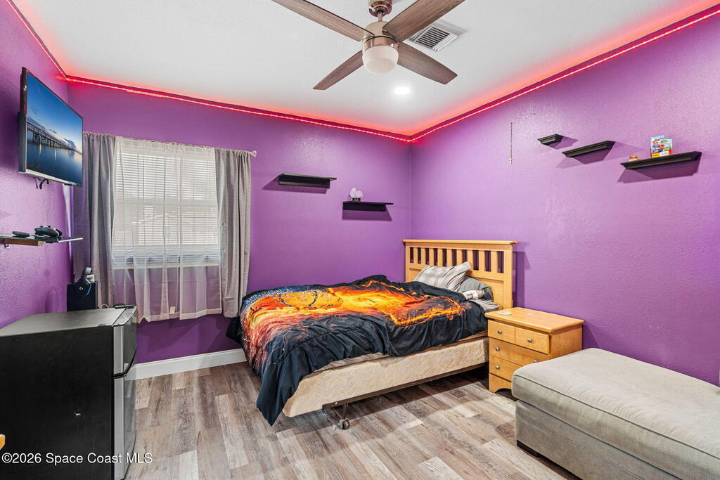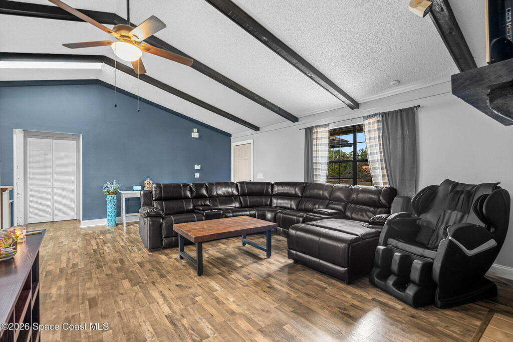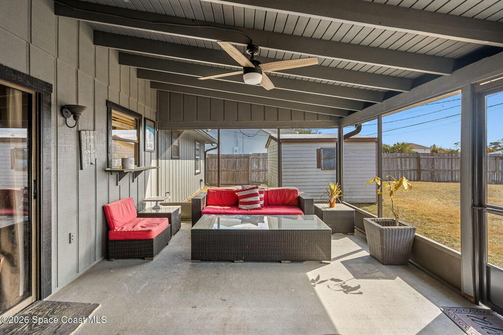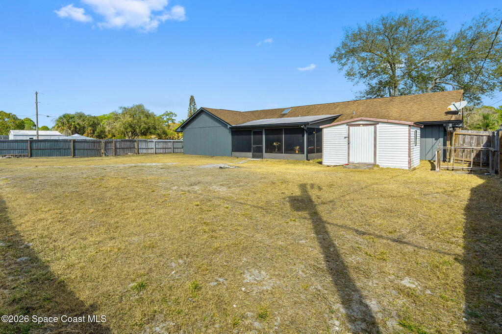 Versatile Palm Bay home offering a rare multigenerational living opportunity. The former 2-car garage has been converted into a private suite with a full bedroom, brand-new bathroom, and direct access through the oversized laundry room. With an existing utility sink, the space could easily serve as an in-law suite, guest quarters, home office, or future kitchenette/efficiency. The main living area features vaulted ceilings with exposed beams, a wood-burning fireplace, and an open layout ideal for everyday living and entertaining. The updated kitchen includes granite countertops, custom cabinetry, and smart storage. The spacious primary suite offers dual closets and sliders to a large screened porch. Major updates include a newer A/C, newer septic system, and some replaced windows. Enjoy a fully fenced, oversized yard backing to a canal for added privacy--plenty of room for a pool, pets, or entertaining. City water and NO HOA.