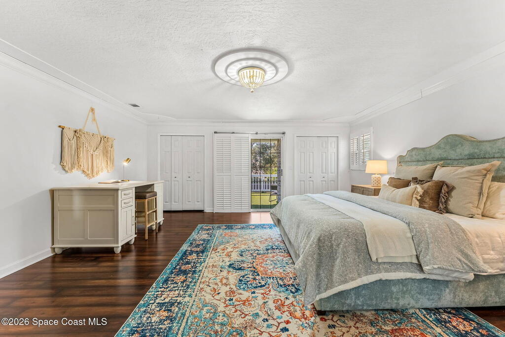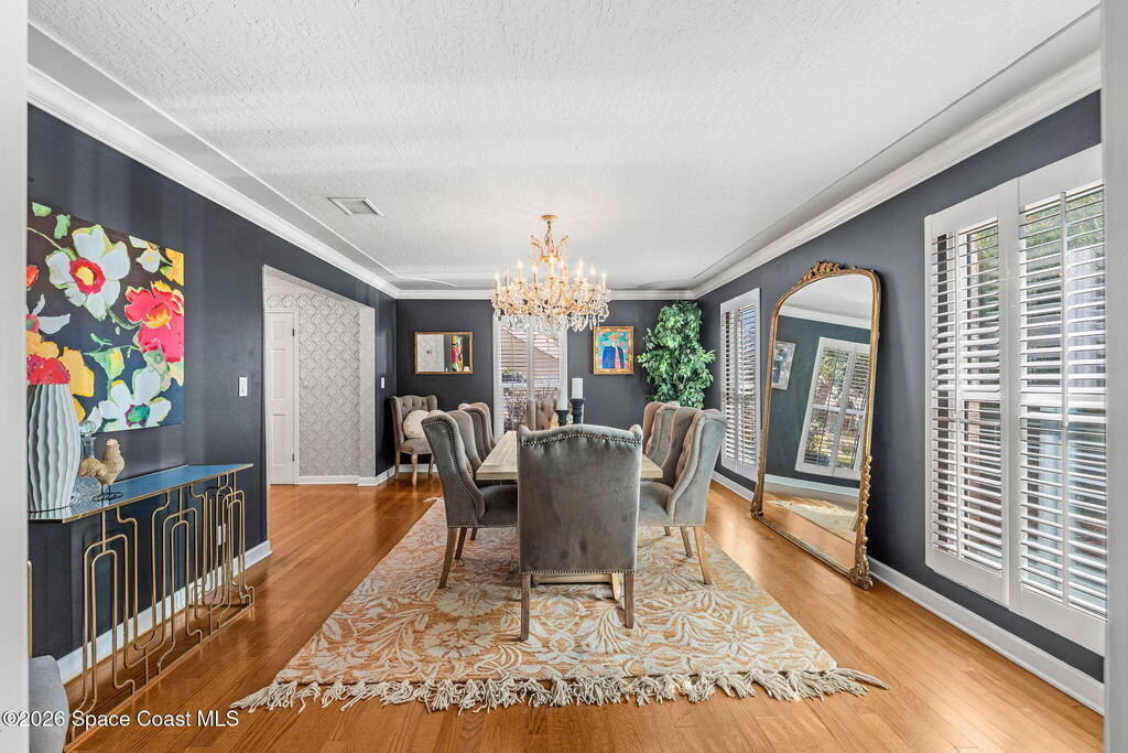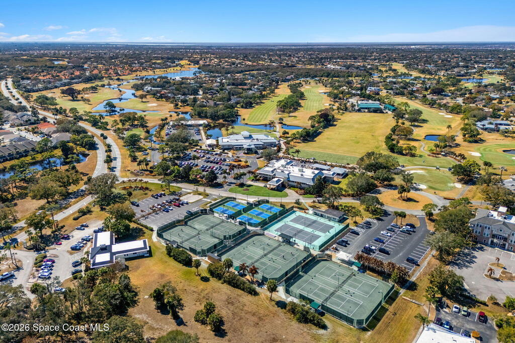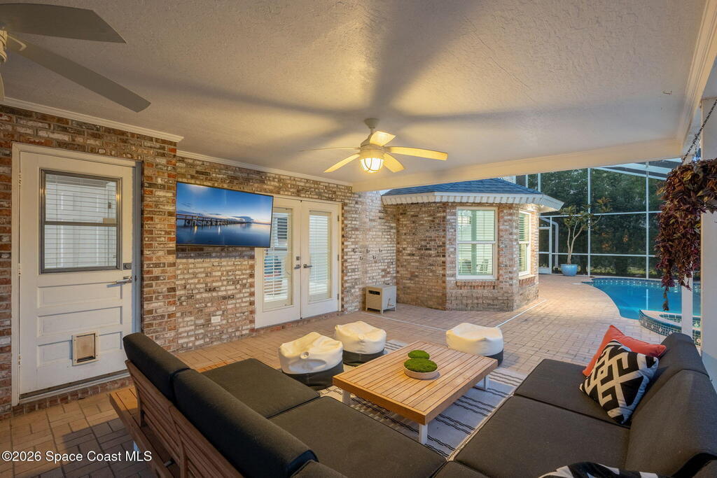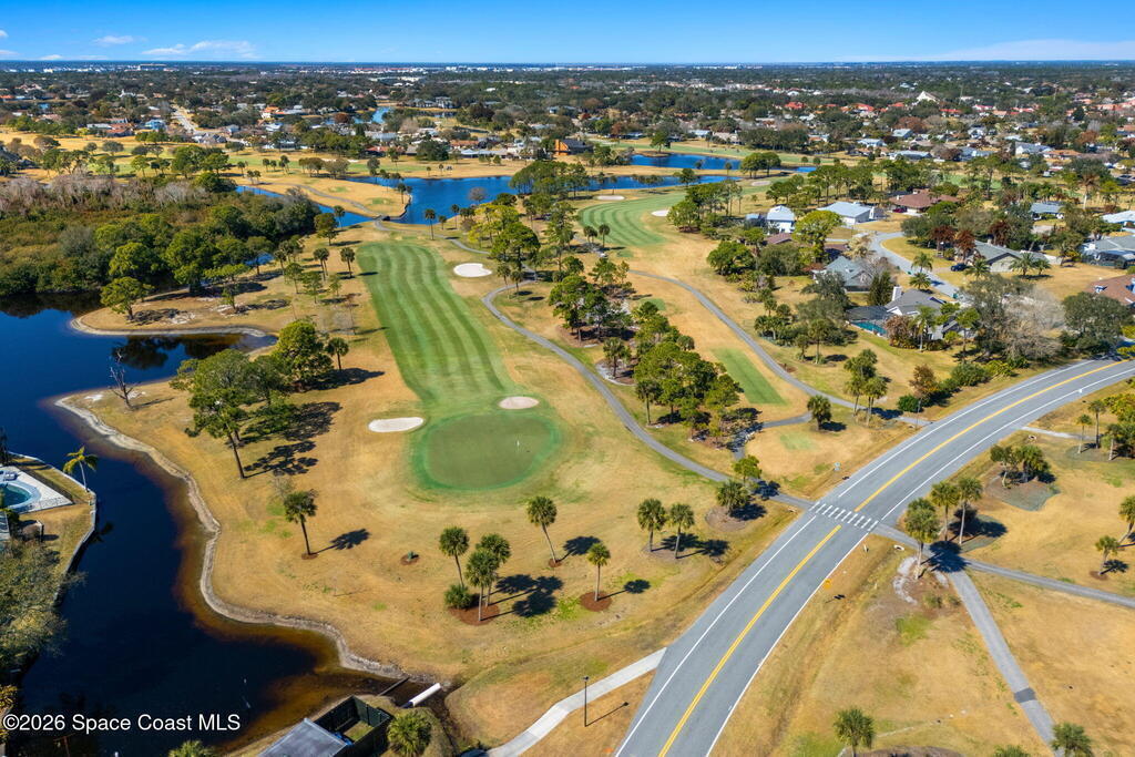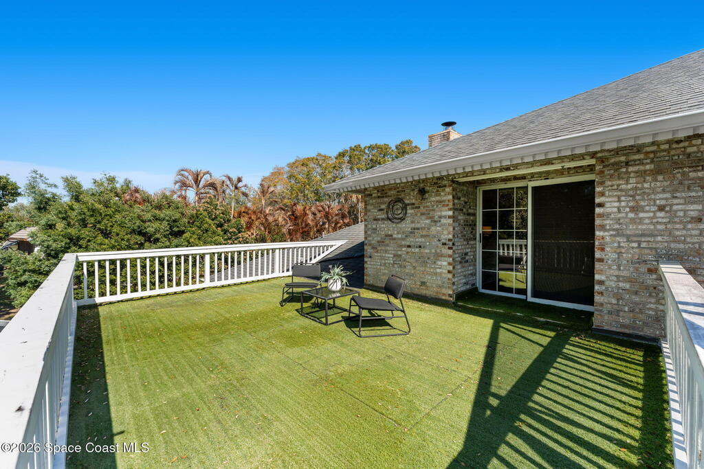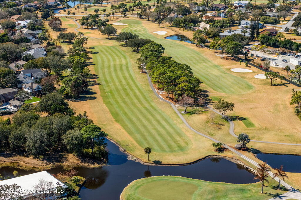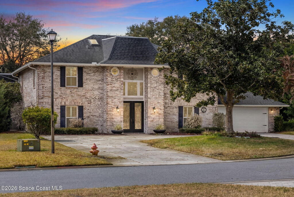 Located on a quiet cul-de-sac in Woodbridge at Suntree, this two-story brick French Provincial home sits directly adjacent to the 18th hole of Suntree Country Club. Offering 3,487 square feet, 5 bedrooms, and 5 full baths, the home blends timeless architecture with extensive 2022 updates throughout.Designed with family living and entertaining in mind, the home features hardwood floors, a wood-burning fireplace, and multiple gathering spaces that flow seamlessly to the expansive covered lanai and screened pool with gas-heated spa. The fully modernized kitchen showcases marble countertops, double wall ovens, an induction cooktop, butler's pantry, and an impressive entertainment extension complete with a 200-bottle wine refrigerator and keg fridge.Upstairs, the primary suite offers four custom closets and direct access to a private rooftop deck with panoramic views.