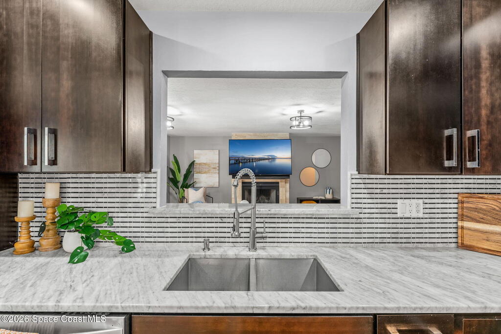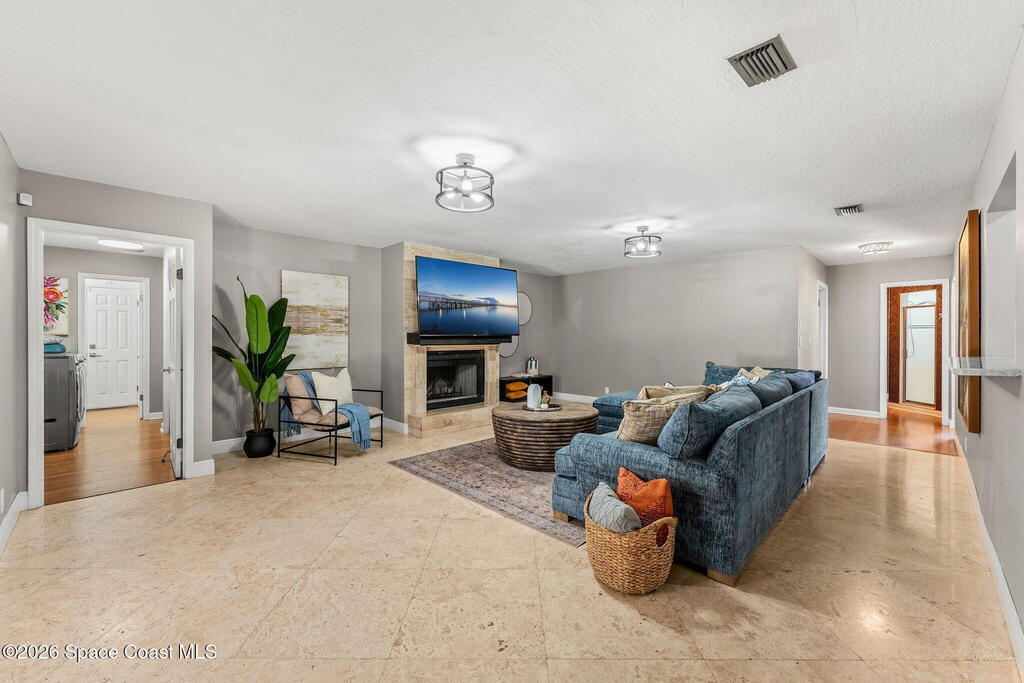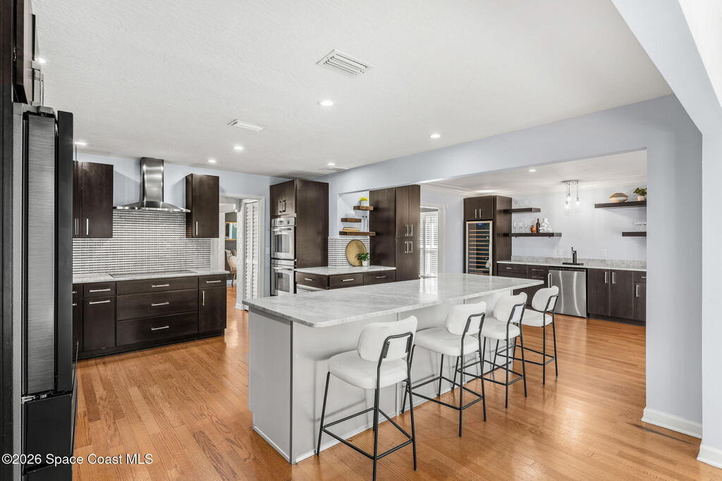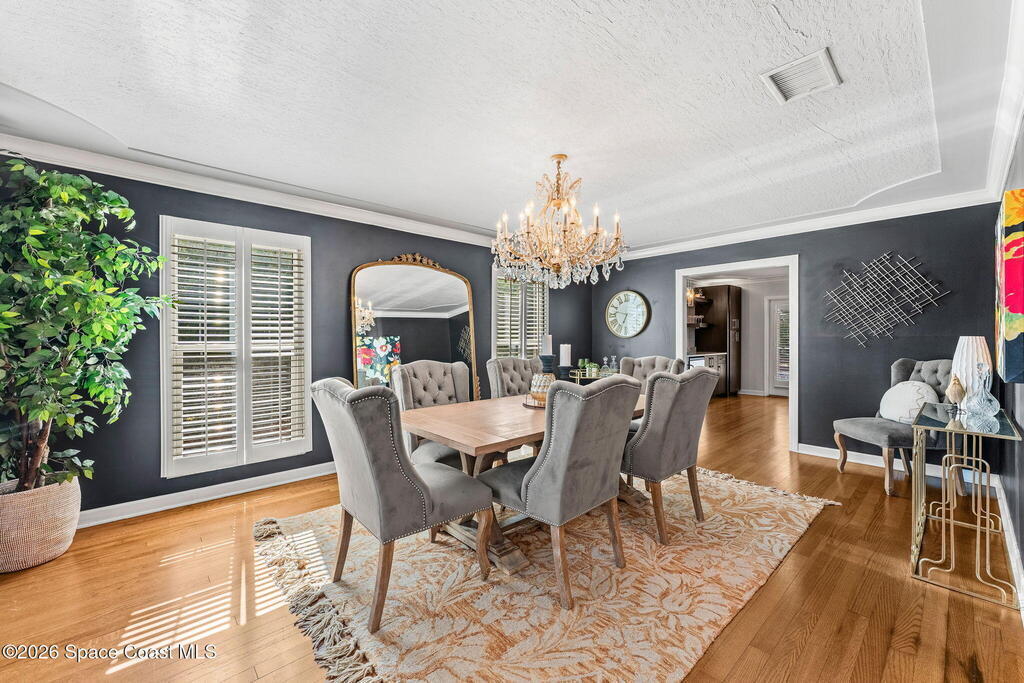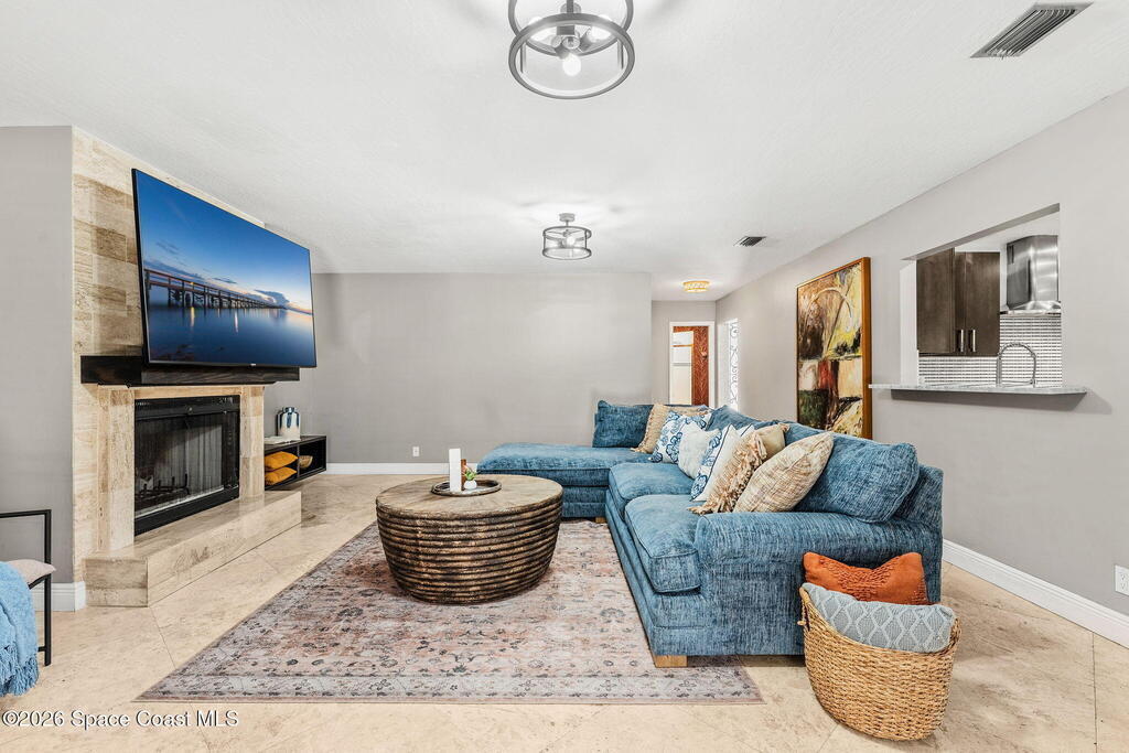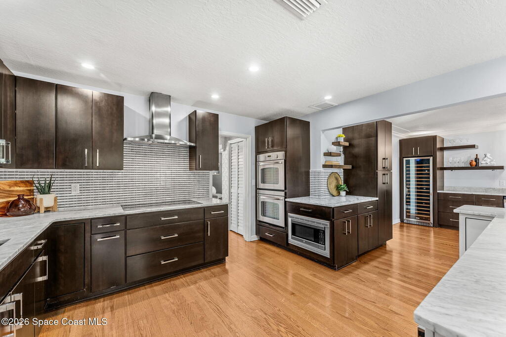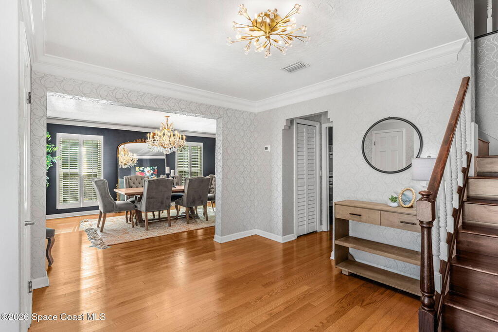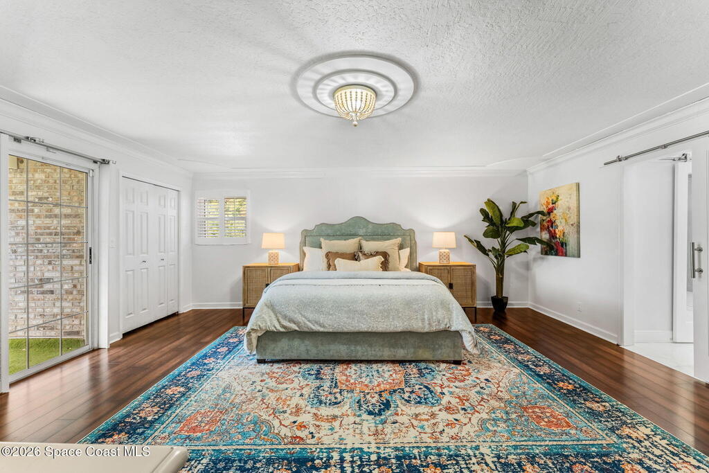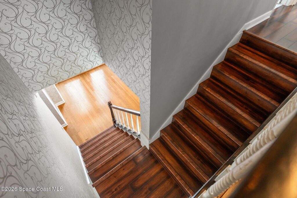Located on a quiet cul-de-sac in Woodbridge at Suntree, this two-story brick French Provincial home sits directly adjacent to the 18th hole of Suntree Country Club. Offering 3,487 square feet, 5 bedrooms, and 5 full baths, the home blends timeless architecture with extensive 2022 updates throughout.Designed with family living and entertaining in mind, the home features hardwood floors, a wood-burning fireplace, and multiple gathering spaces that flow seamlessly to the expansive covered lanai and screened pool with gas-heated spa. The fully modernized kitchen showcases marble countertops, double wall ovens, an induction cooktop, butler's pantry, and an impressive entertainment extension complete with a 200-bottle wine refrigerator and keg fridge.Upstairs, the primary suite offers four custom closets and direct access to a private rooftop deck with panoramic views.