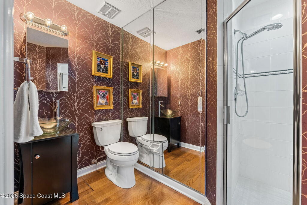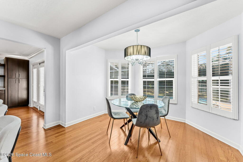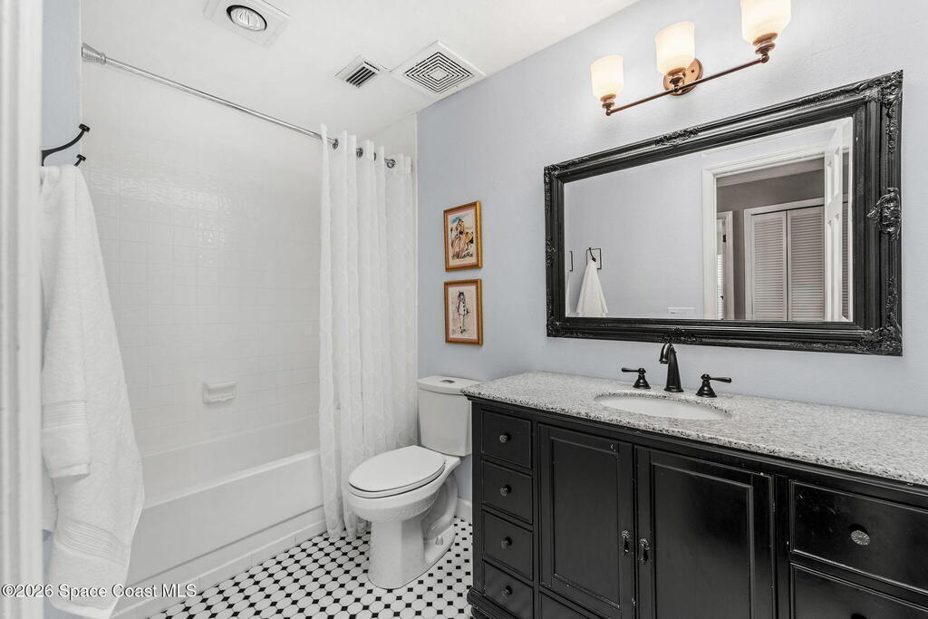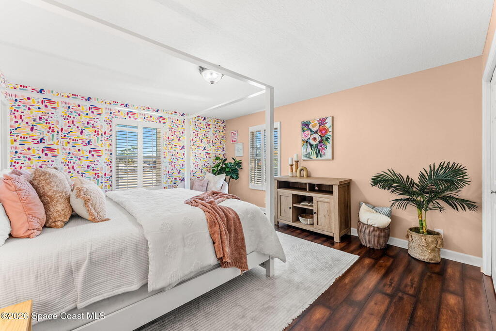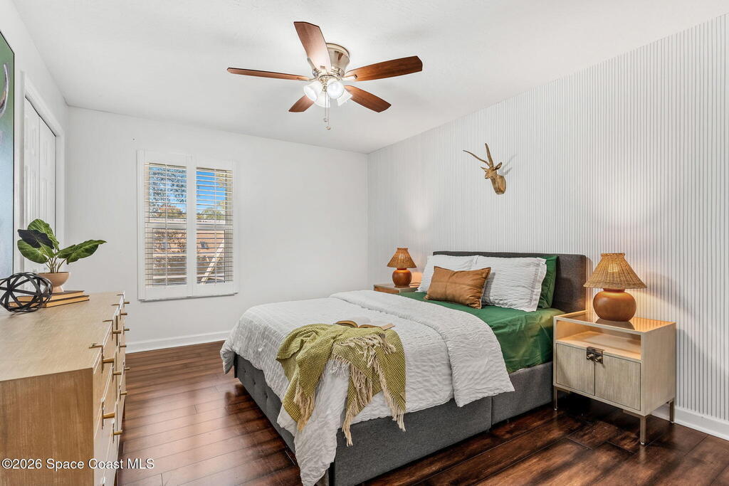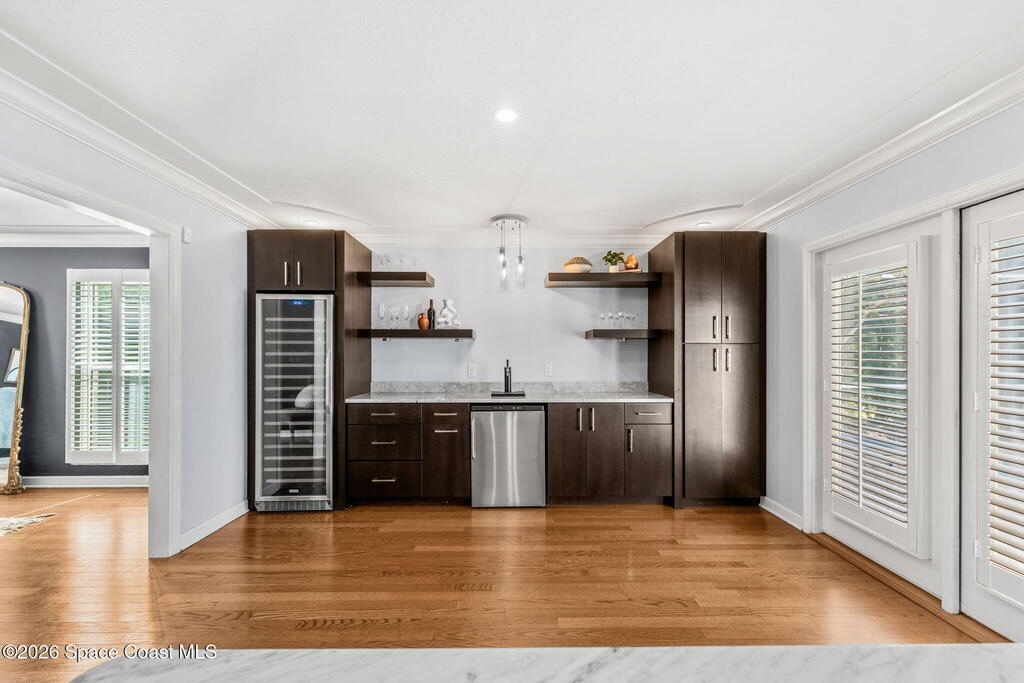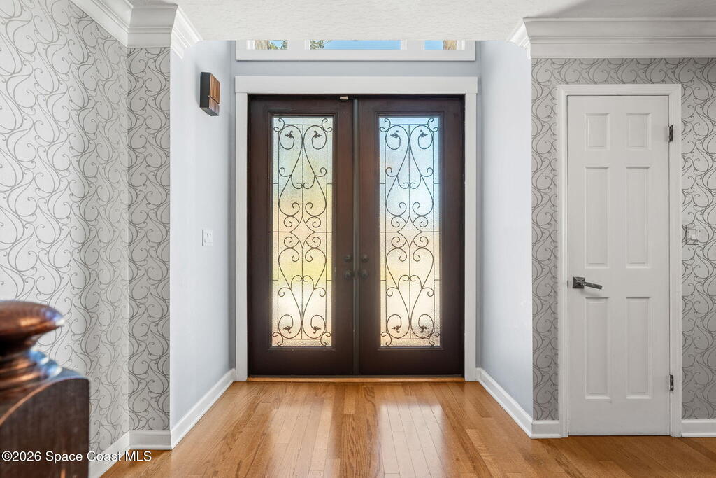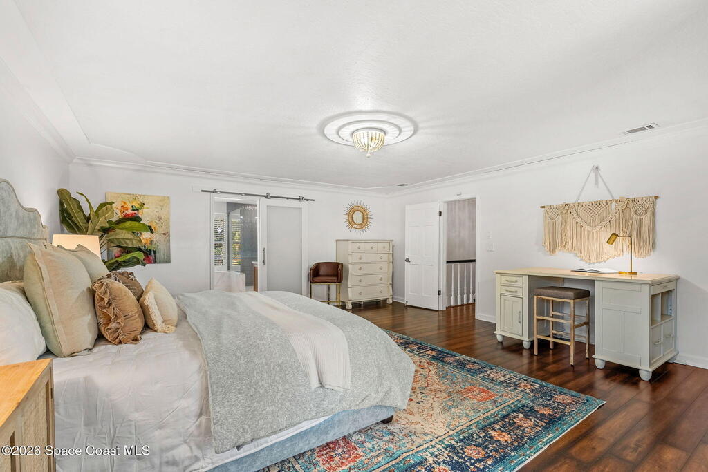 Located on a quiet cul-de-sac in Woodbridge at Suntree, this two-story brick French Provincial home sits directly adjacent to the 18th hole of Suntree Country Club. Offering 3,487 square feet, 5 bedrooms, and 5 full baths, the home blends timeless architecture with extensive 2022 updates throughout.Designed with family living and entertaining in mind, the home features hardwood floors, a wood-burning fireplace, and multiple gathering spaces that flow seamlessly to the expansive covered lanai and screened pool with gas-heated spa. The fully modernized kitchen showcases marble countertops, double wall ovens, an induction cooktop, butler's pantry, and an impressive entertainment extension complete with a 200-bottle wine refrigerator and keg fridge.Upstairs, the primary suite offers four custom closets and direct access to a private rooftop deck with panoramic views.