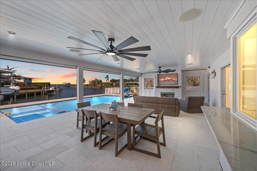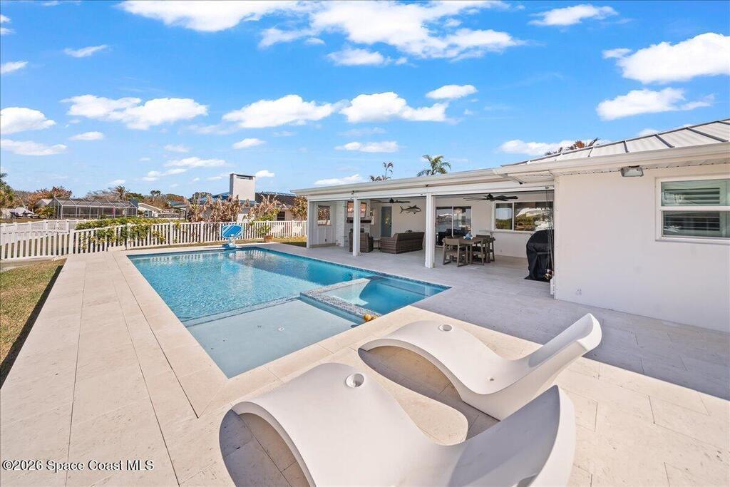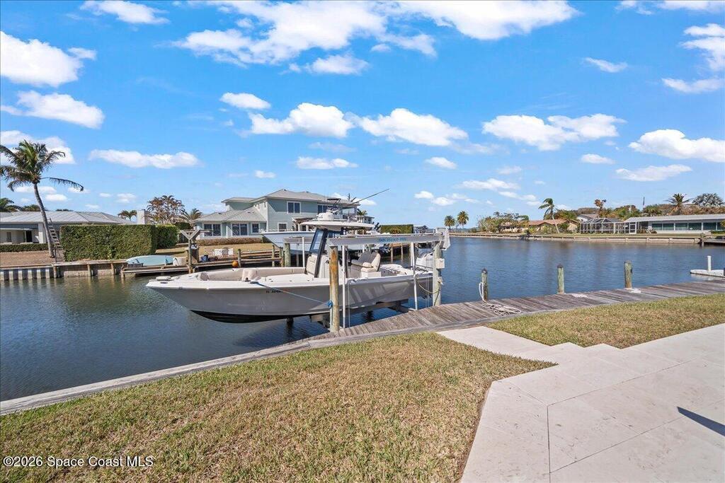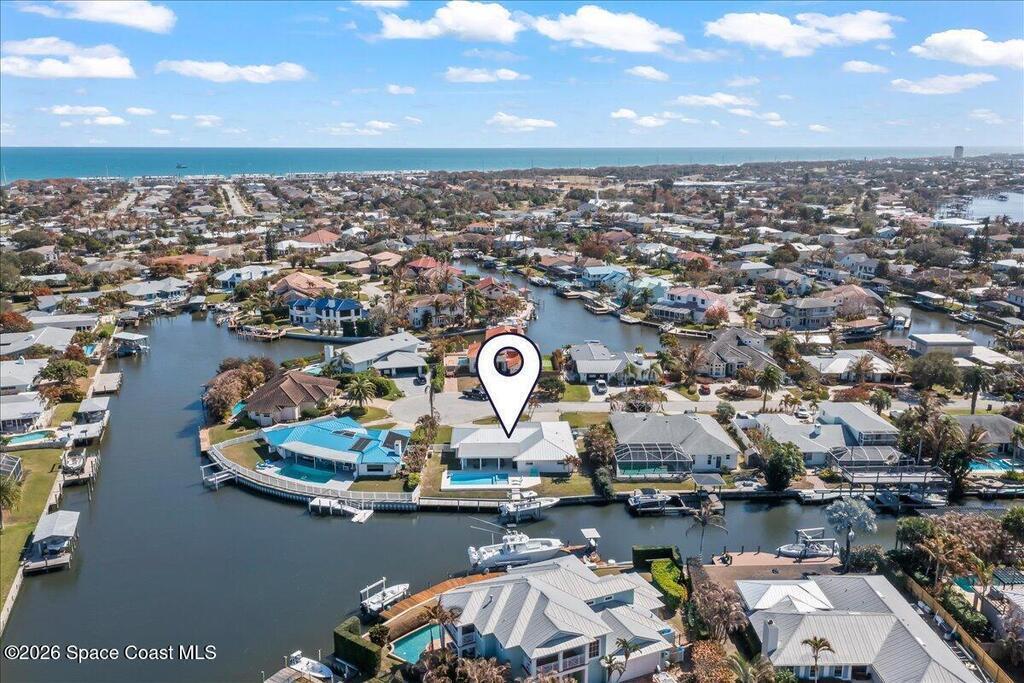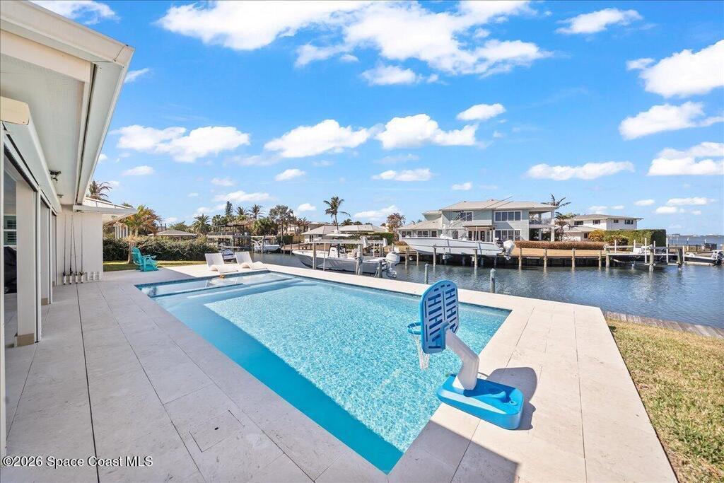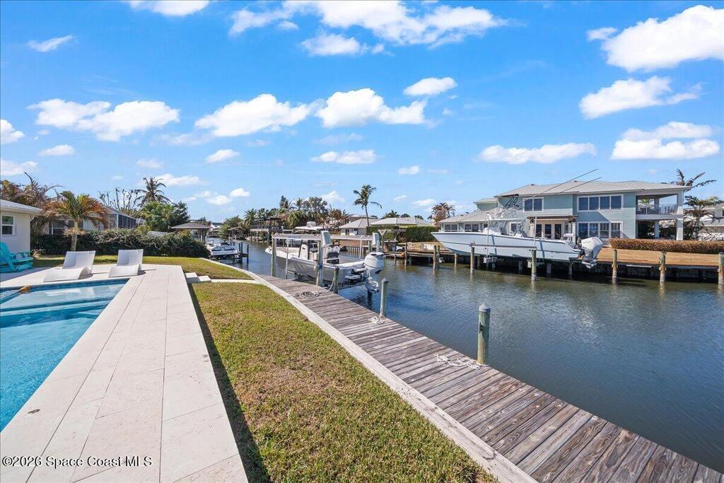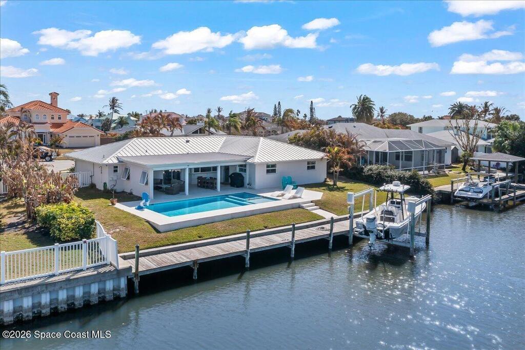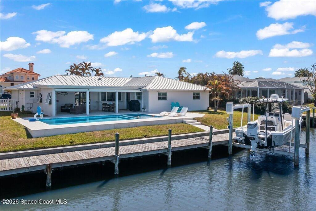 Perfectly positioned on a wide canal with direct access to the Indian River, this fully renovated Harbor East residence delivers effortless coastal living in one of Melbourne Beach's most desirable waterfront communities. Thoughtfully redesigned with a functional split floorplan, the home showcases timeless finishes, sunlit interiors, and seamless indoor-outdoor flow. The beautifully updated kitchen opens to spacious living areas, all oriented to capture tranquil water views. Step outside to a covered lanai with hurricane-rated roll-down shades, a newly built heated pool and spa, and a private dock ideal for boating enthusiasts. Major upgrades include impact windows and a new metal roof, offering both style and peace of mind. Zoned for highly regarded Gemini Elementary and just a short bike ride to the beach, Ocean Avenue's restaurants, and local shops, this move-in ready home embodies the very best of the Melbourne Beach lifestyle.