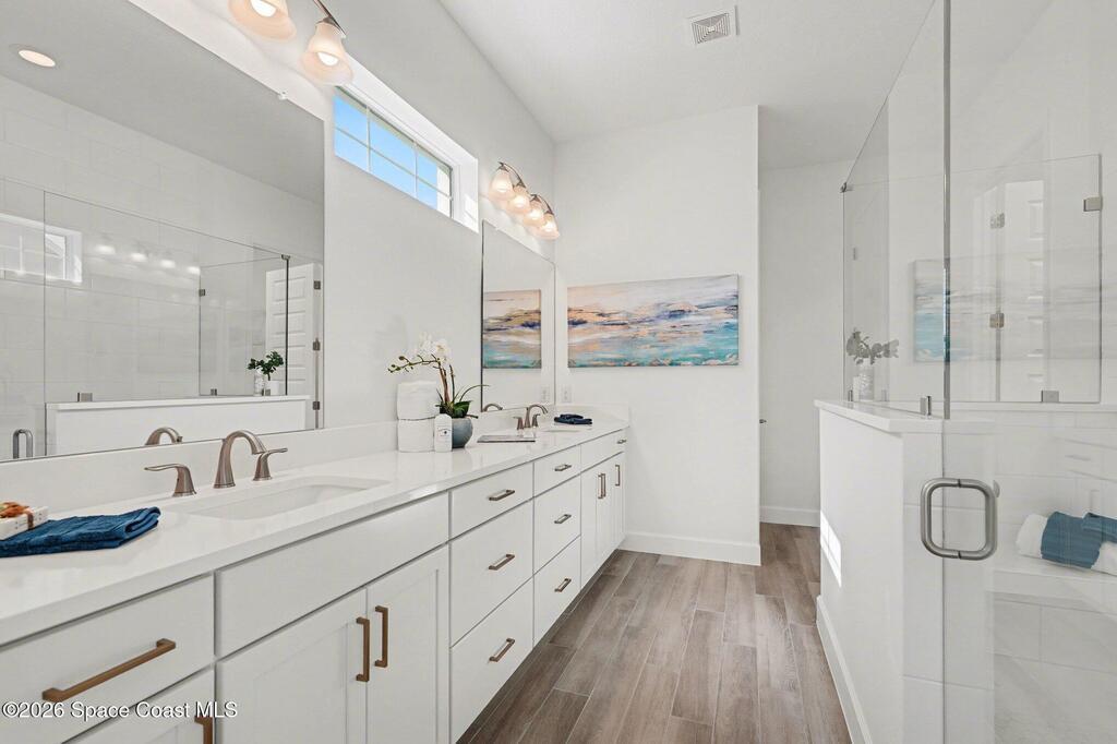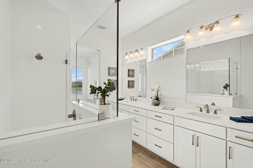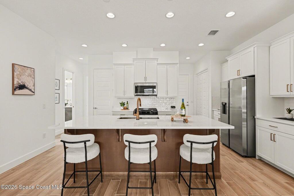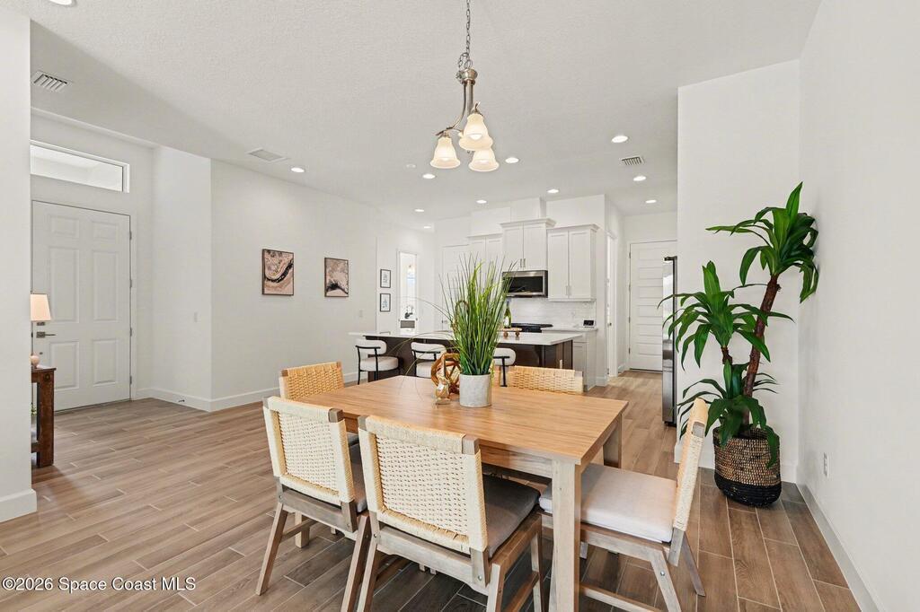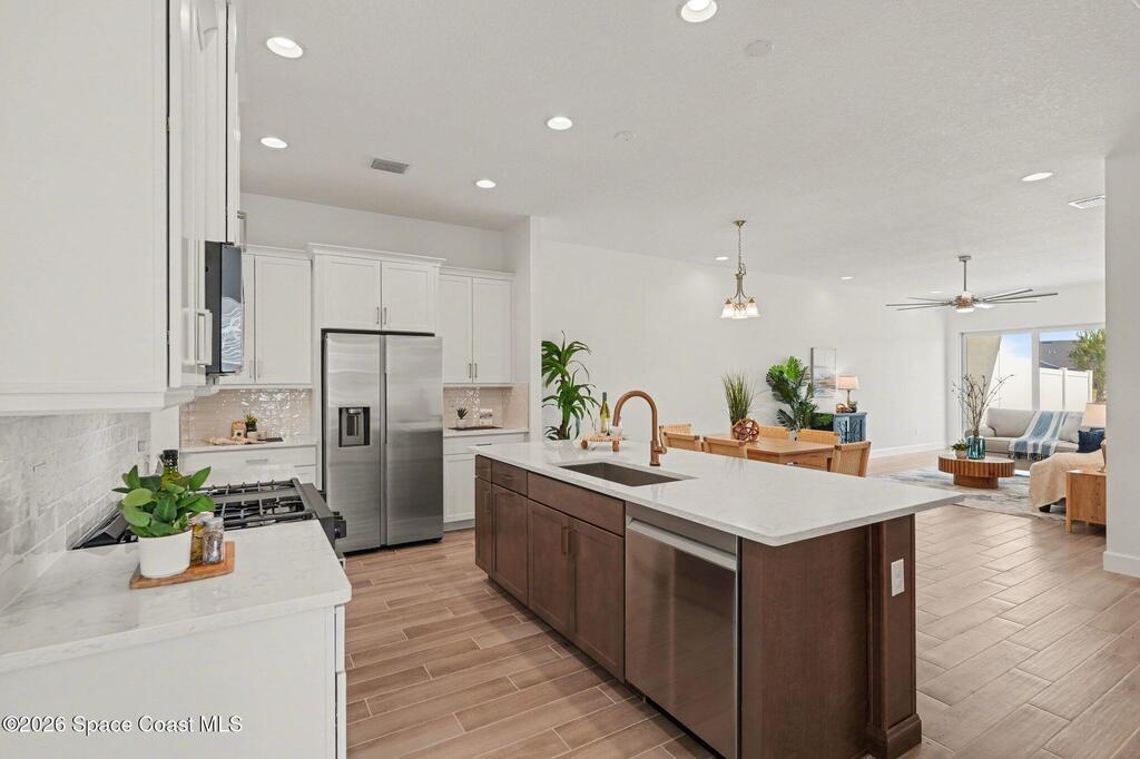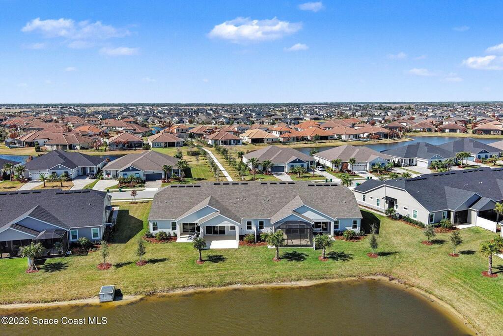 Enjoy stunning water views from the extended back porch of this never-lived-in 2025 Montgomery II end-unit townhome in sought-after Viera. This beautifully upgraded single-story home offers 3 BD, 2 BA, 2-car garage, blending modern design w/ easy living! Beautiful flooring throughout, including primary suite. The open kitchen, dining area & family room serves as the heart of the home, featuring quartz countertops, gas range, stainless-steel appliances--perfect for entertaining. Impact glass windows! OPEN & SPACIOUS FLOOR PLAN! Primary suite includes a large walk-in closet & shower w/ seat. HOA covers exterior maintenance, roof replacement, and lawn care for true low-maintenance living. Enjoy resort-style amenities at Addison Village, including pools, tennis, basketball, and pickleball courts- just a couple of blocks away! Conveniently located 45 minutes to Orlando & 20 minutes to the beach. Why wait to build when this upgraded, move-in-ready with premium views is ready for you now?!