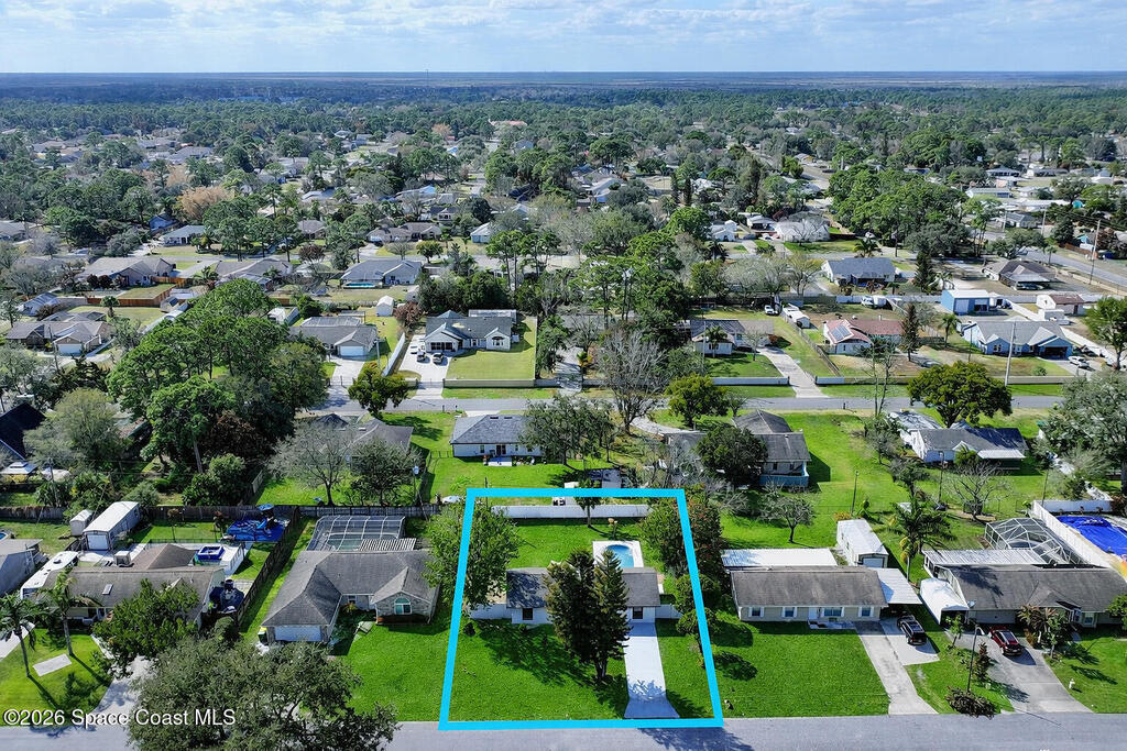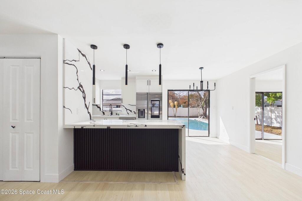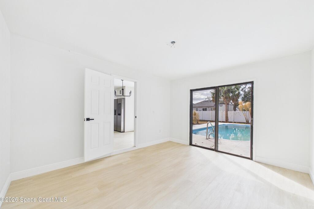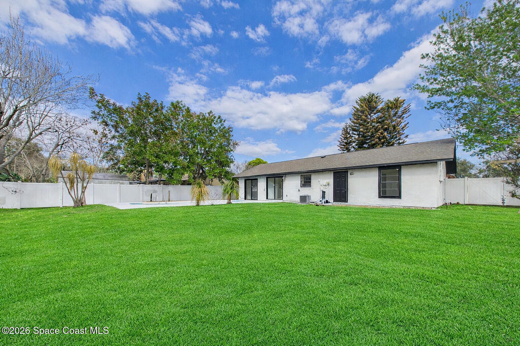 Fully renovated 4 bedroom, 2 bathroom POOL home in Port St. John offering move in ready living with modern and sleek finishes throughout. This single story concrete block home features an open concept floor plan, luxury vinyl plank flooring, new AC, and a stylish electric fireplace that anchors the main living area. The redesigned kitchen showcases custom cabinetry, Calacatta quartz countertops, Samsung stainless steel smart appliances, and pendant lighting over a large breakfast bar, ideal for gatherings. Both bathrooms are beautifully updated with clean, contemporary design. Roof replaced in 2018, with a partial re roof completed in 2025 during chimney removal, adding value and peace of mind. Enjoy Florida outdoor living in your fully fenced backyard with white PVC privacy fence, 28 ft in ground pool, new pool pump, and brand new exterior electrical panel, plus generous yard space for entertaining, pets, and play.