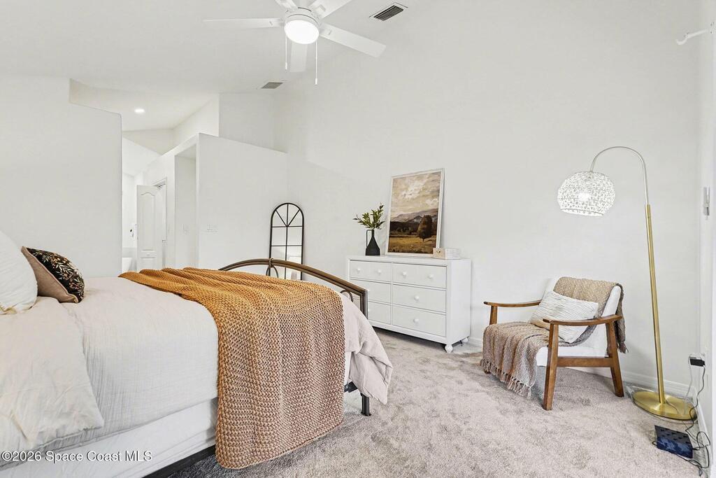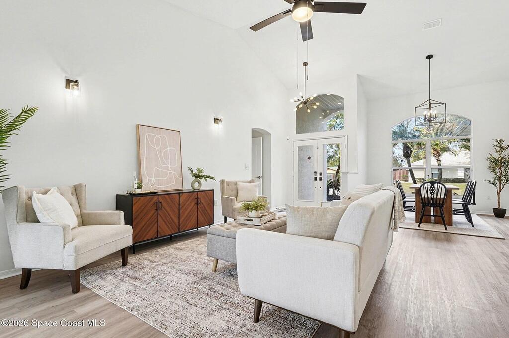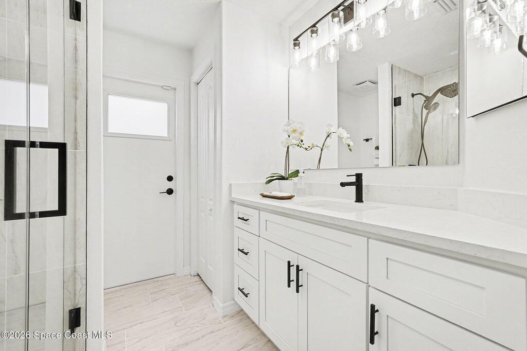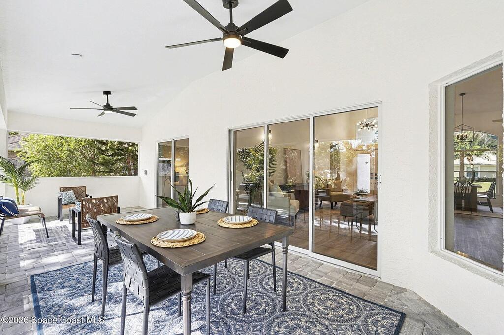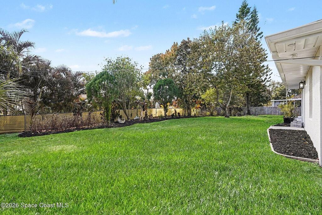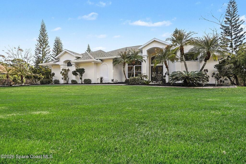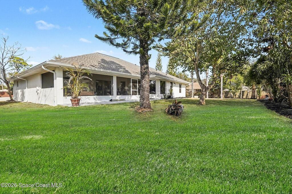 Located in the sought-after Lockmar Estates in Palm Bay along the Florida Space Coast, this beautifullyrenovated, move-in ready home sits on a spacious .34-acre lot. Enjoy elegant curb appeal with lush tropicallandscaping and an expanded 2-car garage. Inside discover an airy, light-filled open floor plan withcathedral ceilings, sliding doors, tall windows featuring 3 bedrooms, 2 bathrooms. The gourmet kitchenboasts quartz counters, stainless steel appliances, and custom cabinetry. The serene primary suite offers2 walk-in closets and a spa-like bath. Relax on the large screened lanai overlooking your private oasis.With a new roof (2023), thoughtful updates and close to top schools, shop