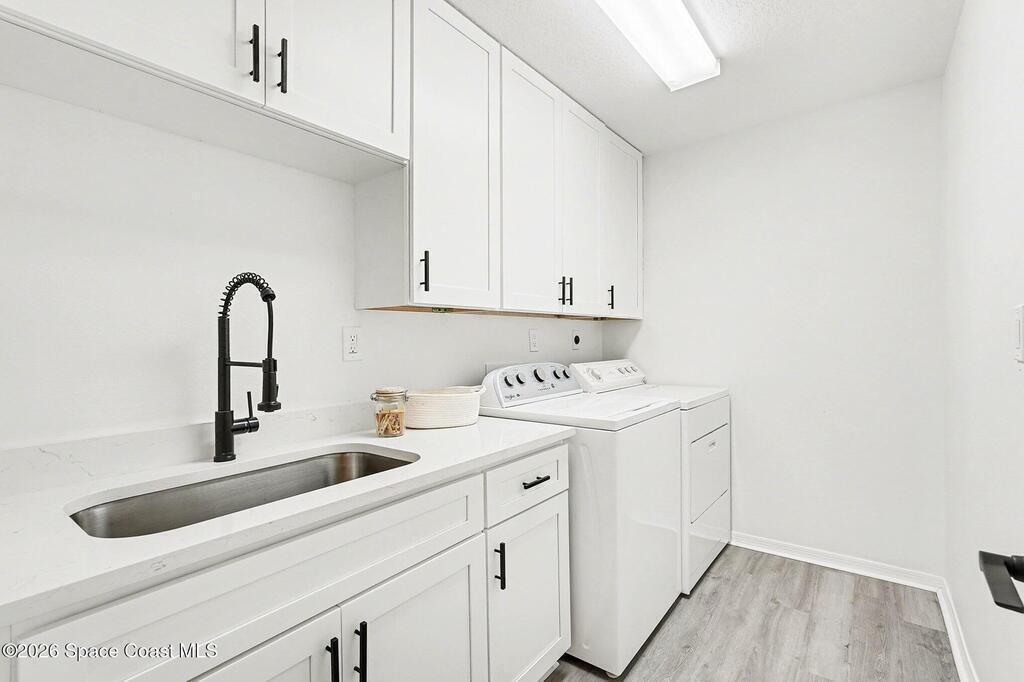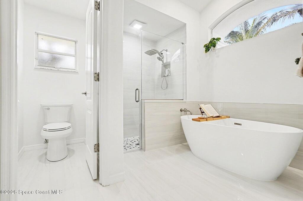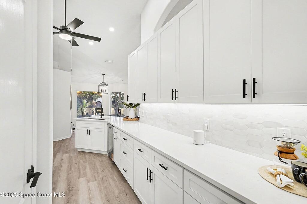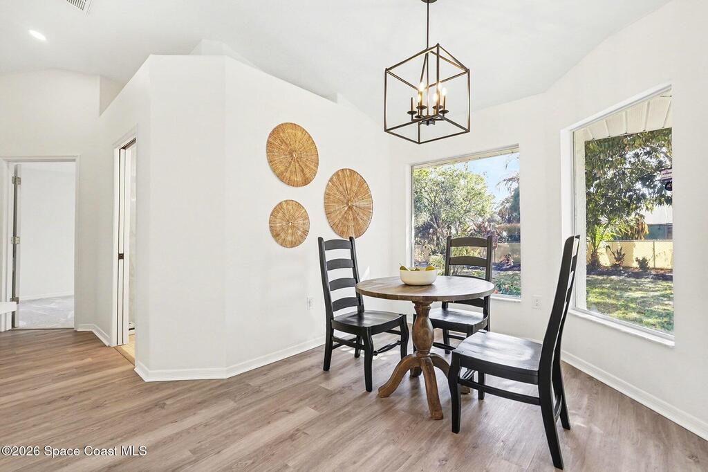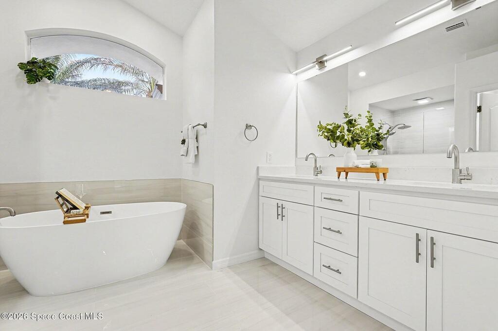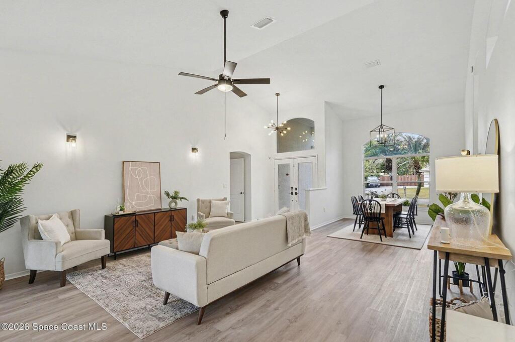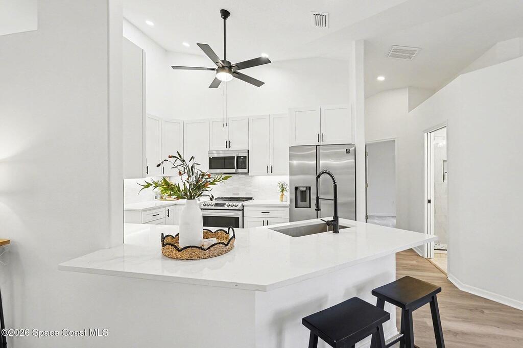 Located in the sought-after Lockmar Estates in Palm Bay along the Florida Space Coast, this beautifullyrenovated, move-in ready home sits on a spacious .34-acre lot. Enjoy elegant curb appeal with lush tropicallandscaping and an expanded 2-car garage. Inside discover an airy, light-filled open floor plan withcathedral ceilings, sliding doors, tall windows featuring 3 bedrooms, 2 bathrooms. The gourmet kitchenboasts quartz counters, stainless steel appliances, and custom cabinetry. The serene primary suite offers2 walk-in closets and a spa-like bath. Relax on the large screened lanai overlooking your private oasis.With a new roof (2023), thoughtful updates and close to top schools, shop