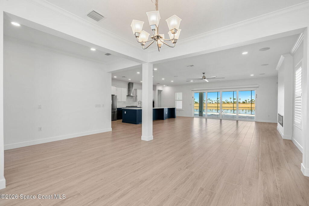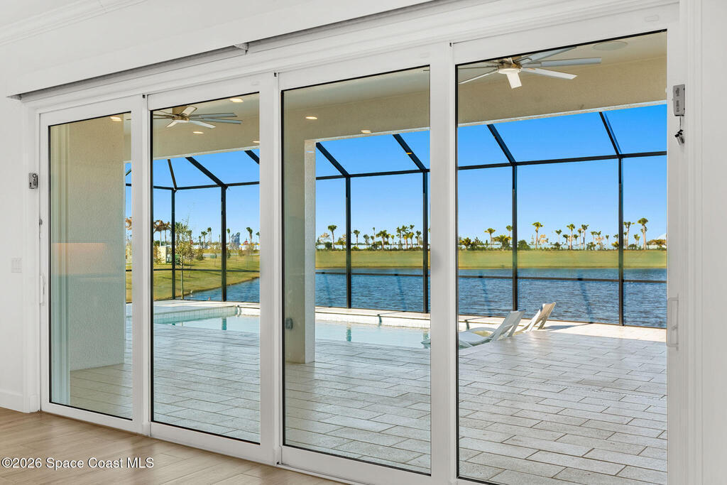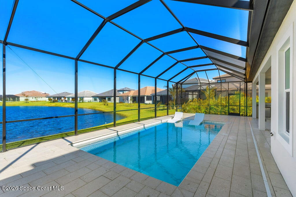 Beautiful,luxury home in Laurasia Viera's newest upscale community. Spectacular water views from this very open floor plan: heated salt water pool surrounded by spacious paver deck,covered lanai,summer kitchen,granite counters & grill. Upgrades:impact windows & sliders,plantation shutters,electric blinds for sliders,ceiling fans, surround sound inside & out,designer ceramic tile flooring. Gourmet kitchen:breathtaking 14 ft Cambria island & countertops,tons of cabinets,tile backsplashes,stainless steel appliances,opens to a huge living room with electric fireplace,TV hookup & spacious dining room. Dreamy primary bedroom; custom closet,bath in clean white: ample cabinets,double sink counter,luxurious tiled walk-in shower with glass panels. Just off the main area 2nd bedroom/office & bathroom.3rd bedroom,bath & custom closets. Downstairs laundry. UPSTAIRS:oversized bonus room, bedroom, full bath, closet,storage space. Too many upgrades to list, Come live the dream.