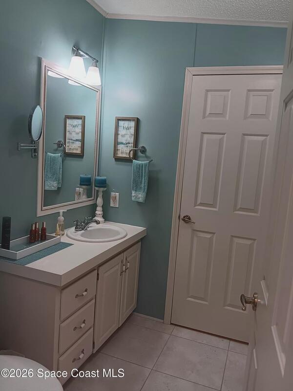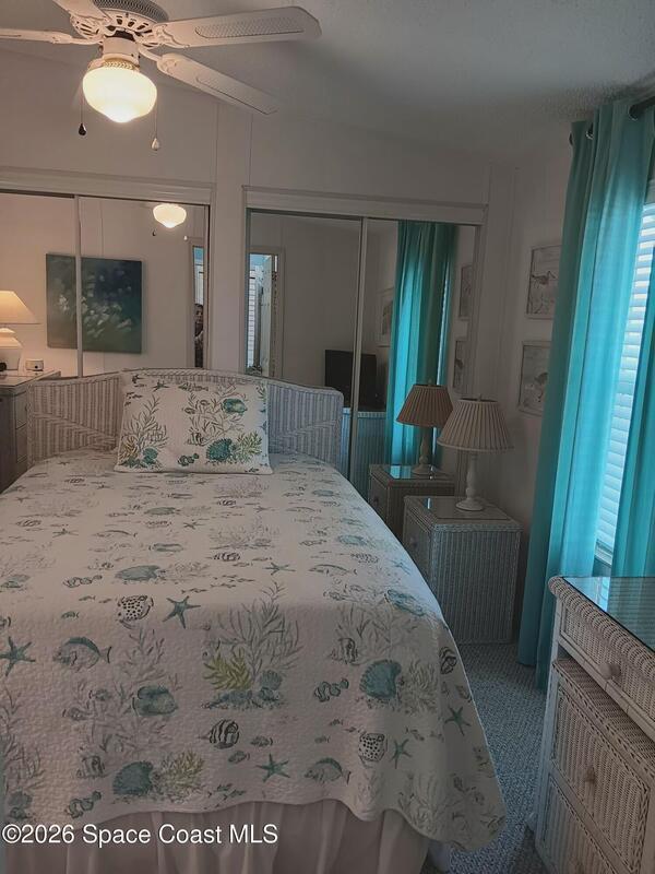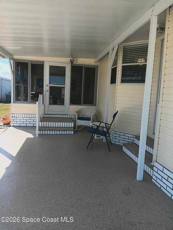 This well-kept home invites you in. Tastefully decorated in serene colors gives a tranquil atmosphere to relax and enjoy. Spacious living room has lots of light and built in book shelfs. It opens to a dining area with hutch. The kitchen island has a cook top stove. Built in oven and lots of cabinets and pantry. The kitchen opens to extra bonus room for den that leads out to enclosed porch and shed. Plenty of room for friends and family. Main bath opens to hallway and 2nd bedroom and has tub and shower. Spacious master bedroom suite has walk in closets and vanity area with double sinks and private shower. Roof is 6 yrs old. updated plumbing, AC is 2 yrs. old, newer flooring thru out and new washer and dryer. Home is located in the center of Barefoot Bay. Walk to all your favorite spots or golf cart.Barefoot Bay has 3 pools, Golf course, restaurants, parks and lots of recreational areas. Something for the whole family. Come enjoy and make this your dream home!