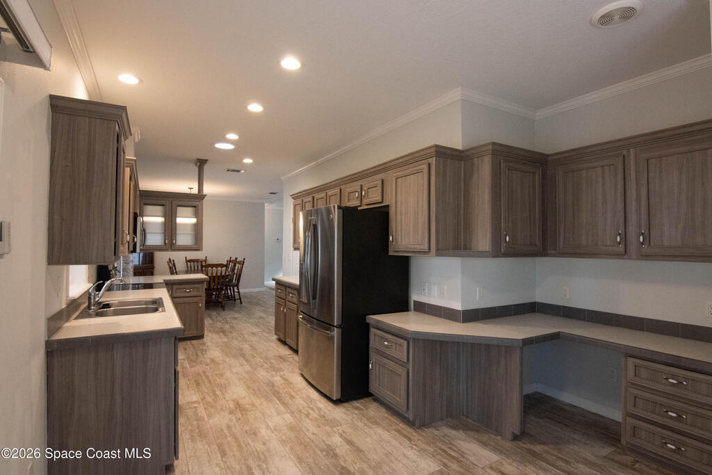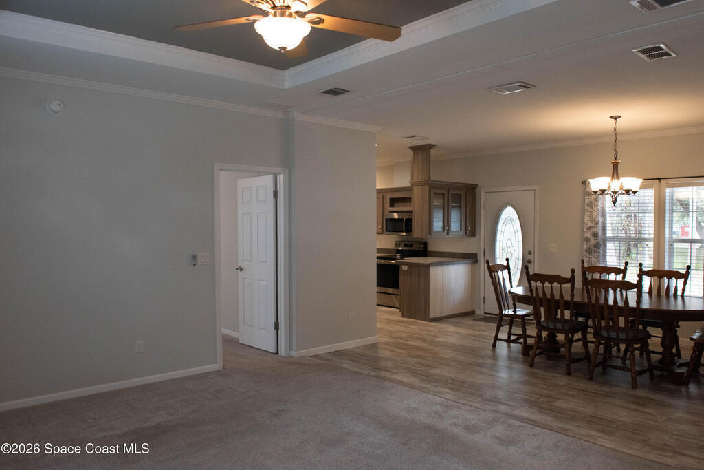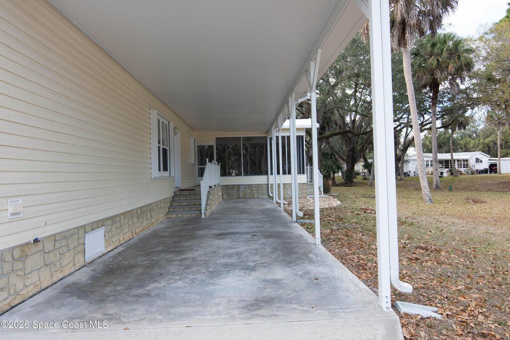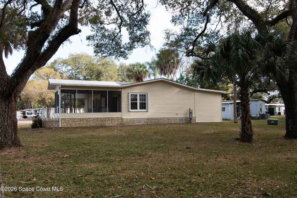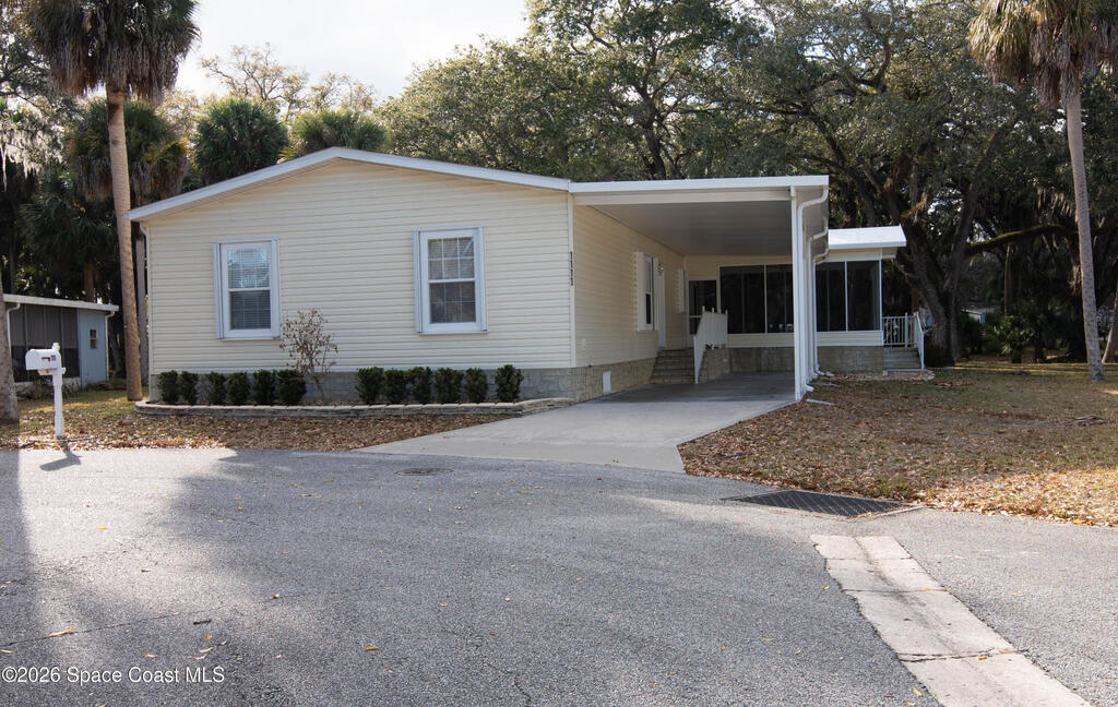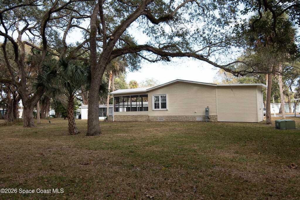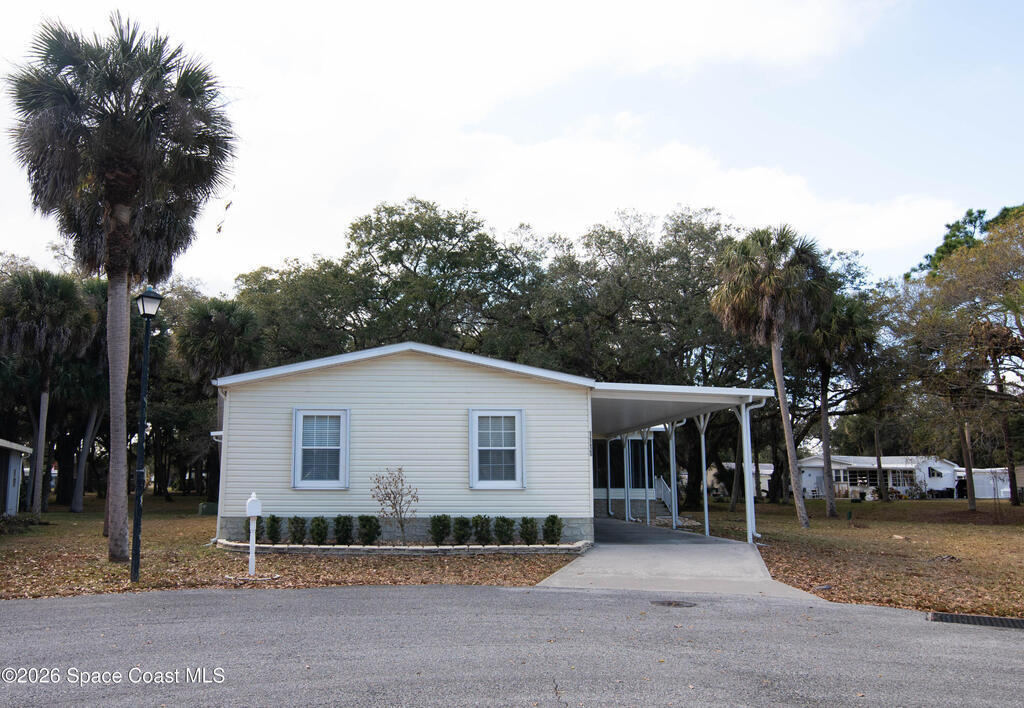 Welcome home to this charming 3-bedroom, 2-bath residence in the sought-after Port Malabar Holiday Park community of Palm Bay. Perfectly positioned on a premium cul-de-sac lot, this property offers peaceful views of a beautiful oak hammock, creating a private and naturally serene backdrop.Inside, you'll find durable vinyl flooring throughout the main living areas and plush carpeting in the bedrooms for added comfort. The spacious kitchen features sleek stainless steel appliances, a cozy breakfast nook, and a dedicated dining area--ideal for both everyday meals and entertaining guests.Step outside to enjoy the screened-in deck, where you can unwind and take in tranquil views and fresh Florida breezes--bug-free. A large storage shed with a convenient loft provides abundant space for tools, hobbies, golf cart, and extra storage.