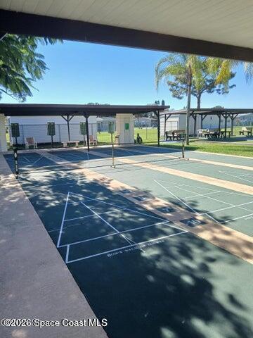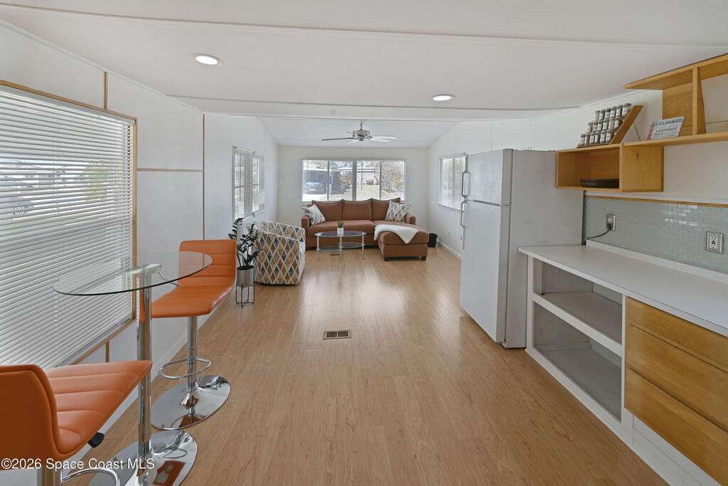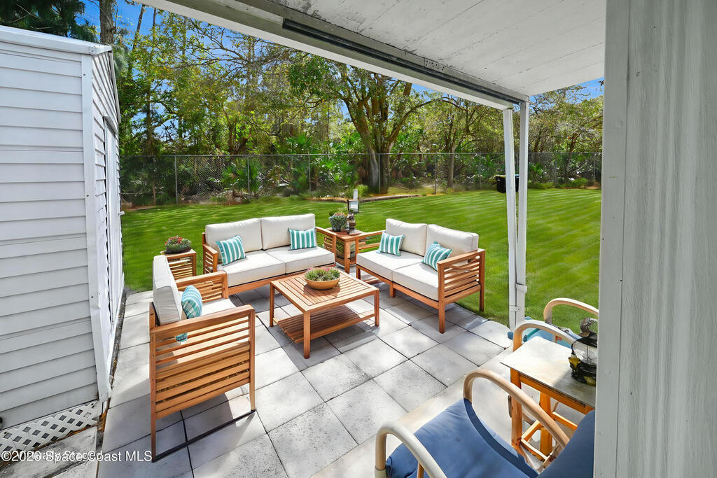 Stunning updated, furnished home in Holiday Park! Newer upgrades include a metal roof, water heater, updated bathroom, some new windows, subfloor, fresh paint, and new flooring. Property also features gutters and downspouts. The spacious living area features a vaulted ceiling and an open, inviting floor plan. The beautifully remodeled bathroom offers a rainfall showerhead, handheld wand, new toilet, vanity, and a stylish floating door. The large bedroom provides comfortable space to unwind. Home also has recessed lighting. Enjoy the Florida room with carpet and window A/C, plus a rear porch with large pavers and a storage shed, a welcoming covered front porch, and a long carport. The community offers two pools (heated and unheated), pool tables, darts, basketball, bocce, shuffleboard, a recreation hall, library, and more. Conveniently located near shopping, dining, entertainment, and quick access to I-95. Move-in ready and waiting for you!