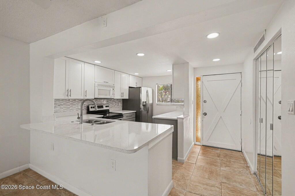 Wake up to breathtaking Banana River views in this beautifully updated condo, perfectly situated in a peaceful Cocoa Beach setting. This light-filled residence features a modern kitchen with quartz countertops, stainless-steel appliances, and stylish finishes throughout. The updated bathrooms include a Bluetooth-enabled mirror in the primary bath, while new flooring and fresh interior paint create a clean, move-in-ready feel. The flexible layout offers two comfortable bedrooms plus a spacious bonus room ideal for a home office, fitness area, or additional living space. The enclosed lanai with impact glass provides a serene spot to relax, entertain, or watch spectacular rocket launches over the river. Residents enjoy access to a community pool and dock, with potential boat slip availability, all just minutes from the Atlantic Ocean, local dining, shopping, and parks. Experience the perfect blend of modern updates, coastal lifestyle, and waterfront tranquility.HVAC-2024,Water Heater-2025