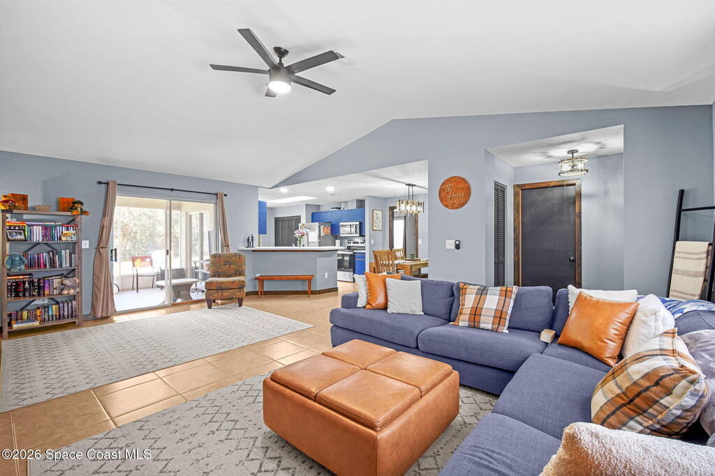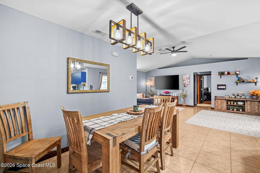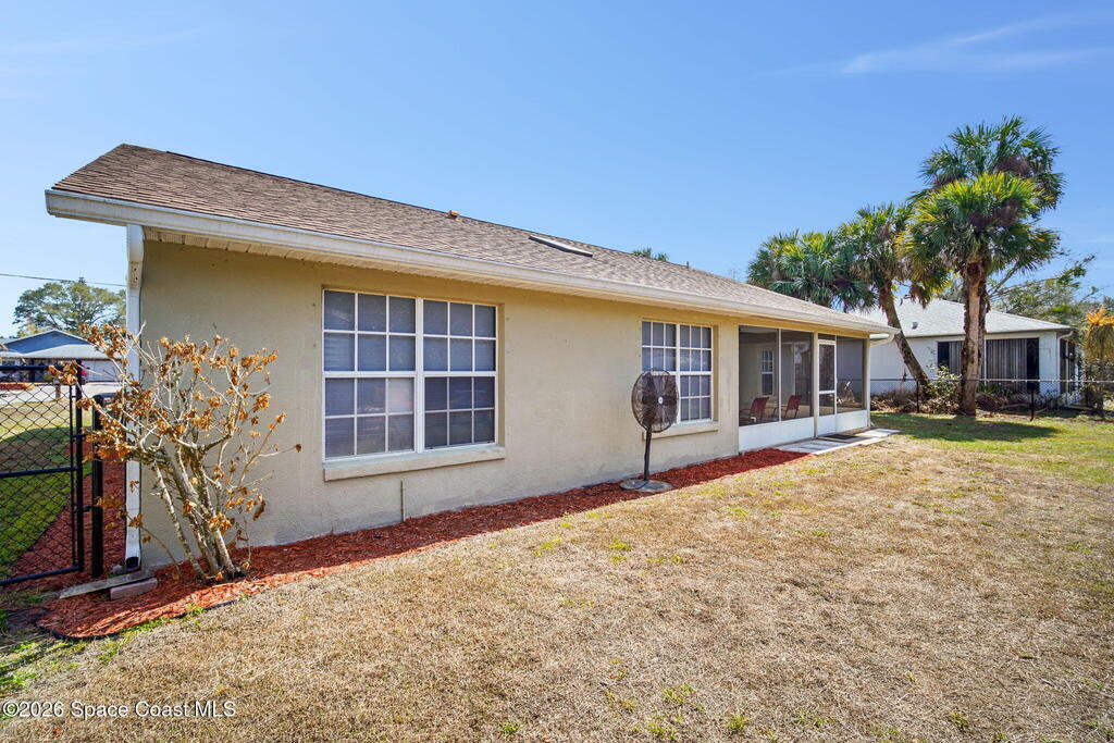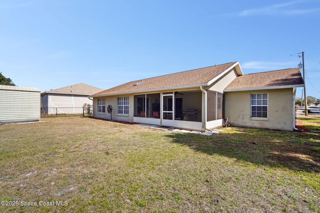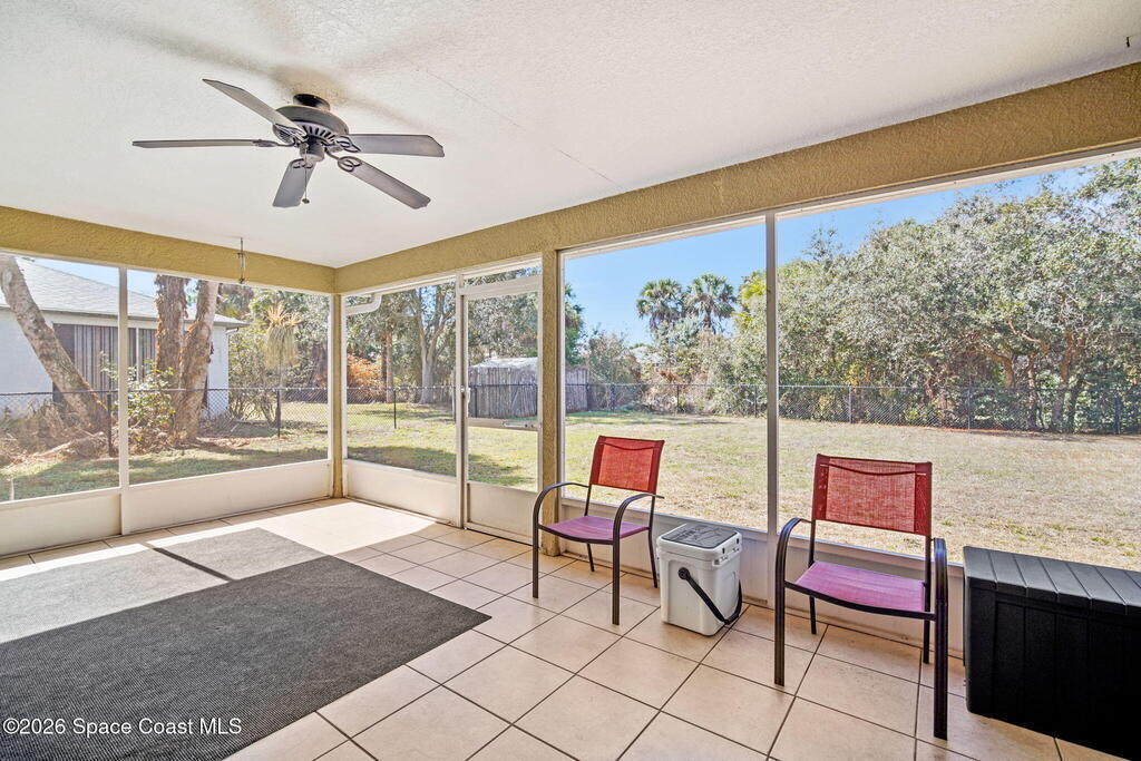 Beautiful, well maintained, home in Port St. John featuring a spacious open floor plan with great room, dining area, and bright eat-in kitchen with sliders to a screened lanai. Recent upgrades include popcorn ceiling removal, fresh interior paint, new lighting, and modern ceiling fans throughout. Split-bedroom layout offers a generous owner's suite with walk-in closet, double vanities, and walk-in shower. Tile and laminate flooring provide easy maintenance. Relax on the lanai overlooking a large fenced backyard with powered garden shed, no rear neighbors, and plenty of room for a pool. Roof 2021, AC 2019, range 2023. Convenient to schools and I-95 for easy access to Orlando and area attractions. Move-in ready and waiting for you!