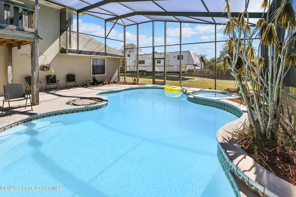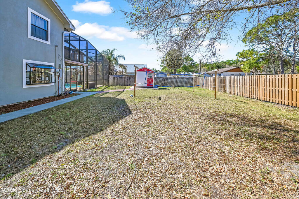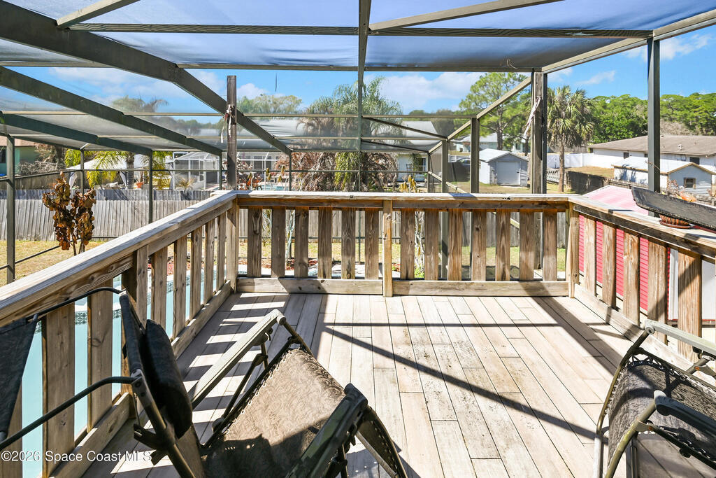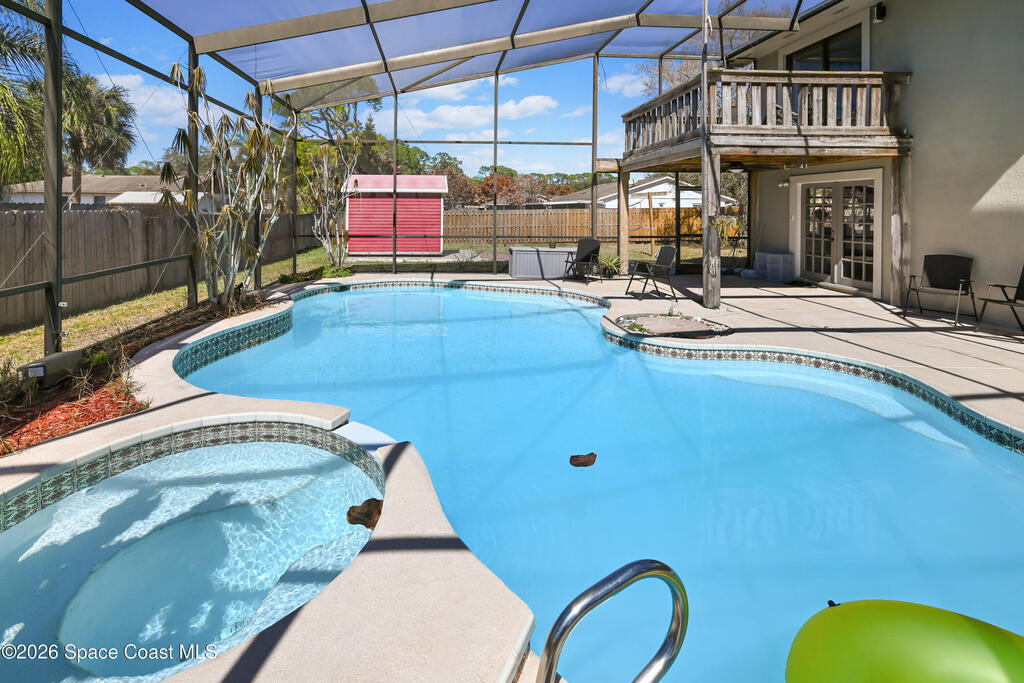 Stunning pool home in desirable Lockmar Estates, within walking distance to Lockmar Elementary School. Beautiful home features a spacious living room with a soaring vaulted ceiling & a striking floor-to-ceiling stone fireplace. The kitchen offers an island, pantry, tile backsplash, and French doors leading to the screened-in pool. The dining area includes a charming bay window. Tile flooring runs throughout the downstairs, with laminate wood flooring in the bedrms and bathrm. Downstairs bathrm has been stylishly updated & features dual sinks. Upstairs primary suite includes a private balcony overlooking the screened pool, along with a bathrm featuring a dual sink vanity and a walk-in closet. Enjoy a large driveway with an extension for extra parking. The red shed conveys. Situated on a spacious 0.36-acre lot, this home is ready for a new family. Conveniently located near Target, Publix, and a variety of dining, shopping, & entertainment options, w/ quick access to I-95. View today!