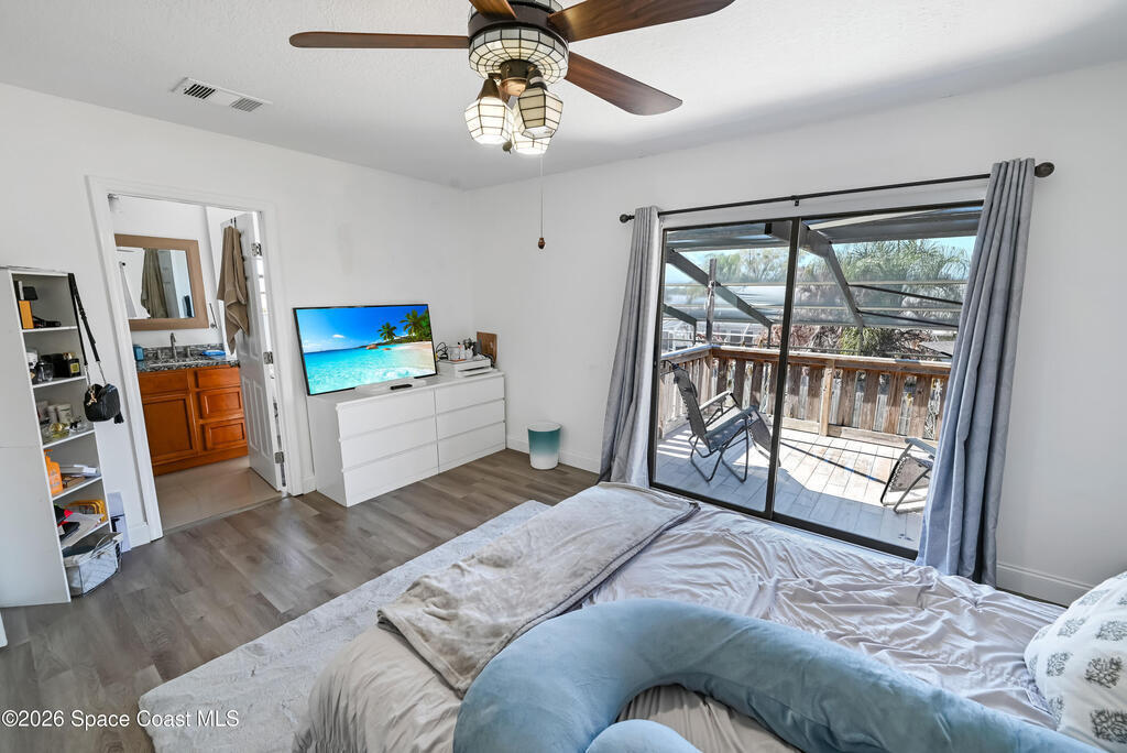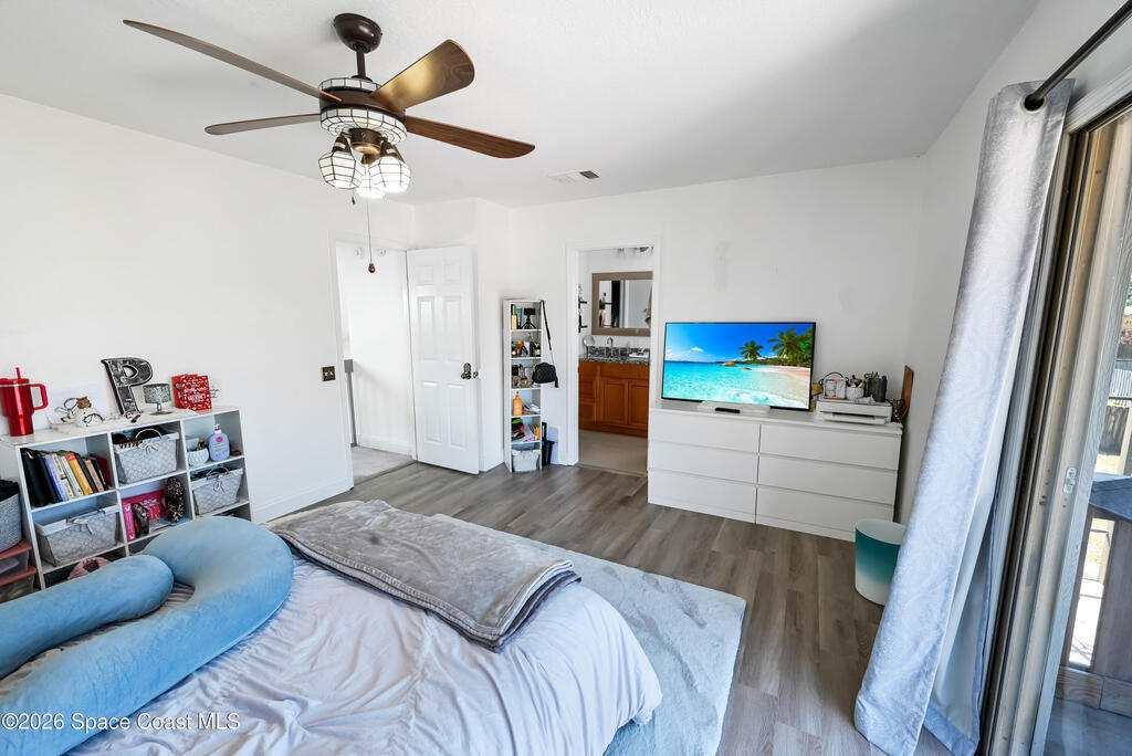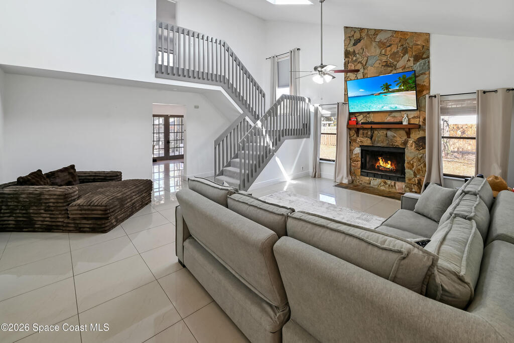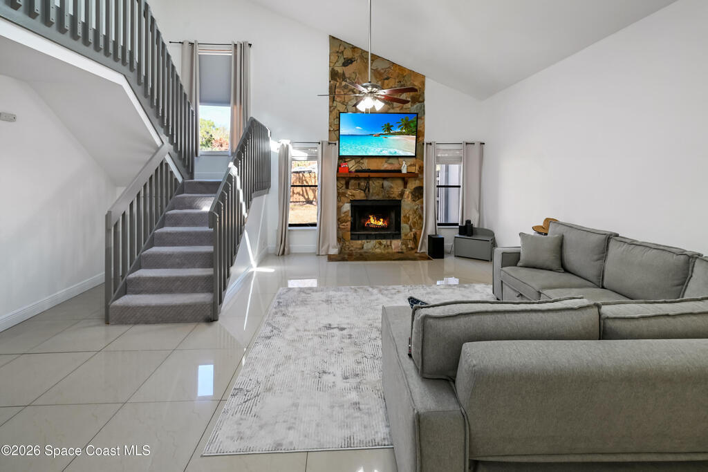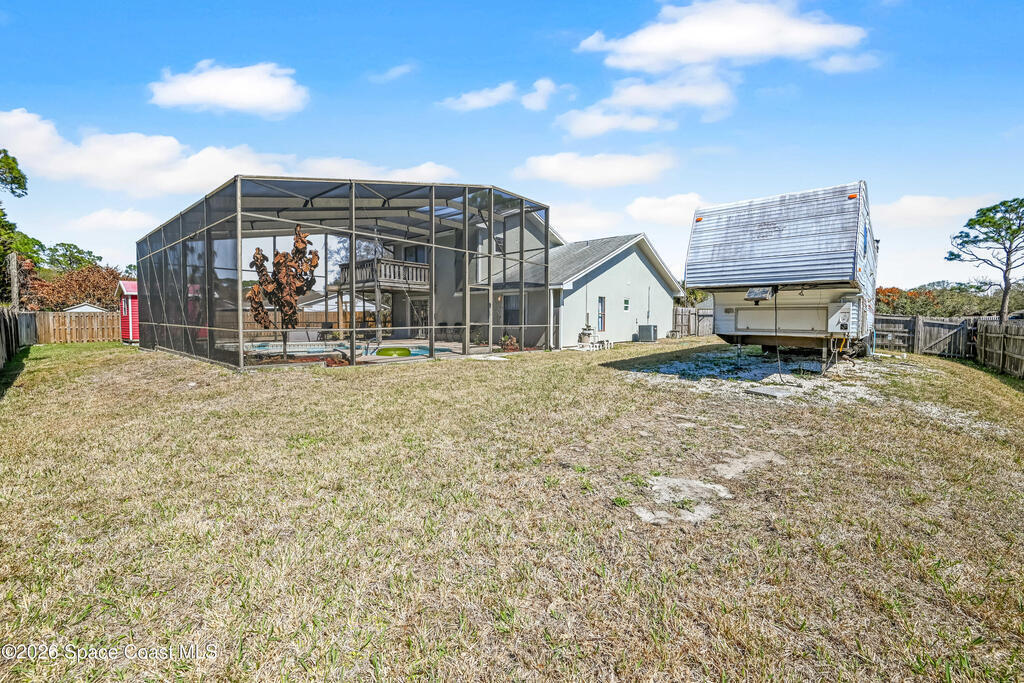 Stunning pool home in desirable Lockmar Estates, within walking distance to Lockmar Elementary School. Beautiful home features a spacious living room with a soaring vaulted ceiling & a striking floor-to-ceiling stone fireplace. The kitchen offers an island, pantry, tile backsplash, and French doors leading to the screened-in pool. The dining area includes a charming bay window. Tile flooring runs throughout the downstairs, with laminate wood flooring in the bedrms and bathrm. Downstairs bathrm has been stylishly updated & features dual sinks. Upstairs primary suite includes a private balcony overlooking the screened pool, along with a bathrm featuring a dual sink vanity and a walk-in closet. Enjoy a large driveway with an extension for extra parking. The red shed conveys. Situated on a spacious 0.36-acre lot, this home is ready for a new family. Conveniently located near Target, Publix, and a variety of dining, shopping, & entertainment options, w/ quick access to I-95. View today!