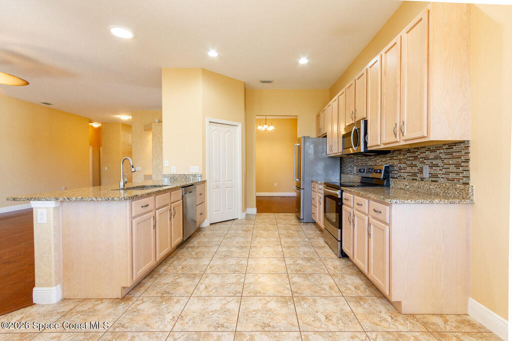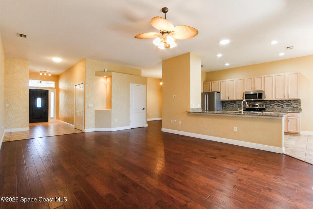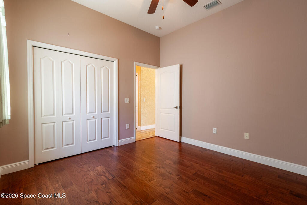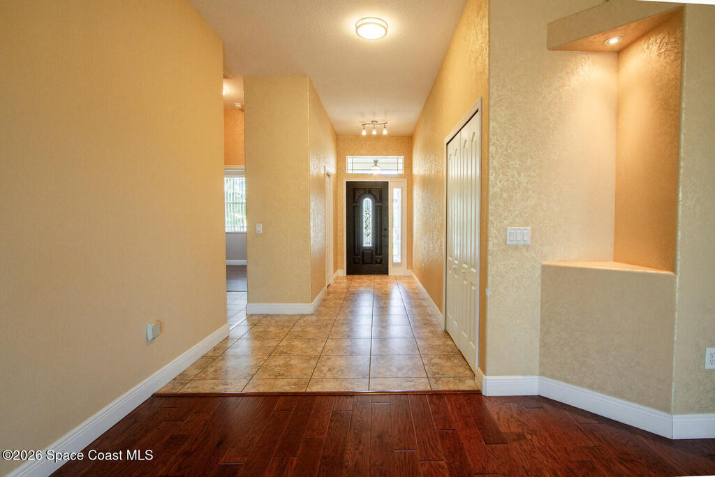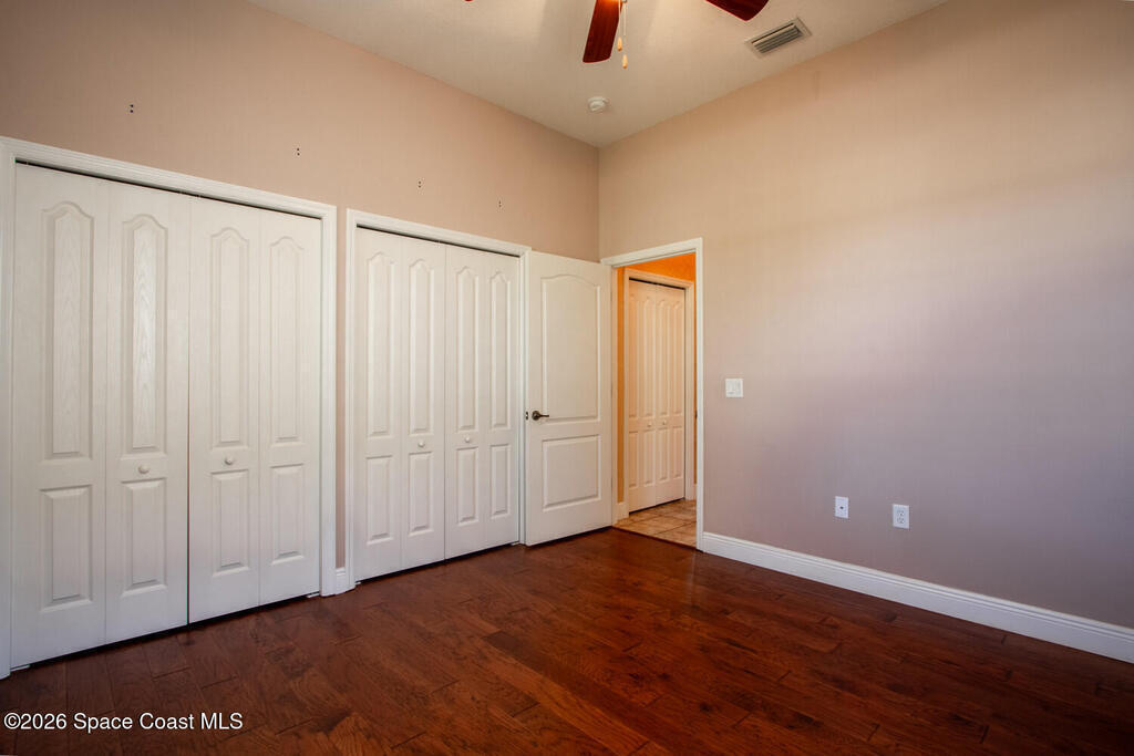 Beautifully upgraded 3BR/2BA home with 1,725 living sq ft (2,500 total) on a premium corner lot in Sisson Meadows. Light and bright open floor plan with real scraped wood flooring throughout and tile in wet areas. Eat-in kitchen features real wood cabinets, granite countertops, stainless appliances, and water views. Kitchen opens to spacious great room with sliders to tiled, screened lanai overlooking large pond and bridge. Owner's suite offers lanai access, walk-in closet, tiled shower, and double vanity. Split bedroom plan. For added security there are storm shutters for every window and door and a whole house 22 KW Generac generator, (Installed 2021) Conveniently located near shopping, the Kennedy Space Center, Interstate 95, State Road 528, the Indian River, and area beaches.