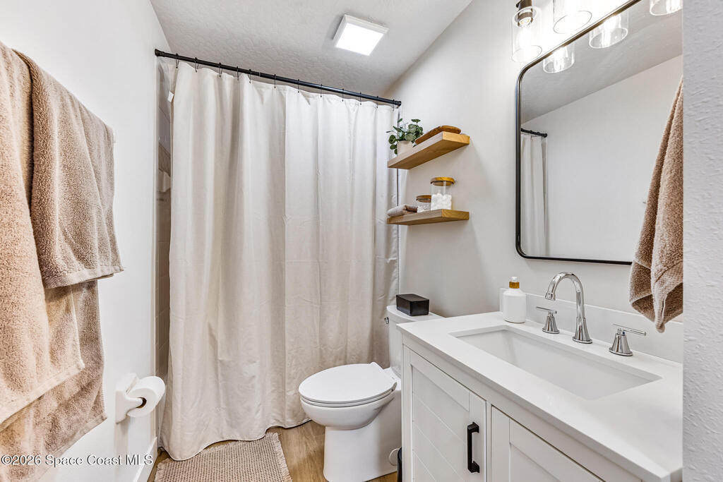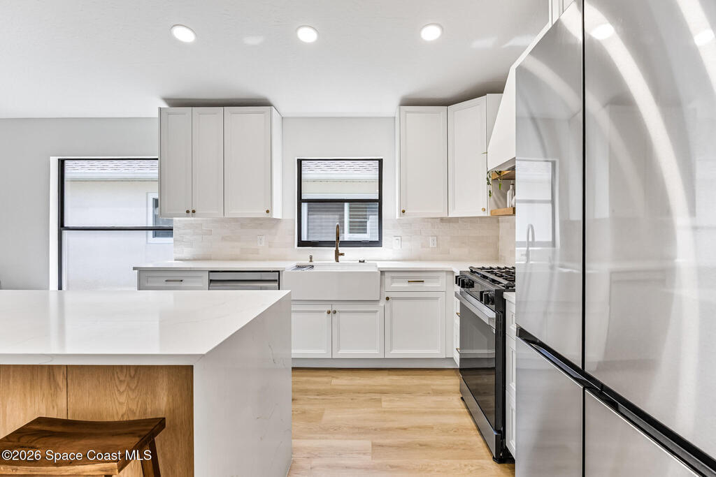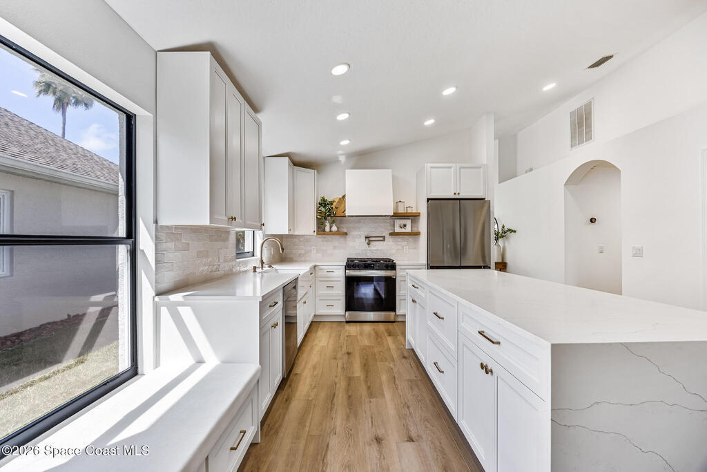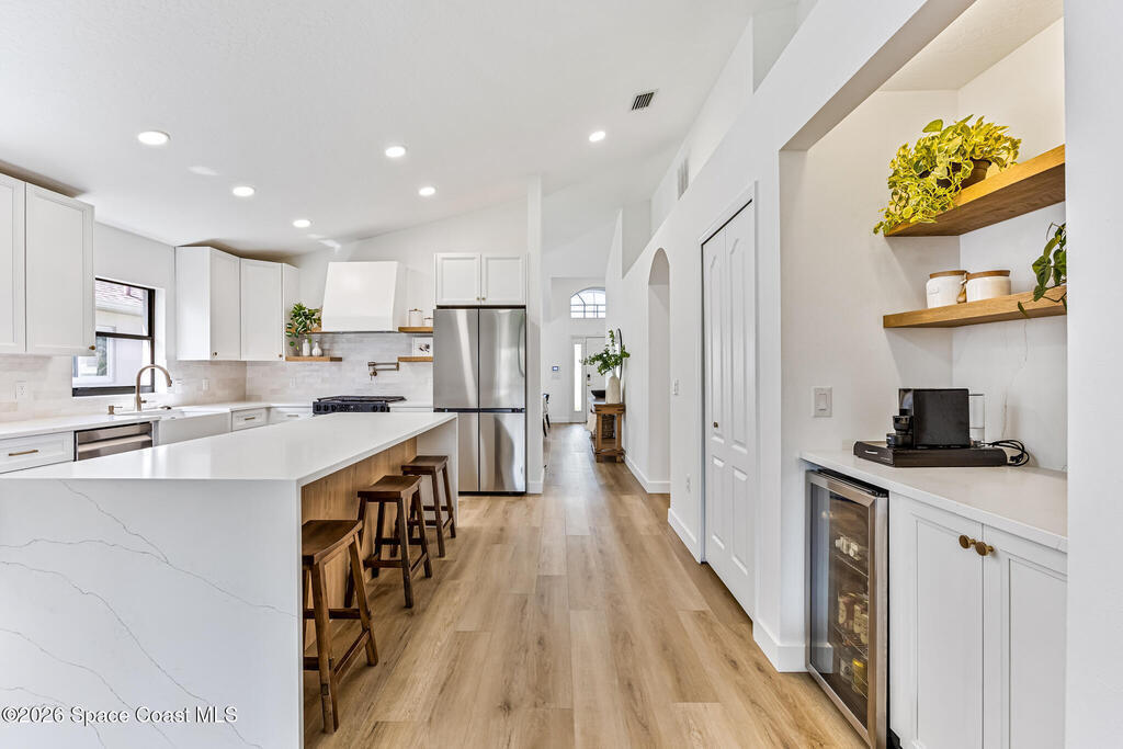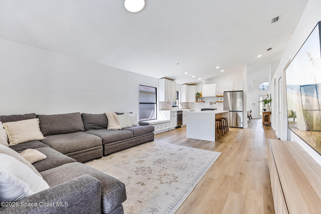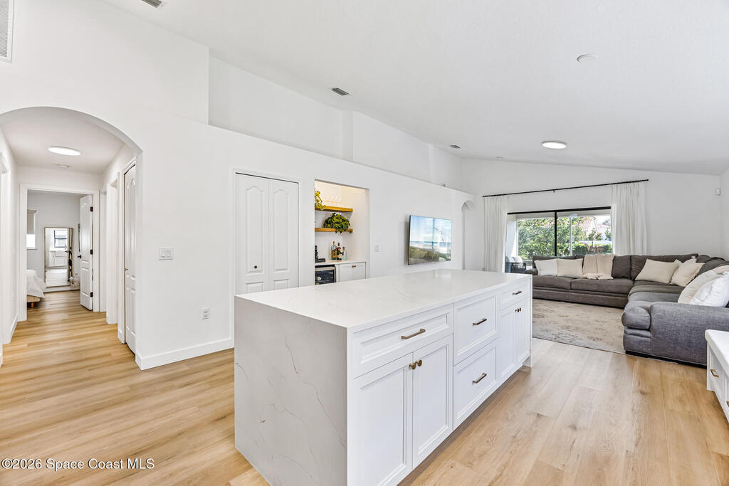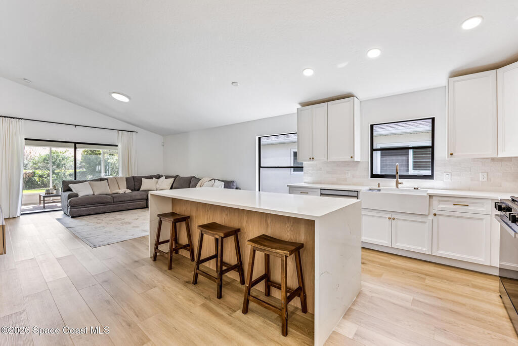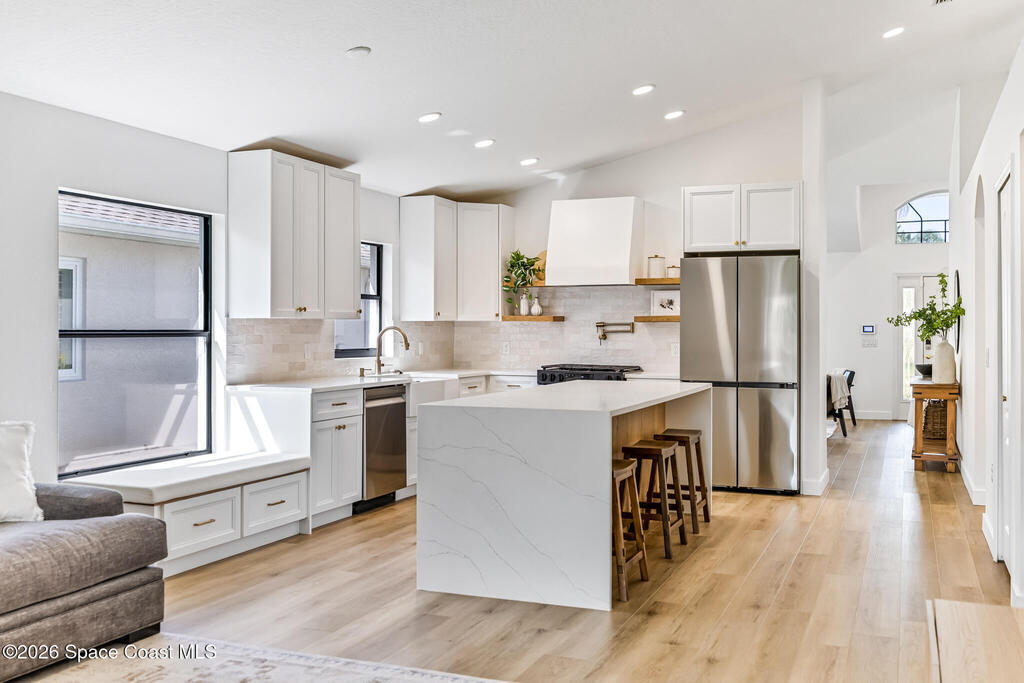 Beautifully upgraded home in Citrus Creek with modern finishes and thoughtful improvements throughout. Recent updates include new flooring, fresh interior paint, updated baseboards, door handles, outlets, light switches, stylish lighting, a new HVAC system, and electric blackout blinds in every room for comfort and privacy. The fully renovated kitchen features new cabinetry, quartz countertops, a farmhouse sink with upgraded faucet, glass rinser, pot filler, large island, brand-new appliances, and a custom bar area--perfect for entertaining. Bathrooms have been tastefully refreshed, including a guest bath with a new vanity, toilet, faucet, mirror, light fixture, and exhaust fan, and an updated primary bath with new faucets, lighting, and exhaust fan. The spacious primary bedroom also offers a versatile bonus room ideal for a home office or nursery. Water filtration system is negotiable. Nursery pendant light and entry macrame light do not convey.