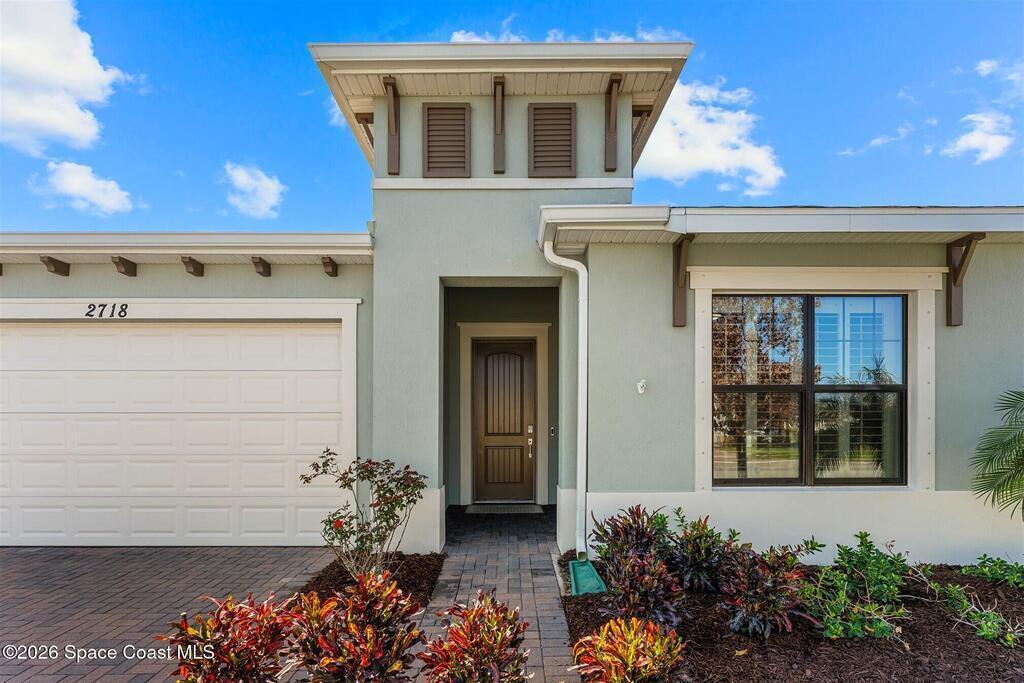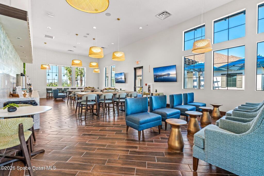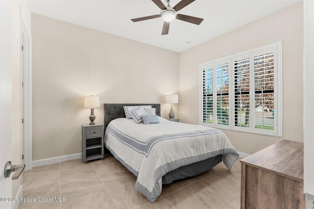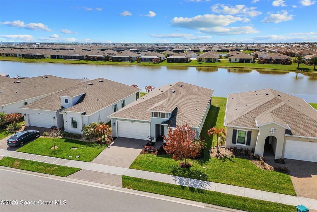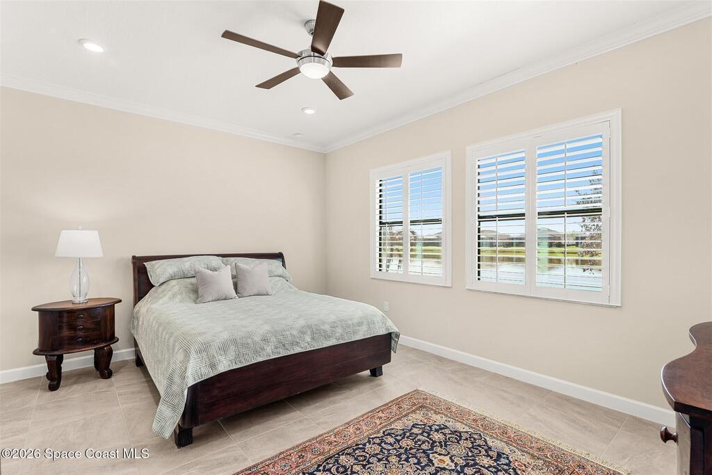 Enjoy waterfront living from this airy 3-bedroom, 4-bath home in the gated 55+ community Bridgewater at Viera. A den/flex room with double doors and closet can easily serve as a fourth bedroom. The kitchen features stainless steel appliances, and an oversized island that opens to the main living area. Triple sliding glass doors fill the home with natural light and lead to a screened lanai overlooking the water--perfect for enjoying both sunrise and sunset. Interior highlights include ceramic tile flooring, plantation shutters, crown molding, recessed LED lighting, upgraded fixtures, and a laundry room with sink and built-in cabinets. The primary suite offers a custom walk-in closet, zero-entry shower, and dual vanities. Guest bedrooms include custom closets and en-suite baths, one with a walk-in Jacuzzi tub. Resort-style amenities include heated pool, fitness center, tennis, pickleball, bocce, billiards, movie theater. HOA includes lawn care, garbage, gated security.