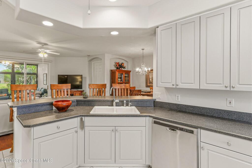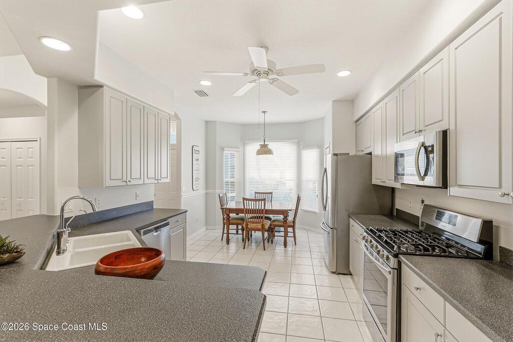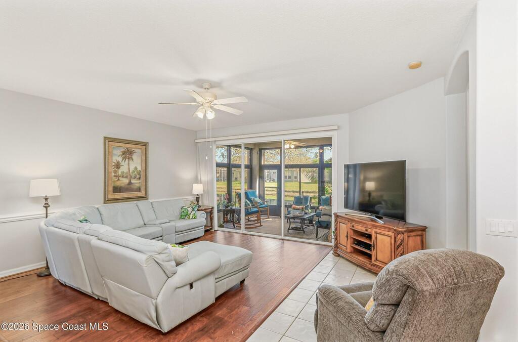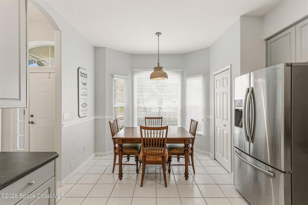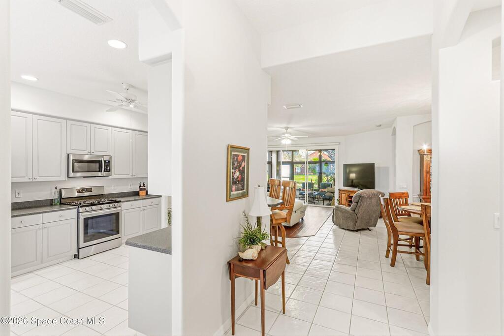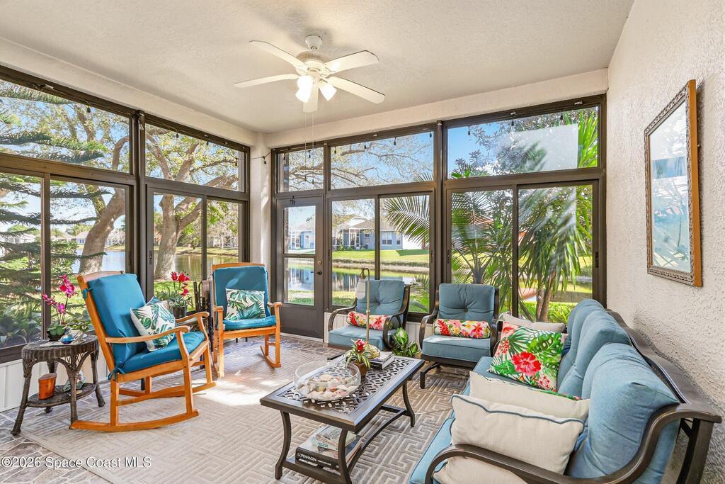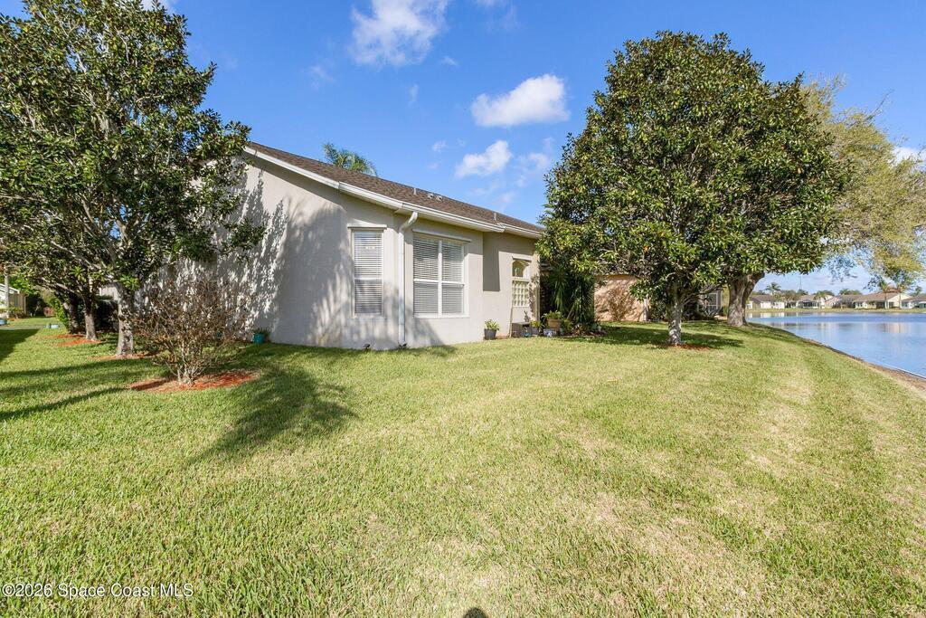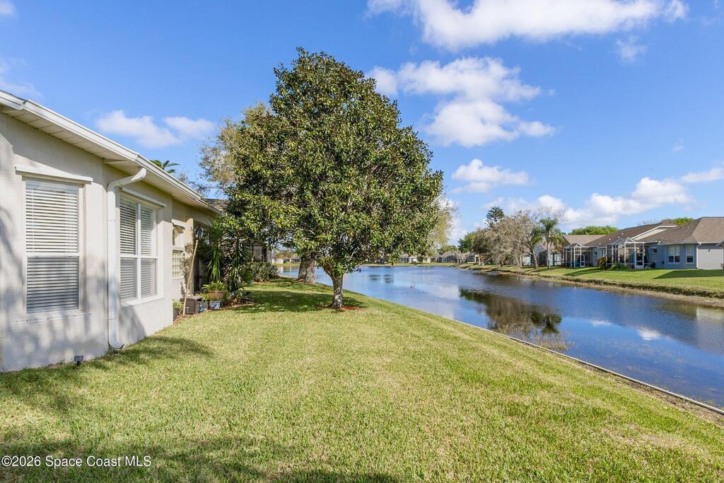 Welcome to easy living in the gated community of Summit at Sawgrass in Suntree, where the HOA handles lawn care so you can spend more time enjoying life on Florida's Space Coast. Situated on a waterfront lot, this home offers peaceful water views from the primary bedroom and screened lanai/Florida room--ideal for morning coffee, quiet afternoons, or visiting with friends. Inside, the open-concept layout provides a neutral palette and tile and laminate flooring throughout--no carpet for easy maintenance. The spacious kitchen features stainless appliances, a gas stove, and a sunny breakfast nook. A reverse osmosis system provides purified water to both the kitchen sink and refrigerator dispenser. Additional highlights include storm shutters, an interior laundry room with utility sink, plus the washer and dryer are included. Residents enjoy a beautifully maintained neighborhood with a clubhouse, heated pool, and covered patio. Come see why life is better in the Summit at Sawgrass!