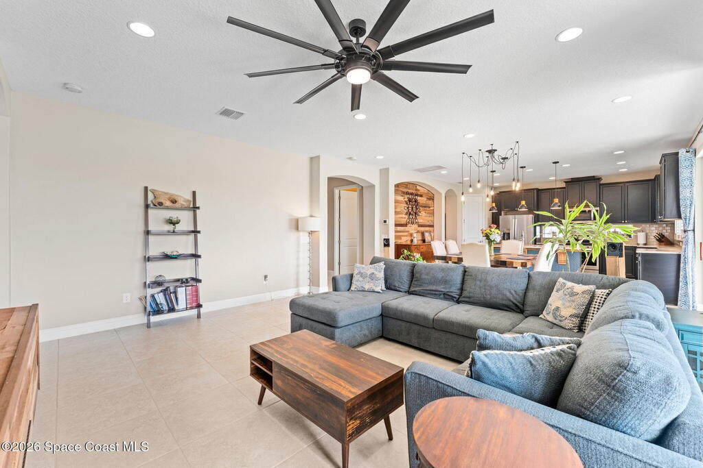 Some homes have a great floor plan. Others have a great location. This one sits on one of the most popular streets in the community and happens to deliver both. This lakefront 5 bedroom, 4.5 bath home brings together space, style, and personality in all the right places. The open layout flows into a spacious eat in kitchen with breakfast bar, center island, and a custom pallet wood archway wall that adds serious character. A flexible formal dining space can easily function as an office, playroom, or creative zone. The downstairs bedroom with private en suite is perfect for guests or multi generational living. Plantation shutters, updated fixtures, and tinted upper windows add comfort throughout. The oversized garage is fully air conditioned and ready to become your dream workshop, gym, gear hub, or ultimate tinkering zone. Out back, the lakefront lanai with natural gas hookup is made for grilling and sunset evenings. Includes access to the Addison Village Club