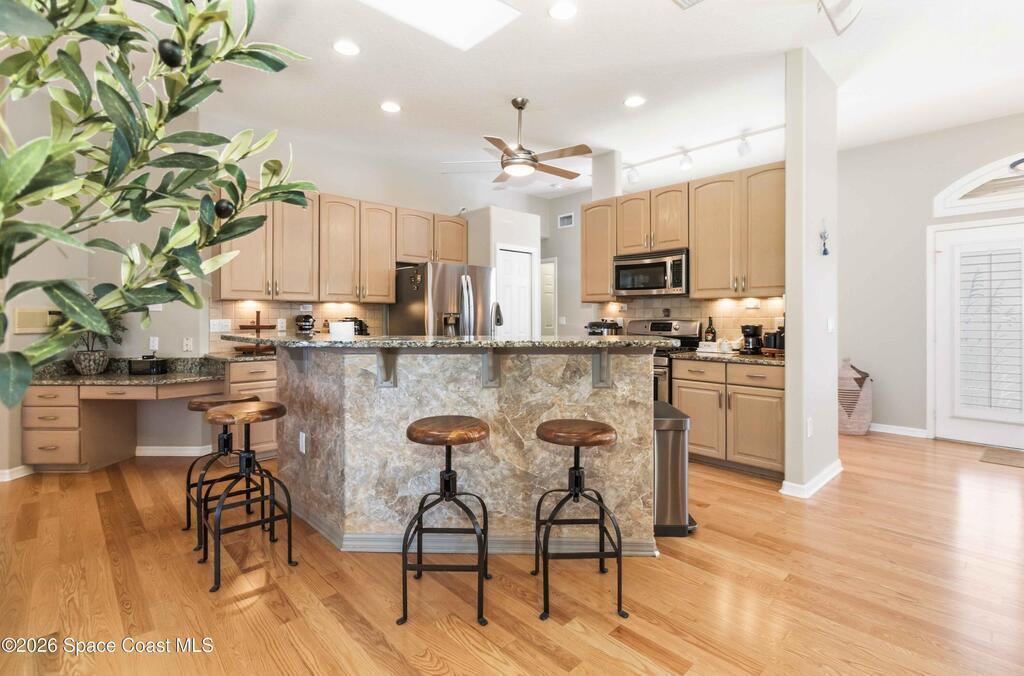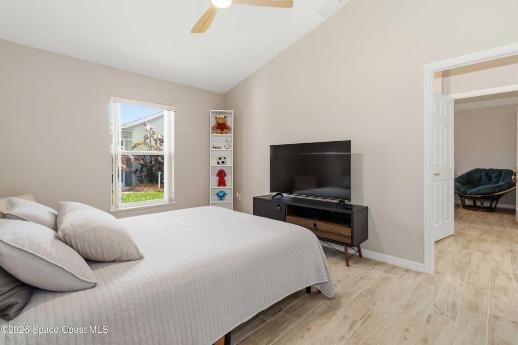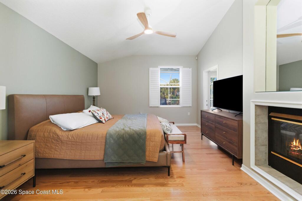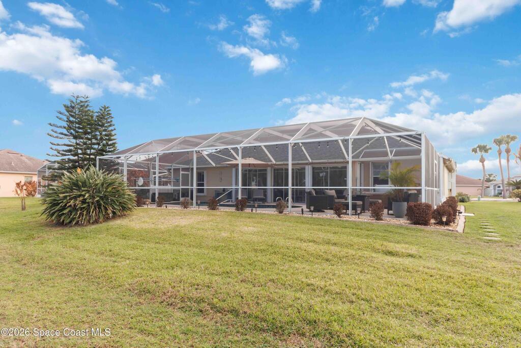 Viera East Golf Course Pool Home! This 4-bedroom, 3-bath, 2,297 sq ft home sits on the 9th fairway with golf and water views. Enjoy a heated saltwater pool with stone waterfall, screened lanai, above-ground hot tub, and enclosed Florida room with sliding glass doors for year-round comfort. Inside, the open floorplan features tile flooring, high ceilings, fireplace with built-ins, and a chef's kitchen with granite countertops, wood cabinetry, stainless steel all-gas appliances, breakfast bar, and dining nook. The primary suite boasts vaulted ceilings, dual closets, spa-style bath, and patio access. Additional upgrades include a tankless water heater, whole-home generator, split-bedroom layout, central vacuum system, and hurricane-proof windows throughout, including the garage.
