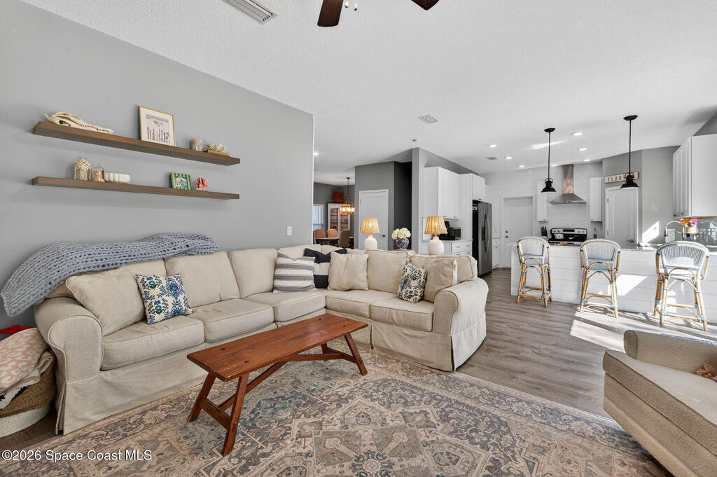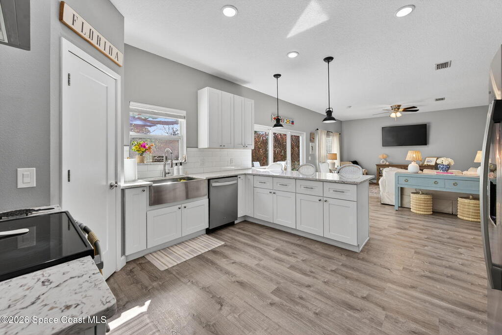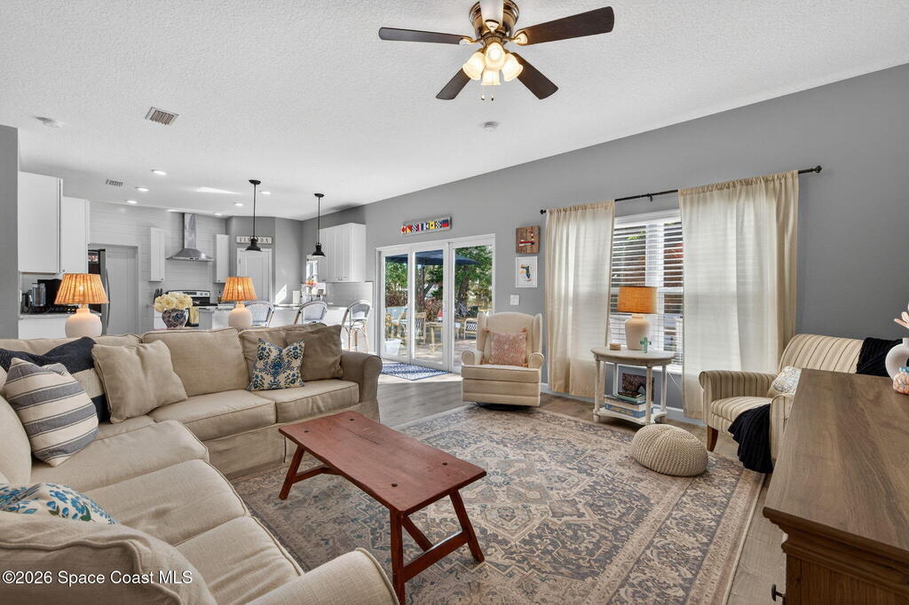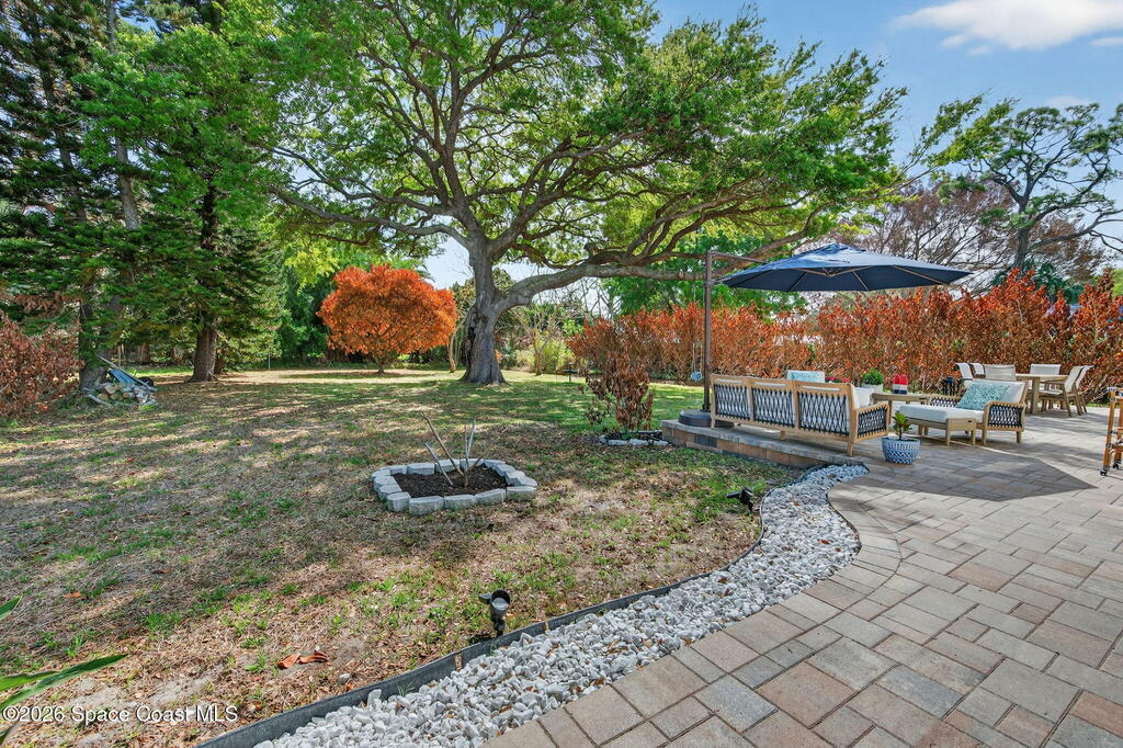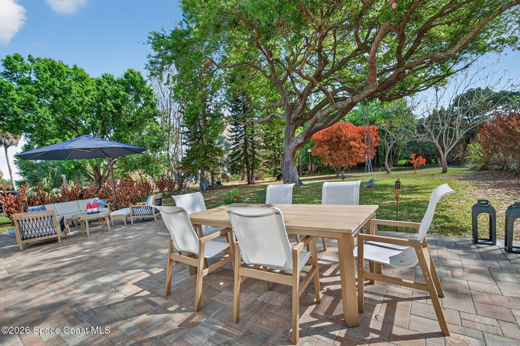 Welcome to relaxed Florida living where modern updates meet peaceful outdoor surroundings. This beautifully updated home offers a bright, open layout designed for both everyday comfort and effortless entertaining. The heart of the home is a stunning fully renovated kitchen, featuring quartz countertops, shaker cabinetry, stainless steel appliances, and a spacious island with seating -- perfect for gathering with family and friends. Abundant natural light and clean coastal finishes create a fresh, inviting atmosphere throughout the living spaces. Large sliding glass doors open seamlessly to an expansive paver patio and outdoor living area, extending the home outdoors and providing the ideal setting for dining, relaxing, or enjoying quiet mornings under mature shade trees. The oversized backyard offers exceptional privacy and space, creating a serene retreat rarely found. The bathrooms have been thoughtfully updated with modern vanities, dual sinks, and timeless finishes that