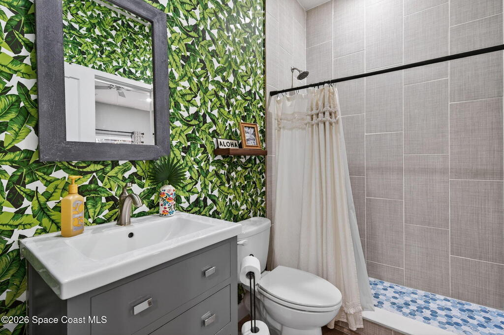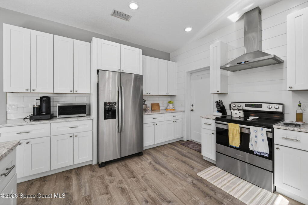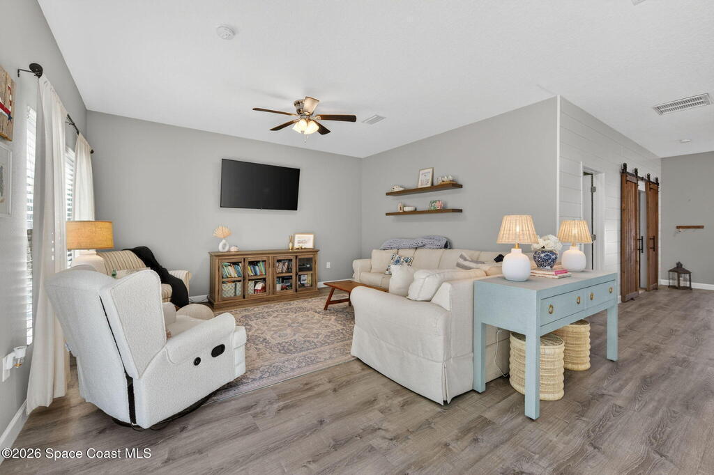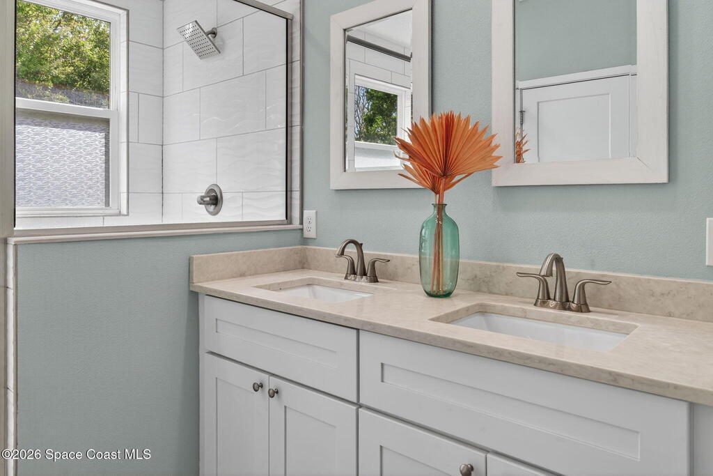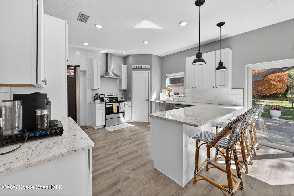 Welcome to relaxed Florida living where modern updates meet peaceful outdoor surroundings. This beautifully updated home offers a bright, open layout designed for both everyday comfort and effortless entertaining. The heart of the home is a stunning fully renovated kitchen, featuring quartz countertops, shaker cabinetry, stainless steel appliances, and a spacious island with seating -- perfect for gathering with family and friends. Abundant natural light and clean coastal finishes create a fresh, inviting atmosphere throughout the living spaces. Large sliding glass doors open seamlessly to an expansive paver patio and outdoor living area, extending the home outdoors and providing the ideal setting for dining, relaxing, or enjoying quiet mornings under mature shade trees. The oversized backyard offers exceptional privacy and space, creating a serene retreat rarely found. The bathrooms have been thoughtfully updated with modern vanities, dual sinks, and timeless finishes that