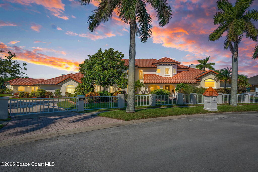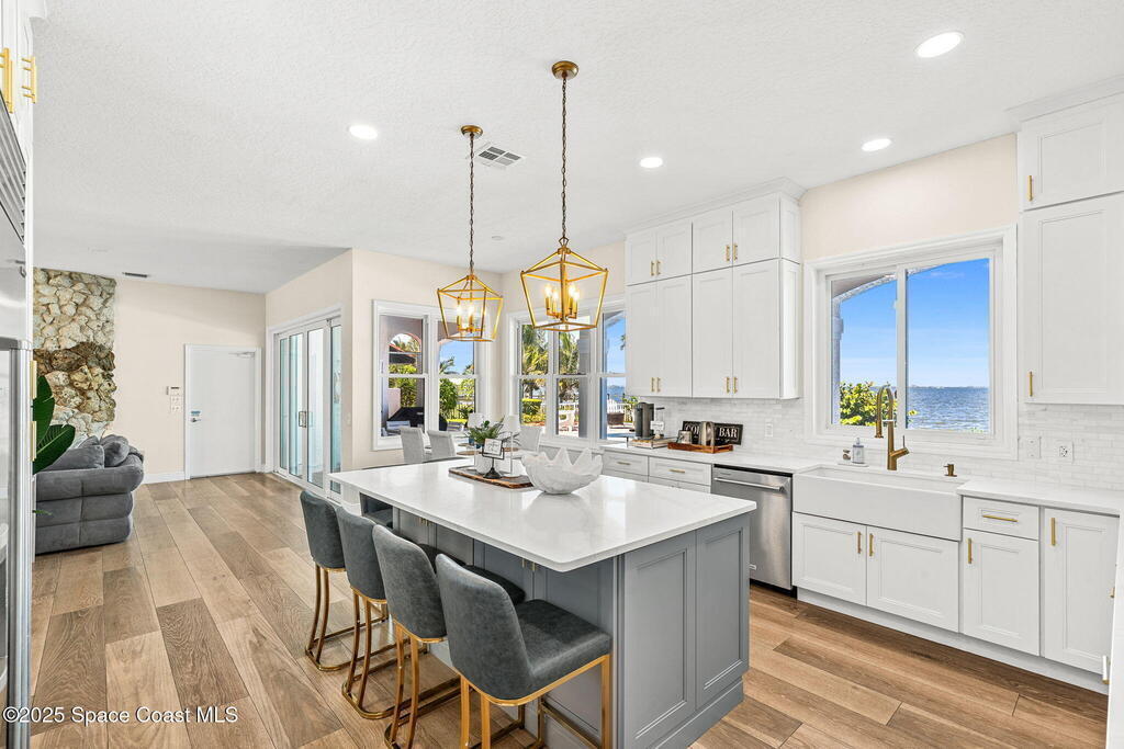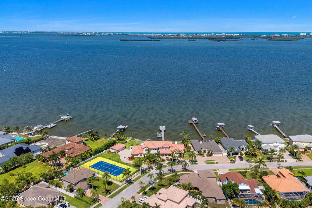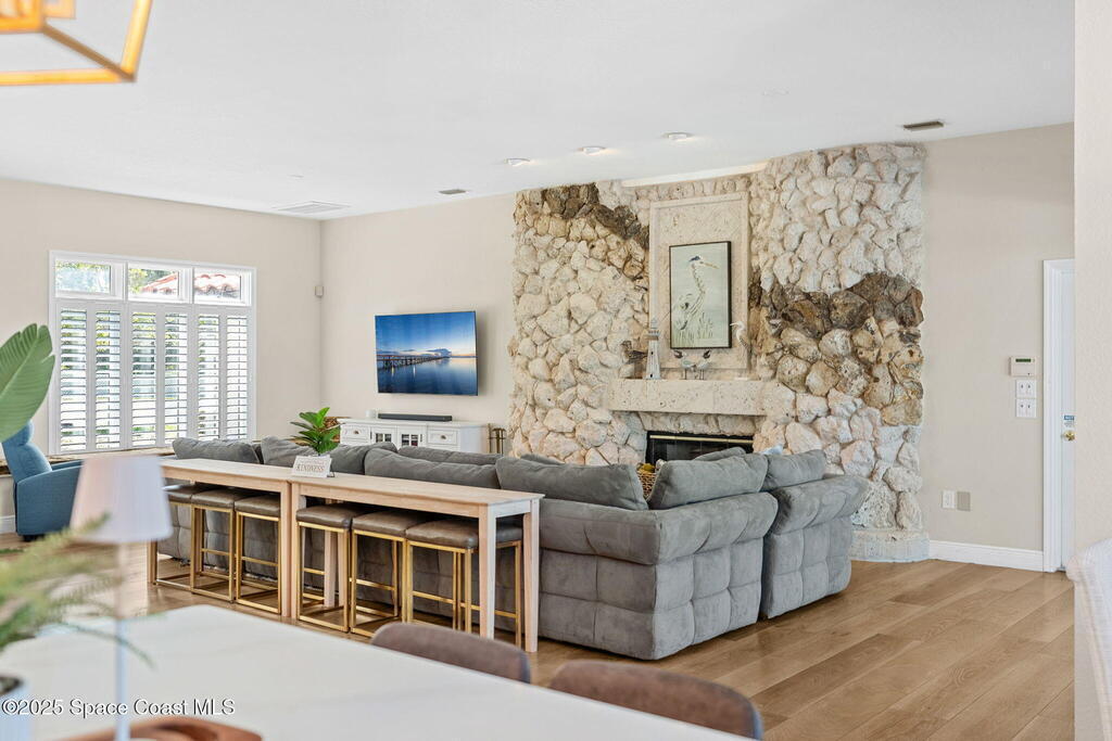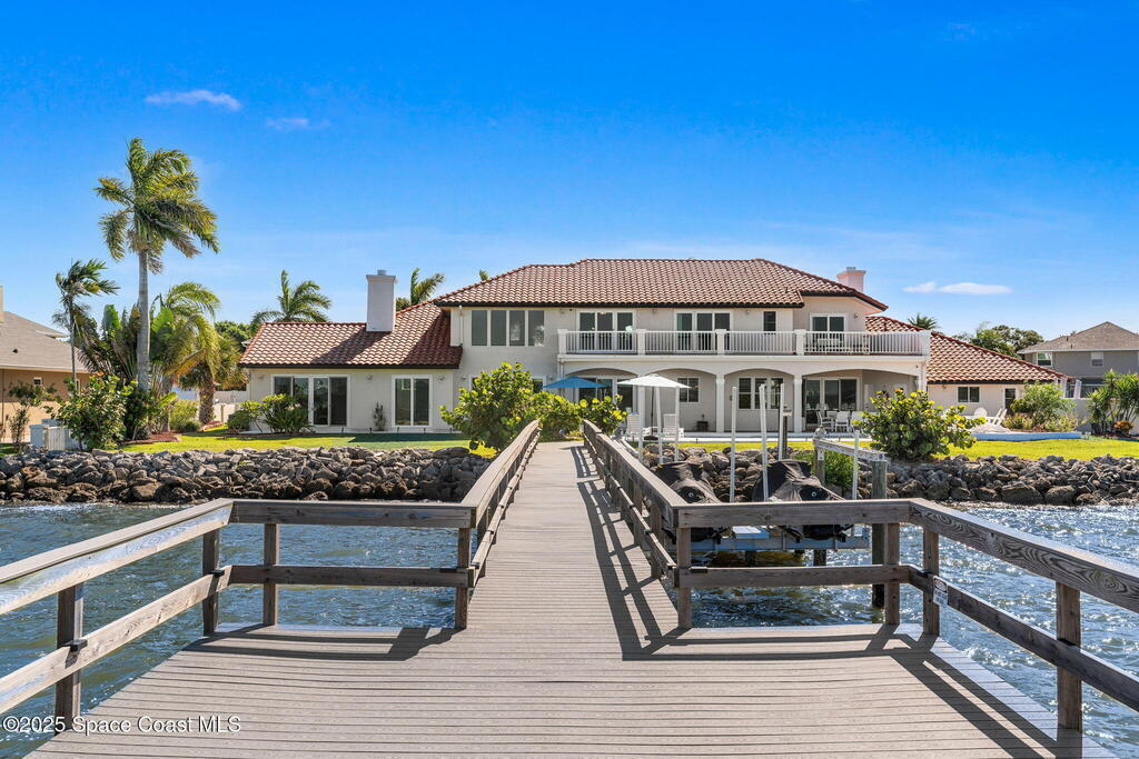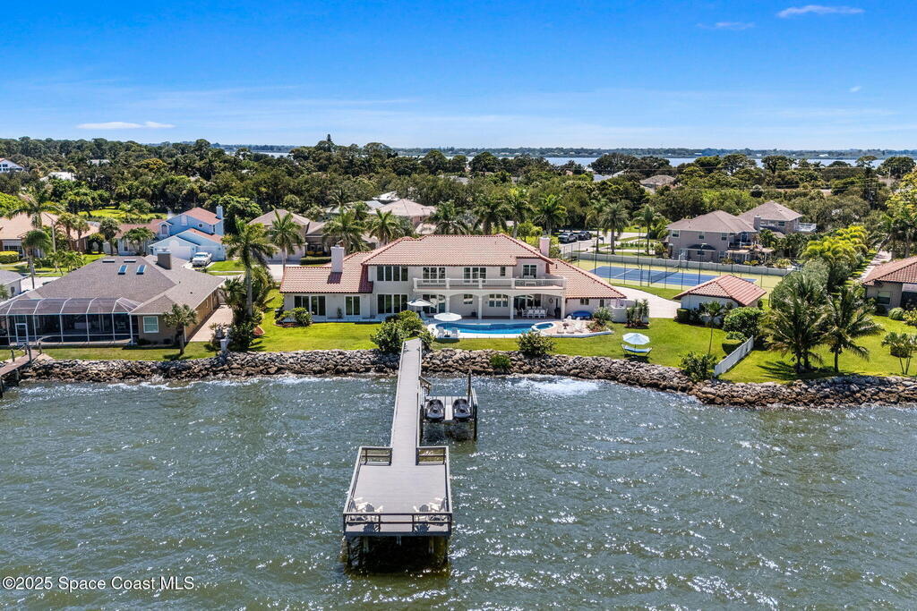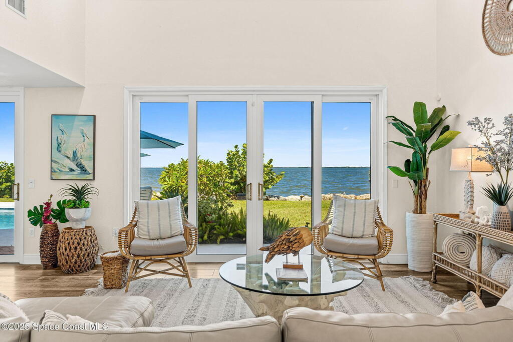 An extraordinary Space Coast luxury estate, completely reimagined in 2023 with lavish modern upgrades, offering the perfect blend of sophistication and coastal living. Set on 141 feet of elevated Intracoastal shoreline, this deep water sanctuary delivers sweeping river views, with dolphins playing nearby, manatees gliding past, and spectacular rockets launching into the sky. Floor-to-ceiling impact glass fills the home with natural light and frames the ever-changing water scenery, seamlessly connecting indoor and outdoor living. At the heart of the home, a chef's gourmet kitchen features custom cabinetry, quartzite countertops, premium appliances, and designer lighting, flowing effortlessly into open-concept living and dining spaces. The downstairs primary suite is a true retreat, with a cozy sitting area, double-sided fireplace, spa-inspired bath with soaking tub, rain shower, and private sauna. 3 additional bedrooms in the main house are thoughtfully designed with elegant finishes