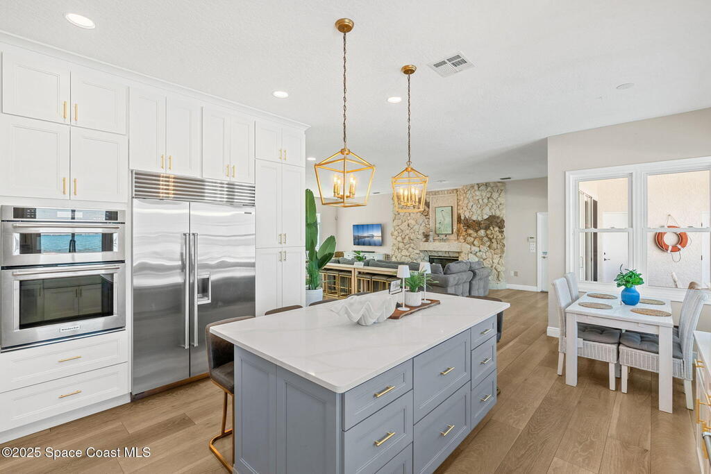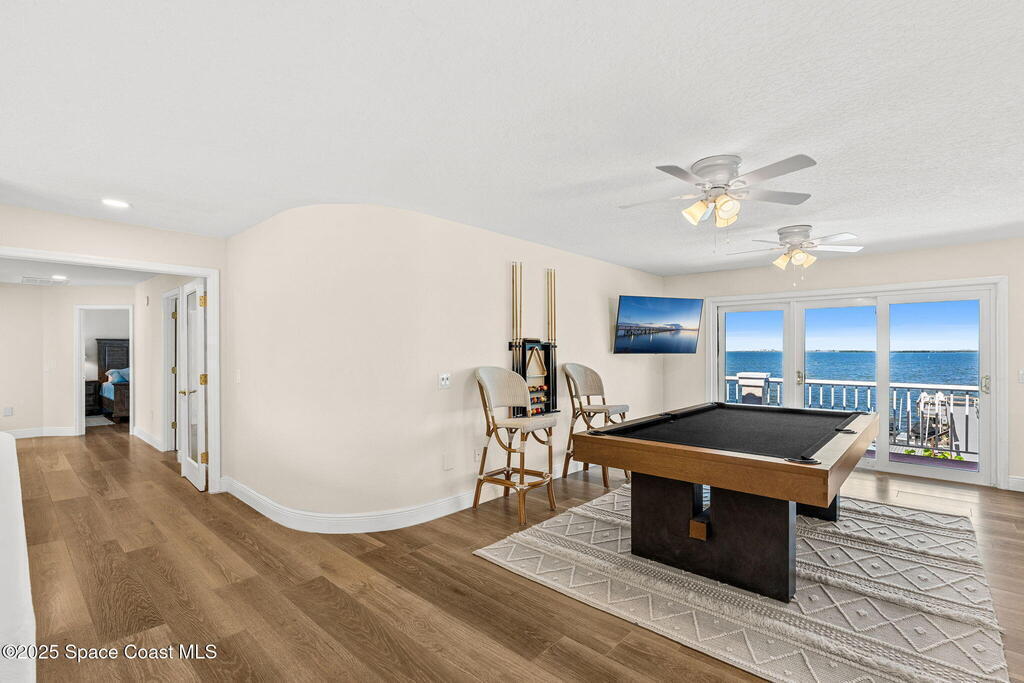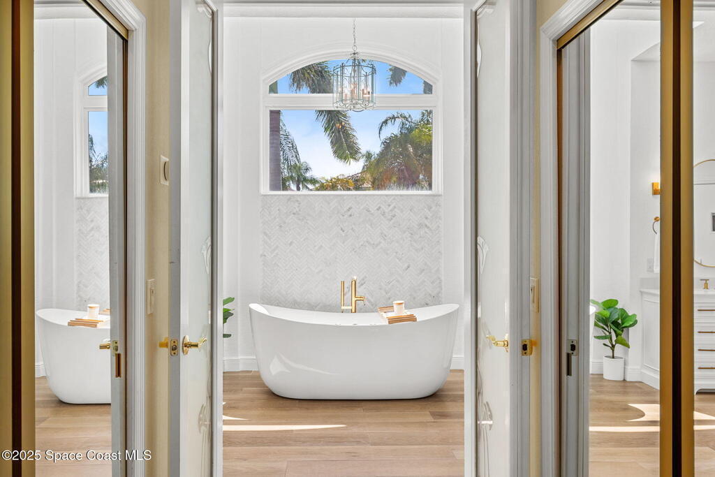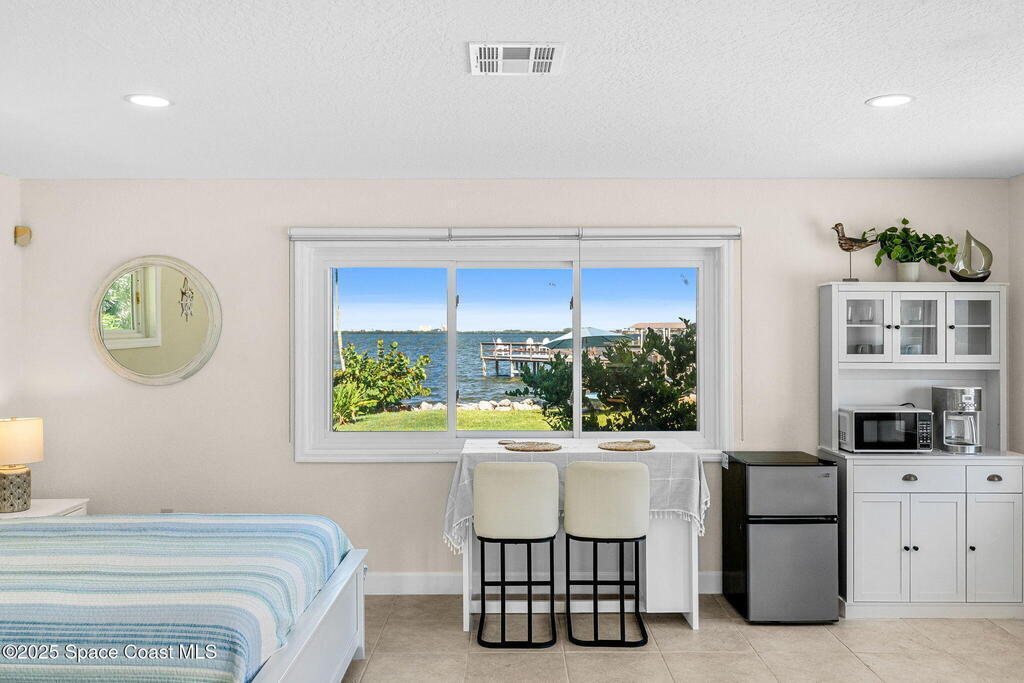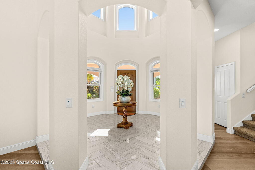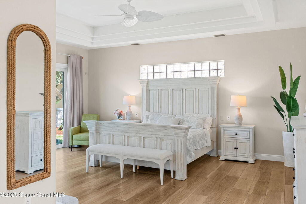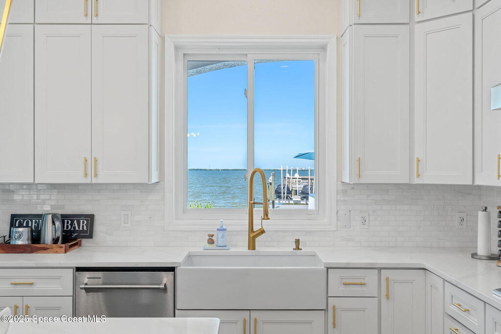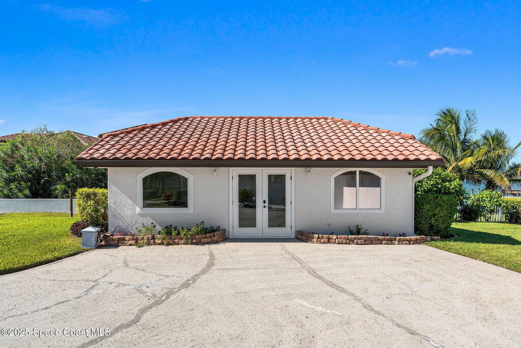 An extraordinary Space Coast luxury estate, completely reimagined in 2023 with lavish modern upgrades, offering the perfect blend of sophistication and coastal living. Set on 141 feet of elevated Intracoastal shoreline, this deep water sanctuary delivers sweeping river views, with dolphins playing nearby, manatees gliding past, and spectacular rockets launching into the sky. Floor-to-ceiling impact glass fills the home with natural light and frames the ever-changing water scenery, seamlessly connecting indoor and outdoor living. At the heart of the home, a chef's gourmet kitchen features custom cabinetry, quartzite countertops, premium appliances, and designer lighting, flowing effortlessly into open-concept living and dining spaces. The downstairs primary suite is a true retreat, with a cozy sitting area, double-sided fireplace, spa-inspired bath with soaking tub, rain shower, and private sauna. 3 additional bedrooms in the main house are thoughtfully designed with elegant finishes