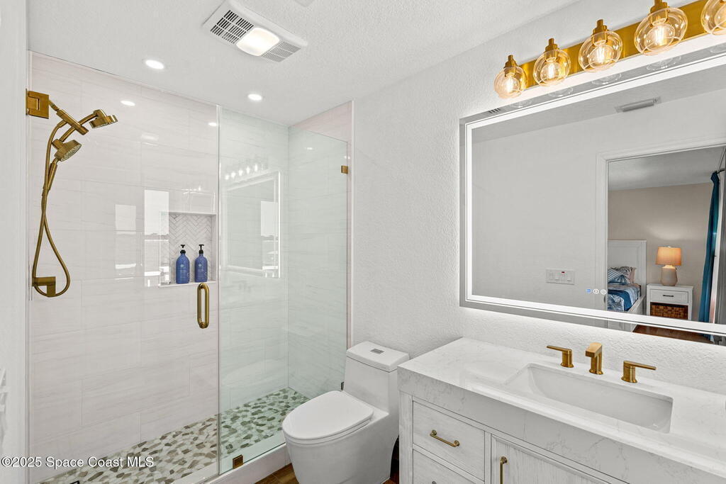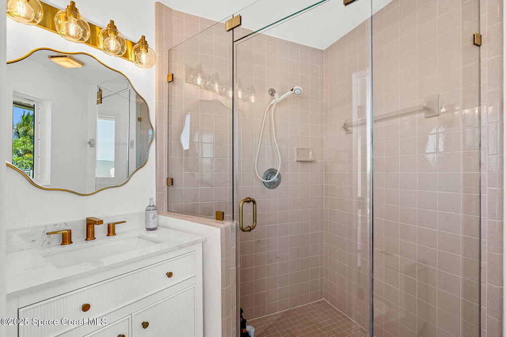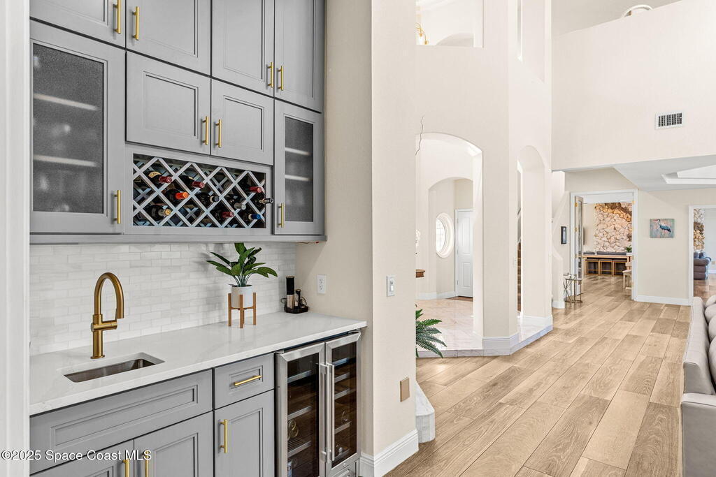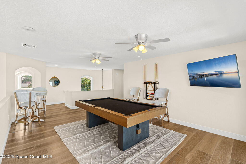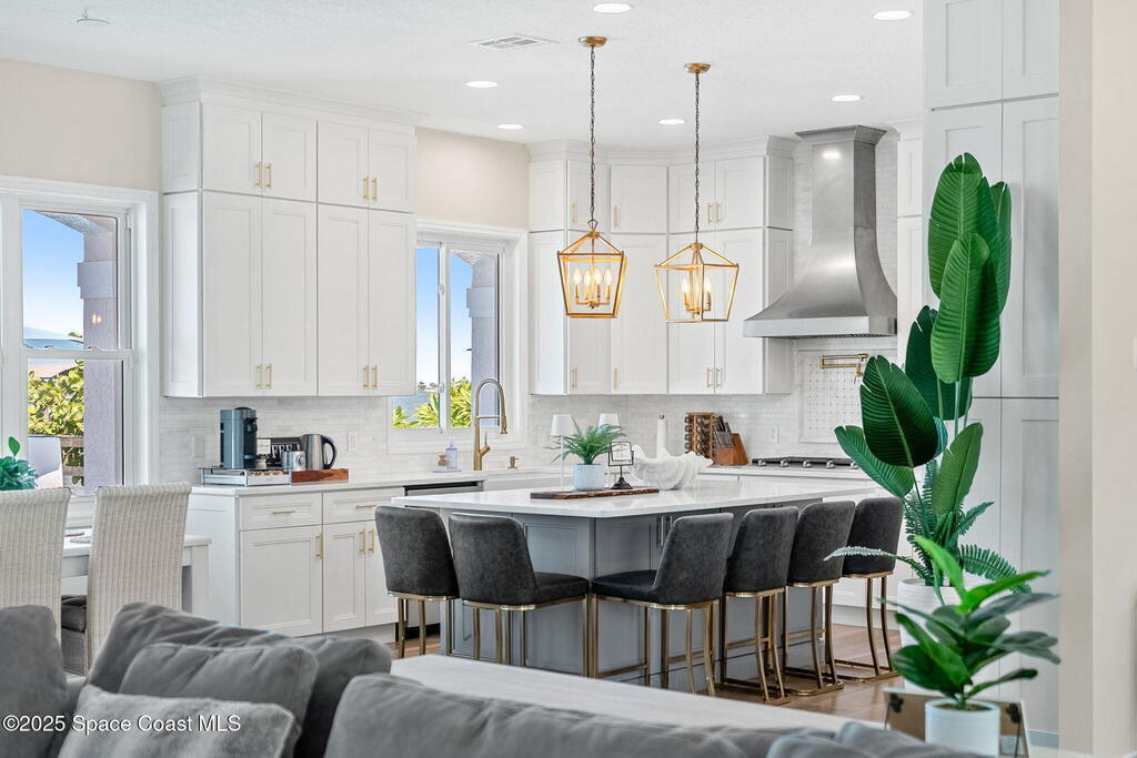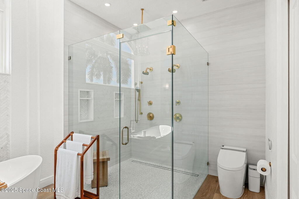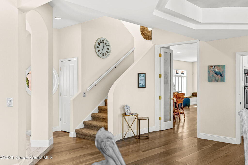 An extraordinary Space Coast luxury estate, completely reimagined in 2023 with lavish modern upgrades, offering the perfect blend of sophistication and coastal living. Set on 141 feet of elevated Intracoastal shoreline, this deep water sanctuary delivers sweeping river views, with dolphins playing nearby, manatees gliding past, and spectacular rockets launching into the sky. Floor-to-ceiling impact glass fills the home with natural light and frames the ever-changing water scenery, seamlessly connecting indoor and outdoor living. At the heart of the home, a chef's gourmet kitchen features custom cabinetry, quartzite countertops, premium appliances, and designer lighting, flowing effortlessly into open-concept living and dining spaces. The downstairs primary suite is a true retreat, with a cozy sitting area, double-sided fireplace, spa-inspired bath with soaking tub, rain shower, and private sauna. 3 additional bedrooms in the main house are thoughtfully designed with elegant finishes