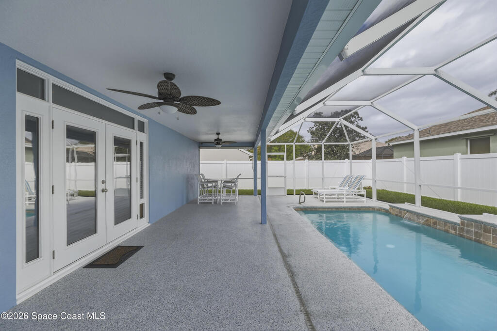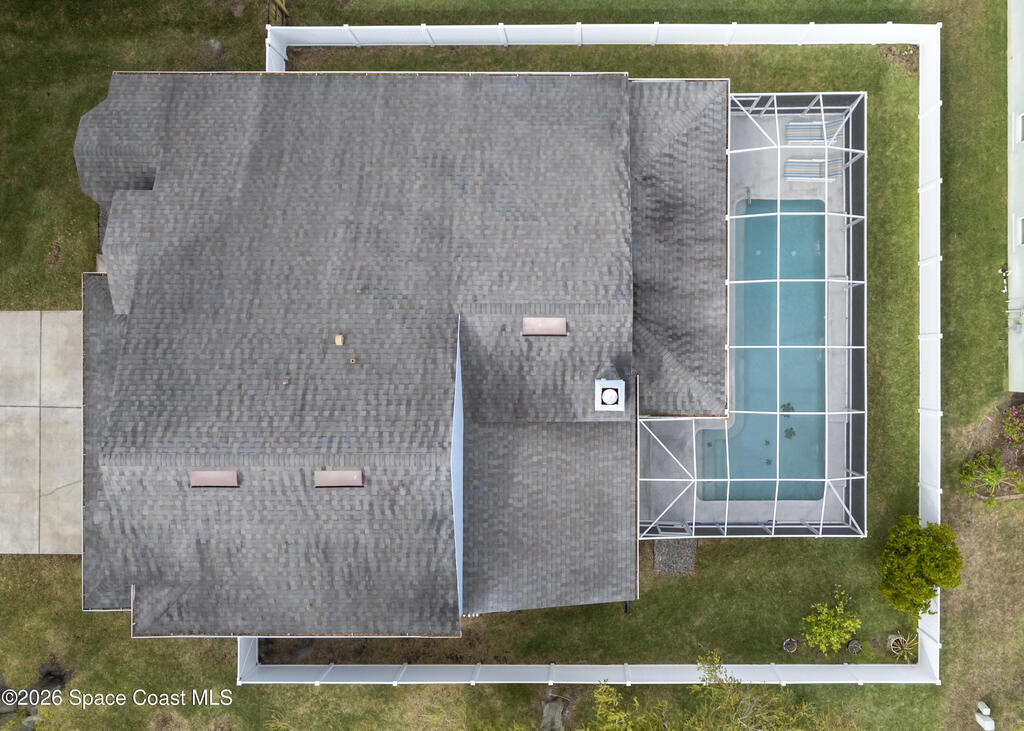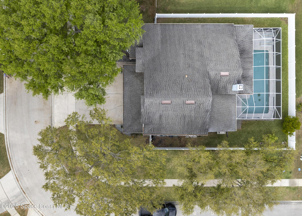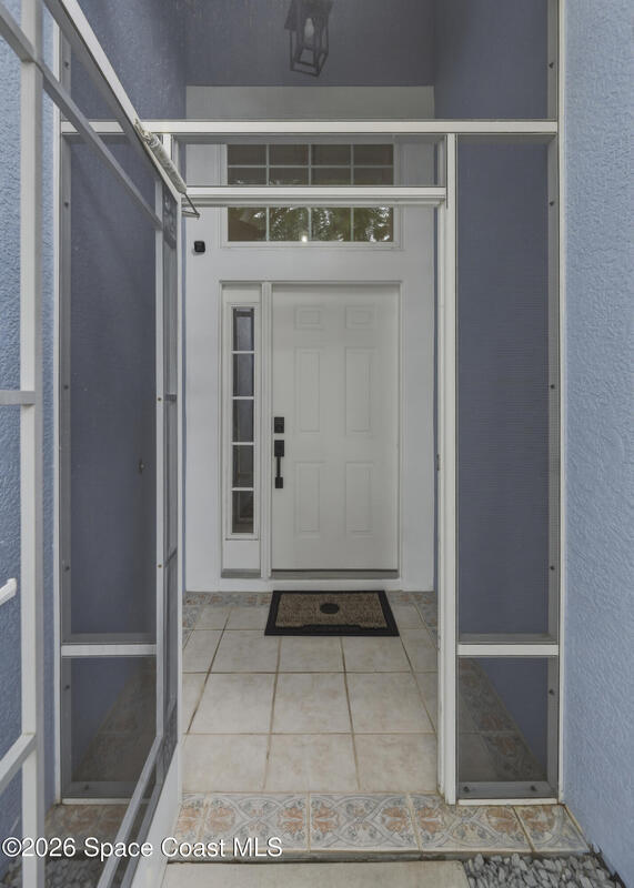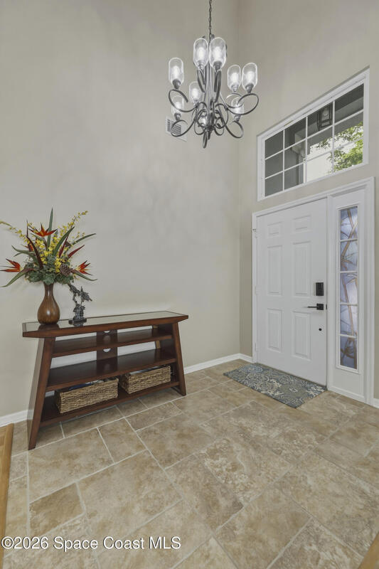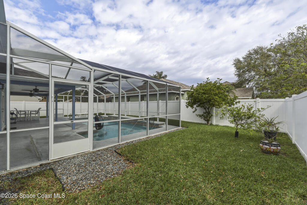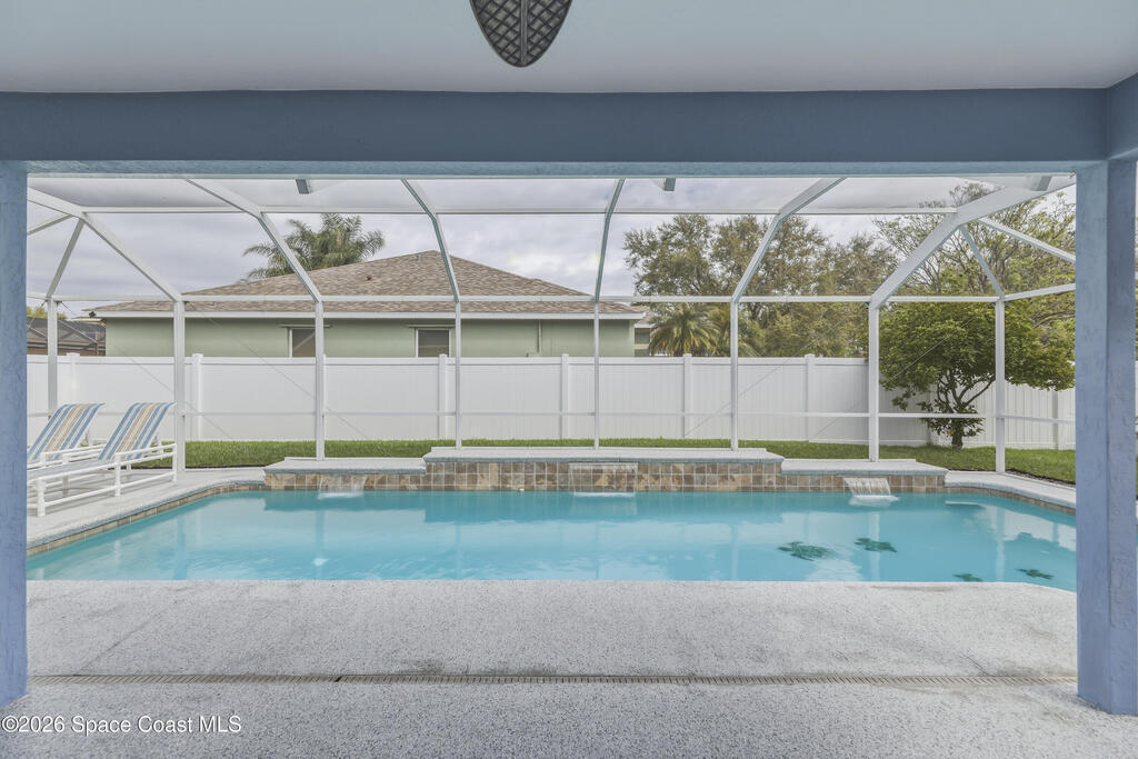 Beautiful pool home in desirable Chelsea Park on a large corner lot with a 3-car garage and private vinyl-fenced yard. The spacious family room features vaulted ceilings, a fireplace, and French doors leading to the covered lanai and screened pool--perfect for Florida living. The gourmet kitchen offers granite countertops, high-end cabinetry, and stainless steel appliances. The downstairs primary suite includes French doors to the pool and a luxurious bath with double sinks, soaking tub, and separate walk-in shower. Upstairs features three additional spacious bedrooms and a full bath.Rare VA assumable loan at 2.75%, buyer must qualify with lender. Major updates include HVAC (2021), impact windows (2021), vinyl fence (2021), pool enclosure (2021), and water heater (2022). Conveniently located near Viera shopping, dining, schools, Patrick Space Force Base, and I-95.